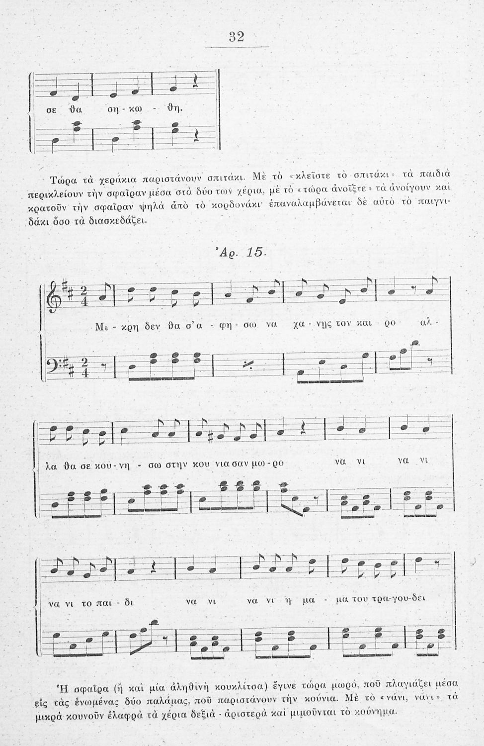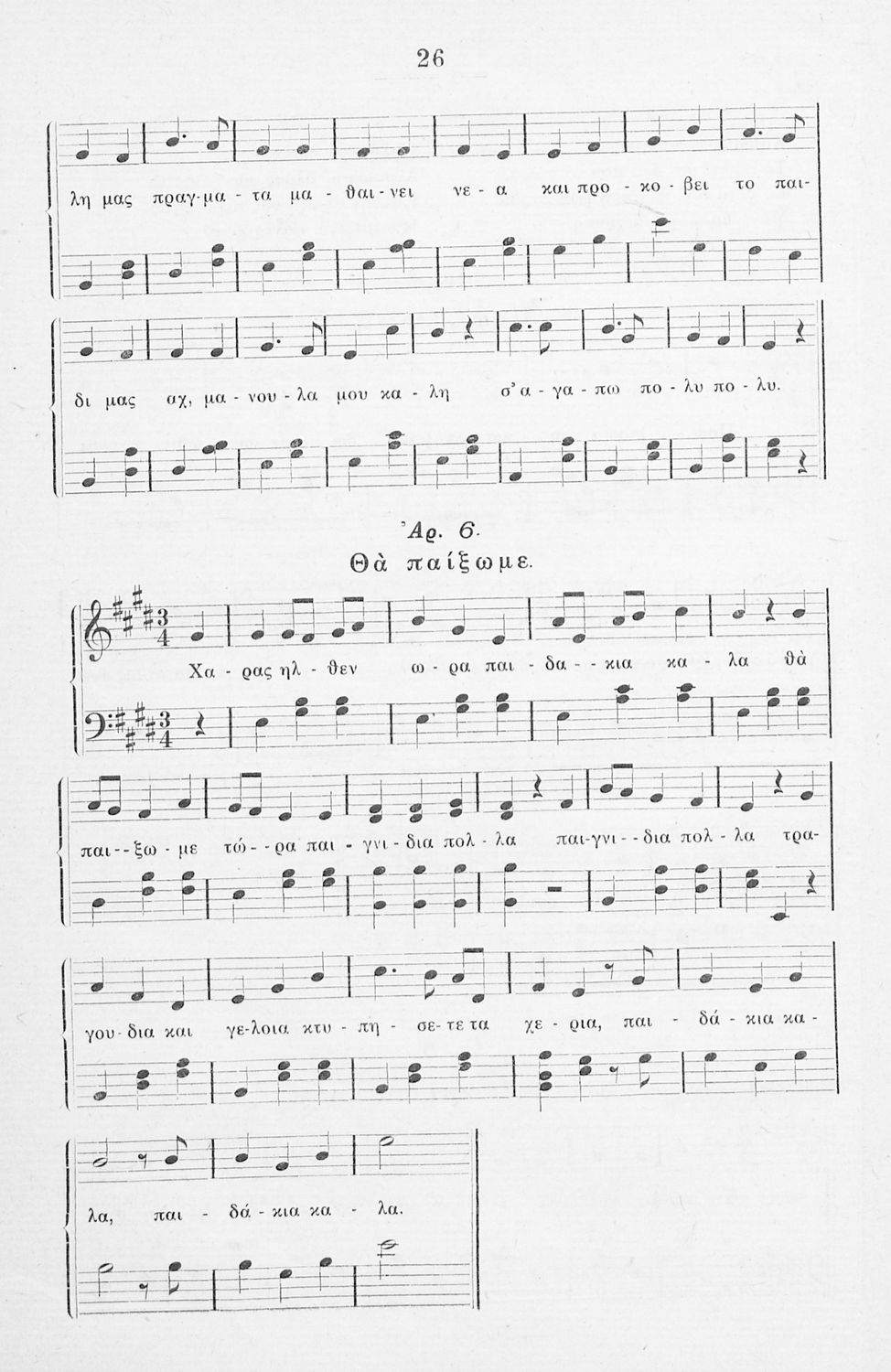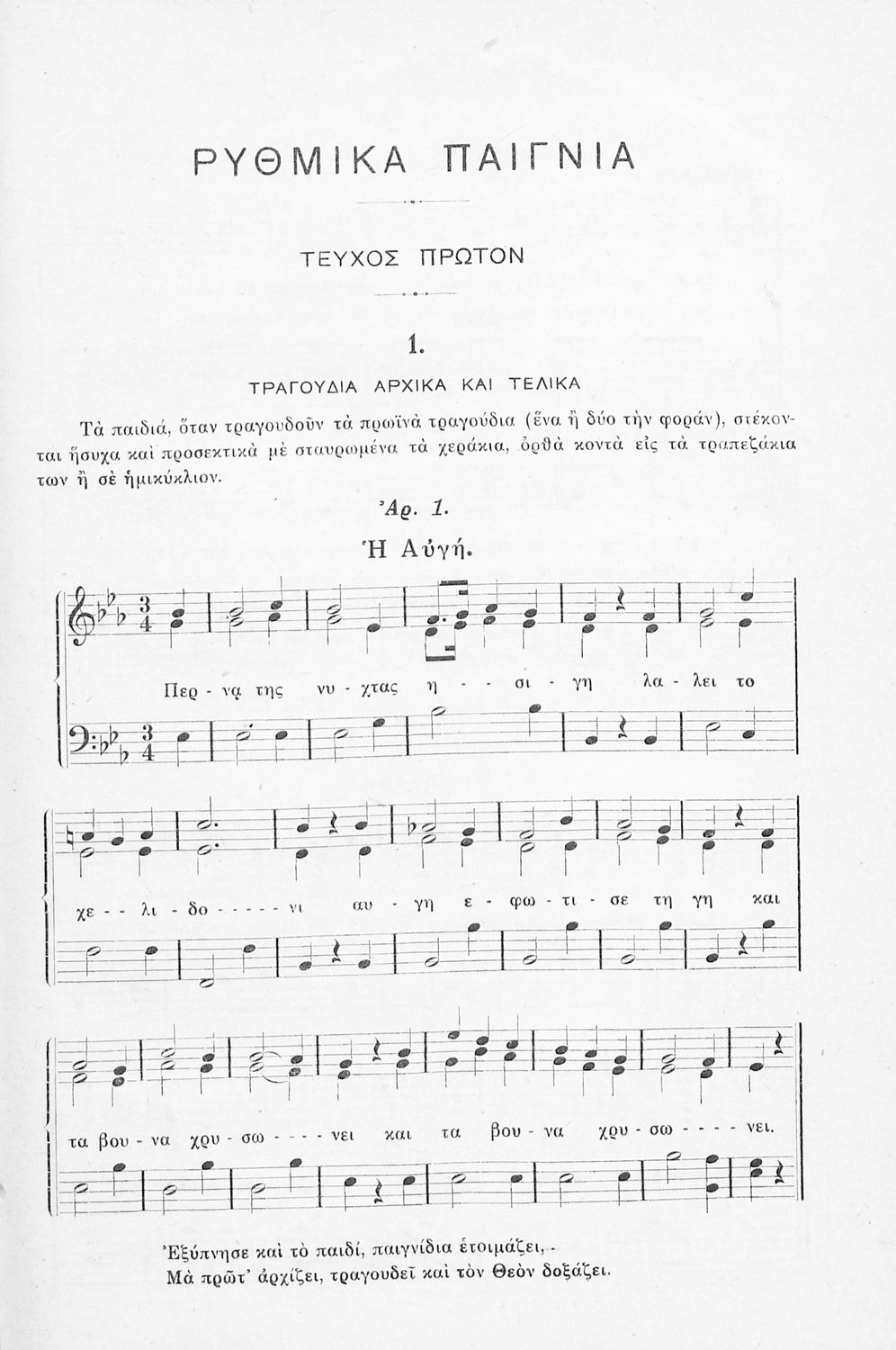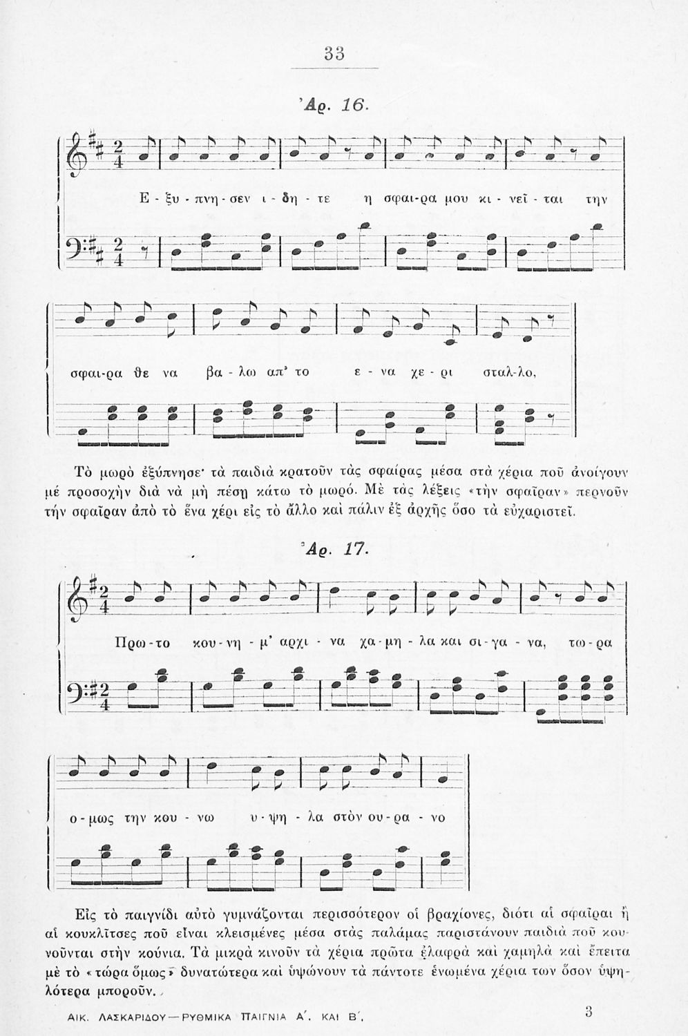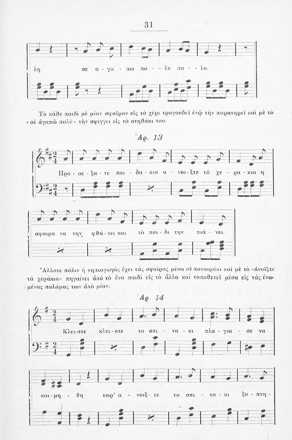 Μάθημα: Μουσική Γλώσσα: Απλή καθαρεύουσα Παρουσίαση περιεχομένου: Παιδαγωγικό βοήθημα για τις νηπιαγωγούς και τις μητέρες. Το βιβλίο είναι αφιερωμένο στη μνήμη της Αικατερίνης Λασκαρίδου και αποτελεί οδηγό για τη χρήση της μουσικής και των τραγουδιών ως εκπαιδευτικό εργαλείο μέσω της χρήσης του παιχνιδιού. Συνδέει τα τραγούδια με το παιχνίδι και τα χωρίζει σε έξι κατηγορίες παιχνιδιών. |
