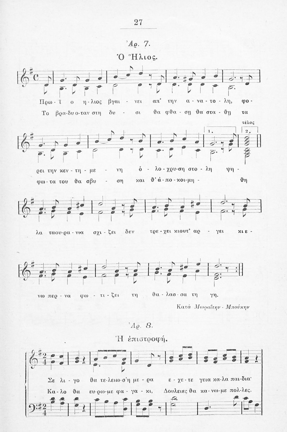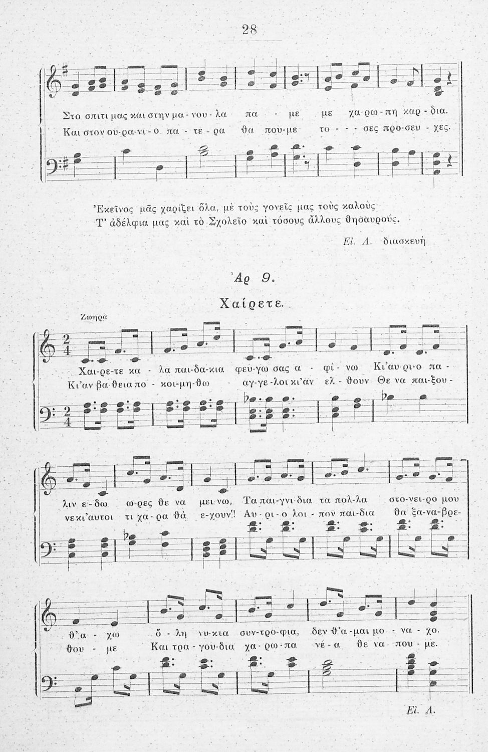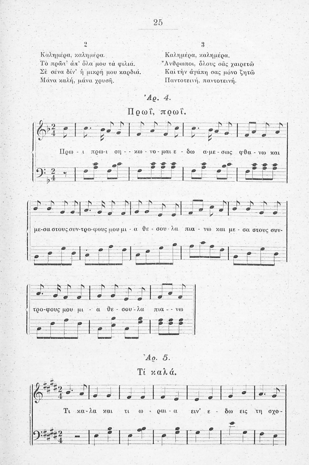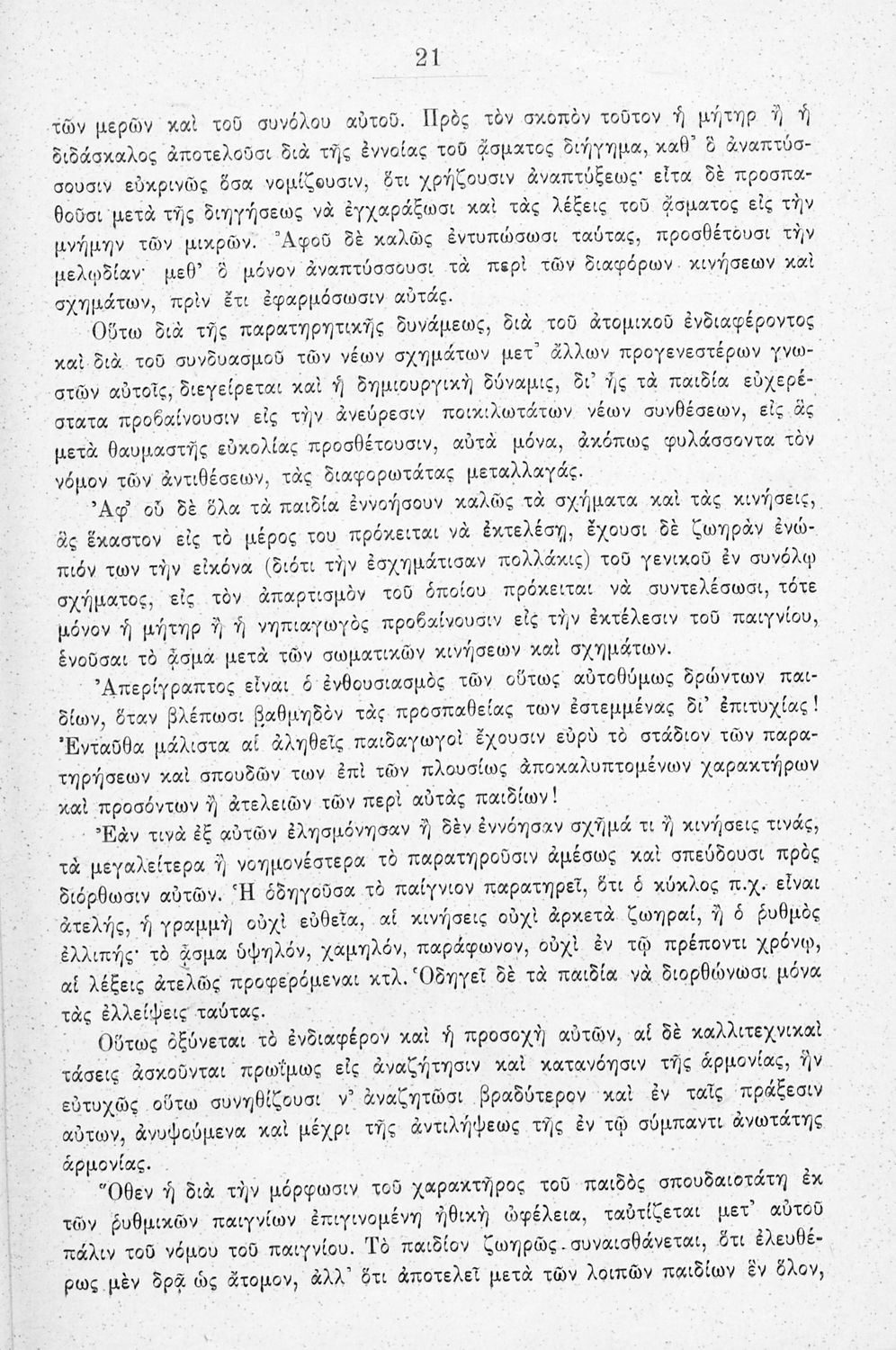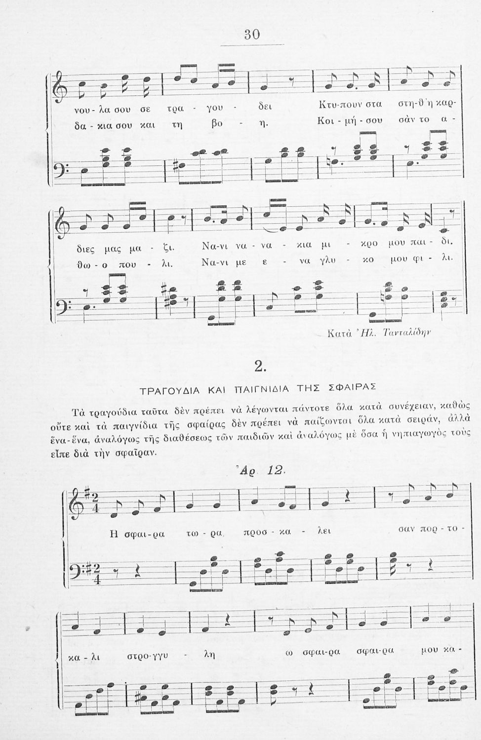 Μάθημα: Μουσική Γλώσσα: Απλή καθαρεύουσα Παρουσίαση περιεχομένου: Παιδαγωγικό βοήθημα για τις νηπιαγωγούς και τις μητέρες. Το βιβλίο είναι αφιερωμένο στη μνήμη της Αικατερίνης Λασκαρίδου και αποτελεί οδηγό για τη χρήση της μουσικής και των τραγουδιών ως εκπαιδευτικό εργαλείο μέσω της χρήσης του παιχνιδιού. Συνδέει τα τραγούδια με το παιχνίδι και τα χωρίζει σε έξι κατηγορίες παιχνιδιών. |