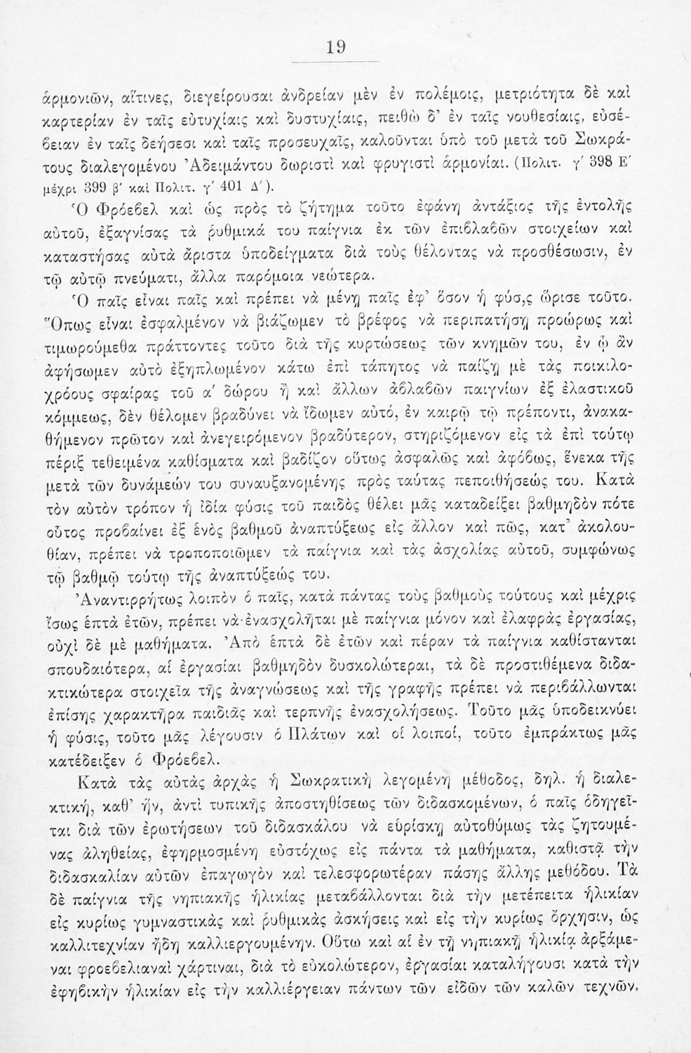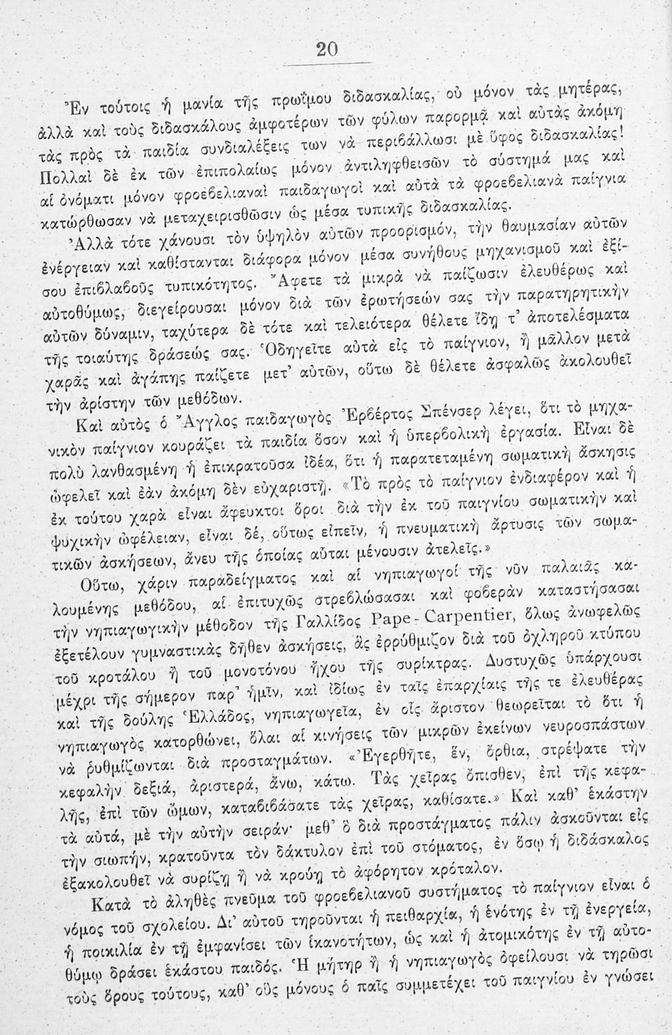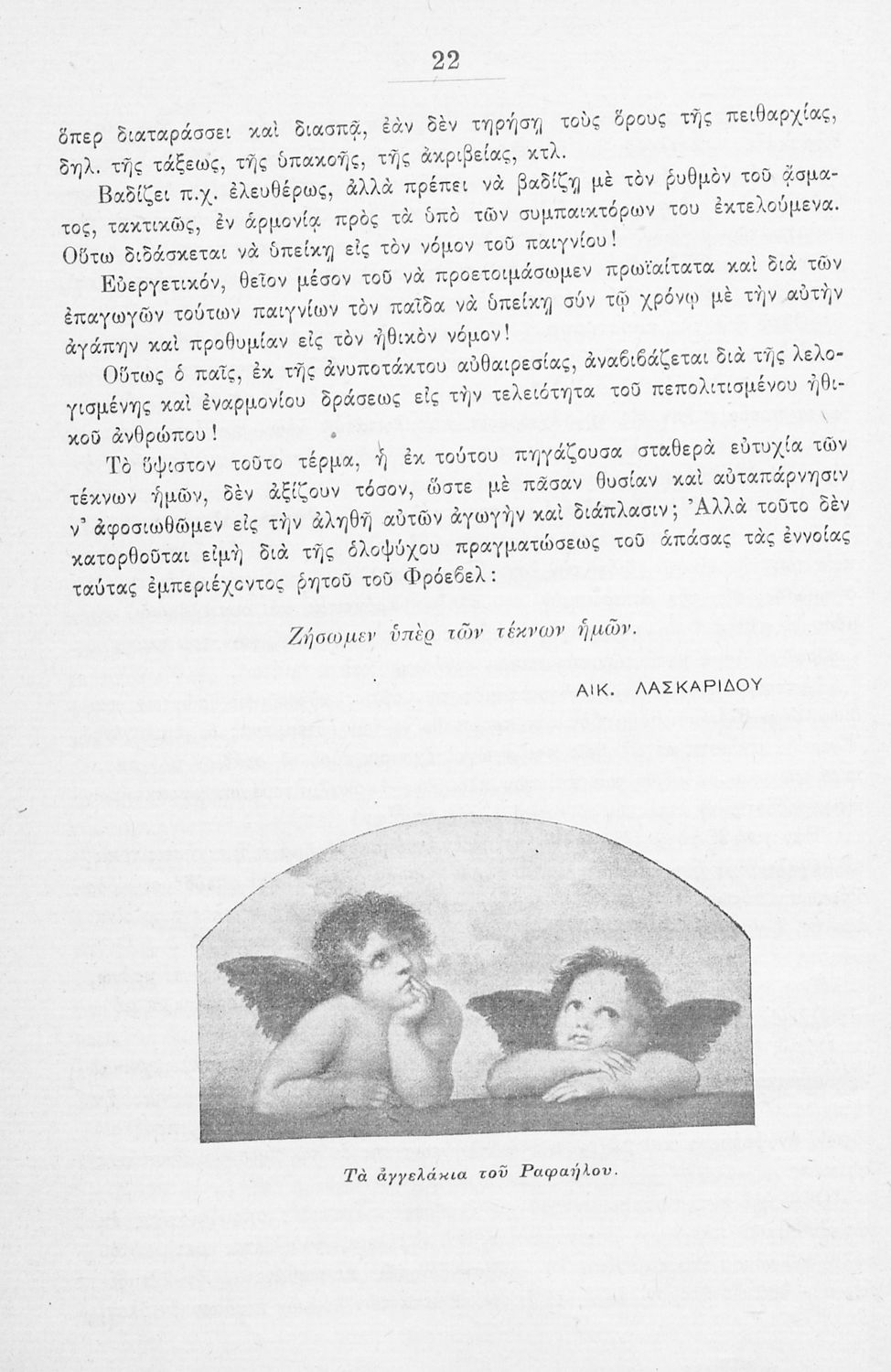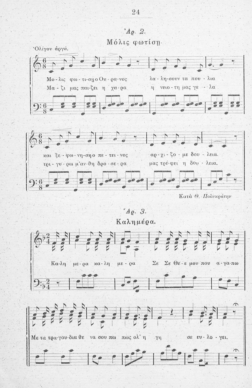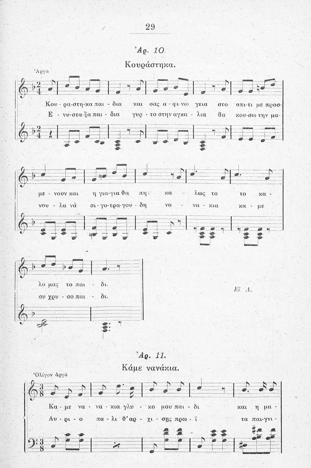 Μάθημα: Μουσική Γλώσσα: Απλή καθαρεύουσα Παρουσίαση περιεχομένου: Παιδαγωγικό βοήθημα για τις νηπιαγωγούς και τις μητέρες. Το βιβλίο είναι αφιερωμένο στη μνήμη της Αικατερίνης Λασκαρίδου και αποτελεί οδηγό για τη χρήση της μουσικής και των τραγουδιών ως εκπαιδευτικό εργαλείο μέσω της χρήσης του παιχνιδιού. Συνδέει τα τραγούδια με το παιχνίδι και τα χωρίζει σε έξι κατηγορίες παιχνιδιών. |