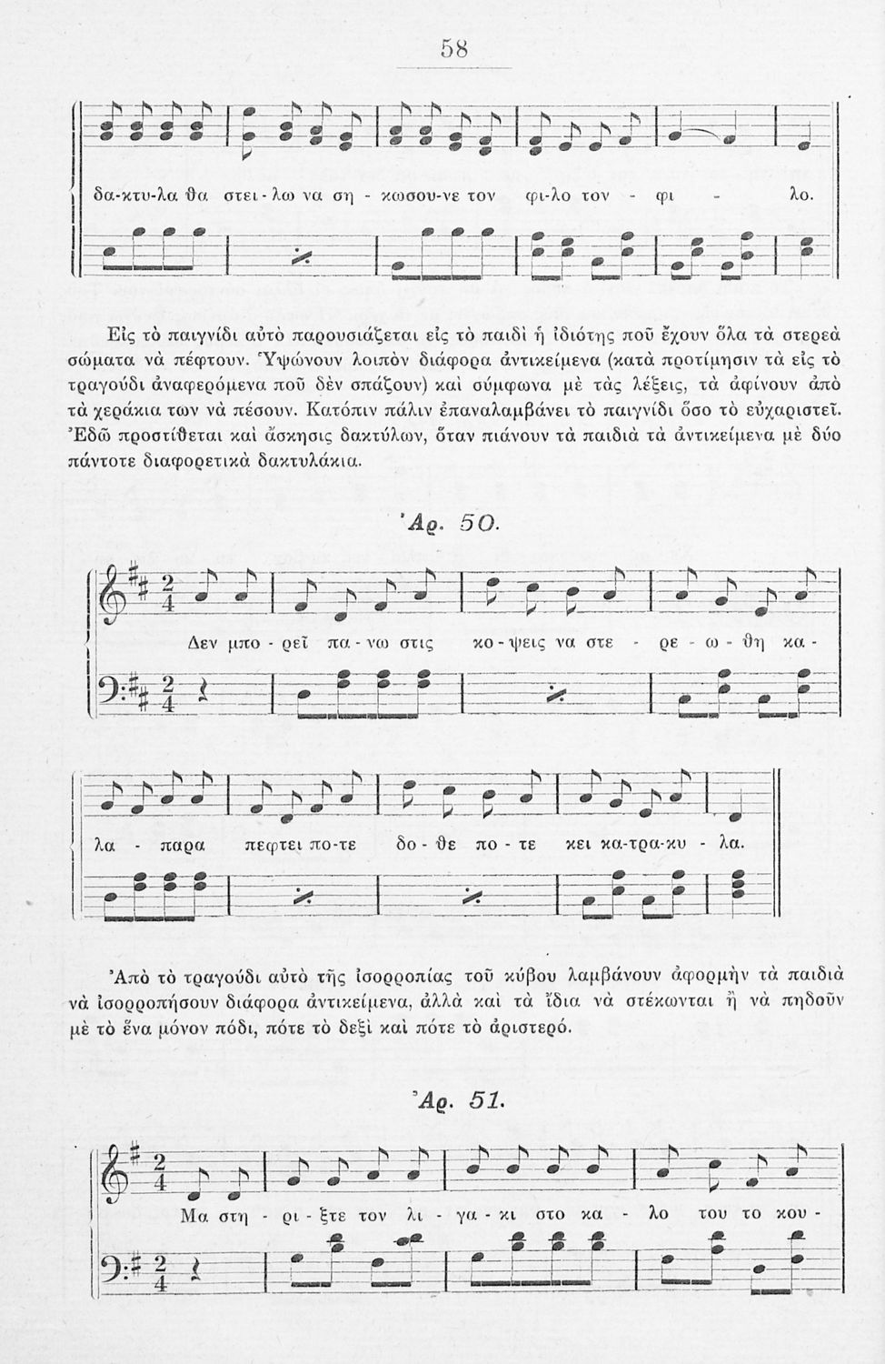 Παιδαγωγικό βοήθημα για τις νηπιαγωγούς και τις μητέρες. Το βιβλίο είναι αφιερωμένο στη μνήμη της Αικατερίνης Λασκαρίδου και αποτελεί οδηγό για τη χρήση της μουσικής και των τραγουδιών ως εκπαιδευτικό εργαλείο μέσω της χρήσης του παιχνιδιού. Συνδέει τα τραγούδια με το παιχνίδι και τα χωρίζει σε έξι κατηγορίες παιχνιδιών.