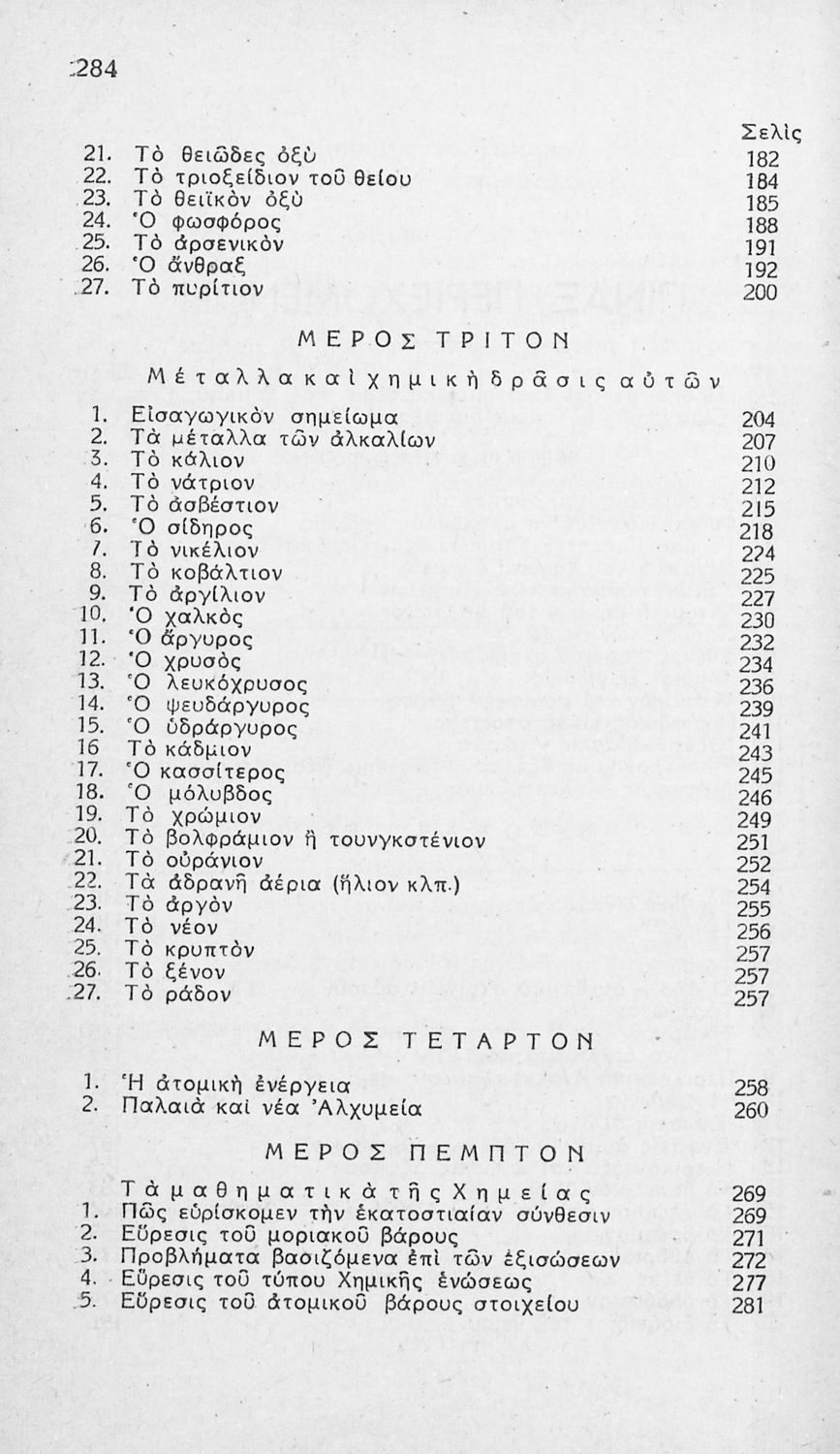Μαθητικό βοήθημα Χημείας για τους υποψήφιους των Εισαγωγικών Εξετάσεων των Ανωτάτων Σχολών, των μαθητών Γυμνασίων, Πρακτικών Λυκείων και Εμπορικών Σχολών που παρουσιάζει τις βασικές έννοιες της Χημείας και εστιάζει στα μέταλλα και αμέταλλα στοιχεία και τις ιδιότητές τους.