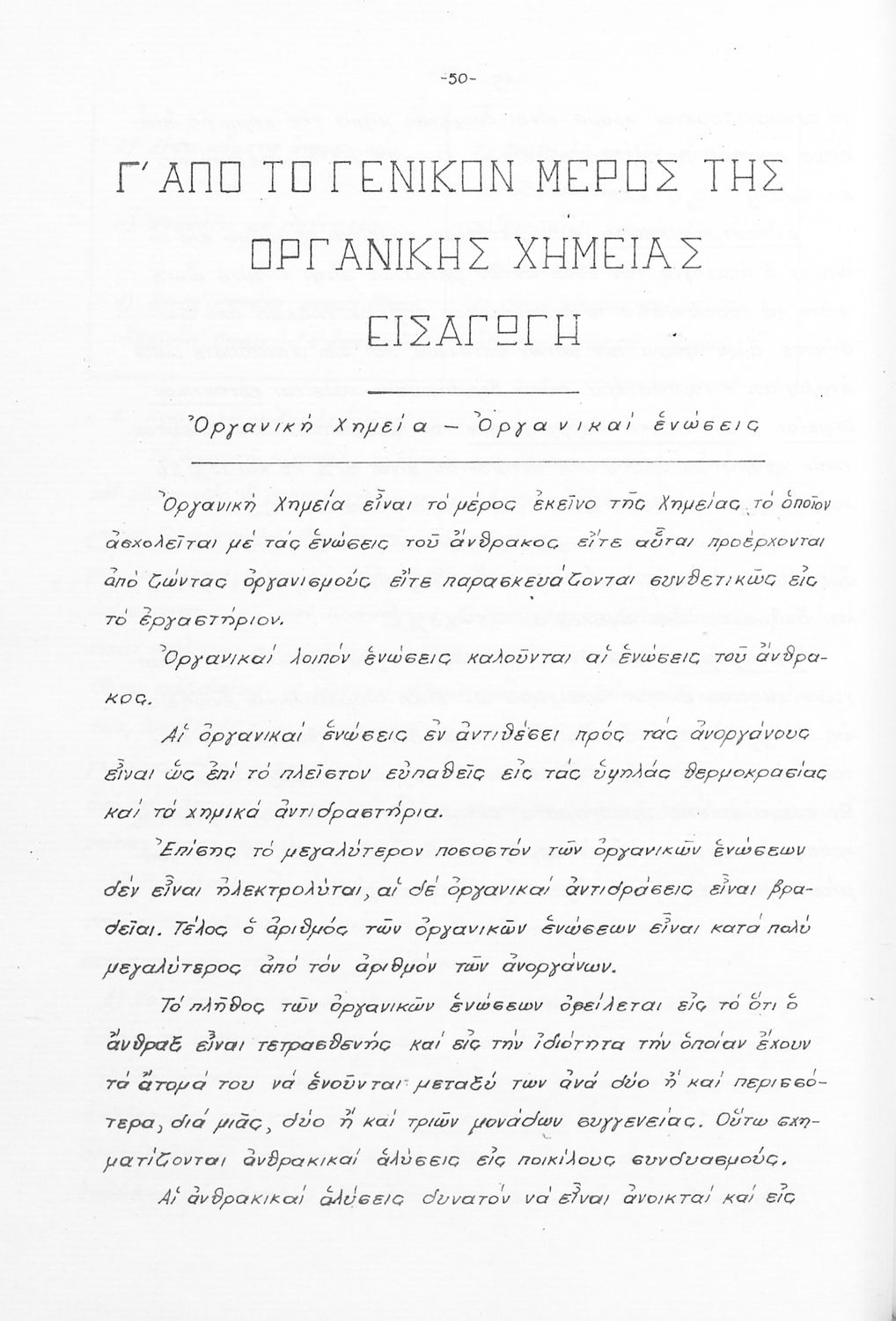 Σχολικό εγχειρίδιο Χημείας Γ΄ Γυμνασίου που περιέχει εισαγωγή στην οργανική χημεία και εστιάζει στους υδρογονάνθρακες, τα σάκχαρα και τα λιπαρά σώματα.
