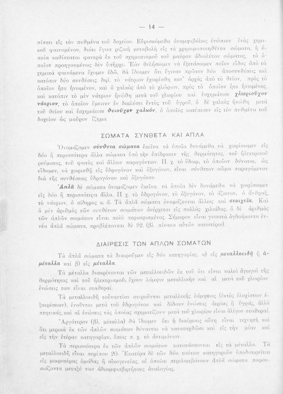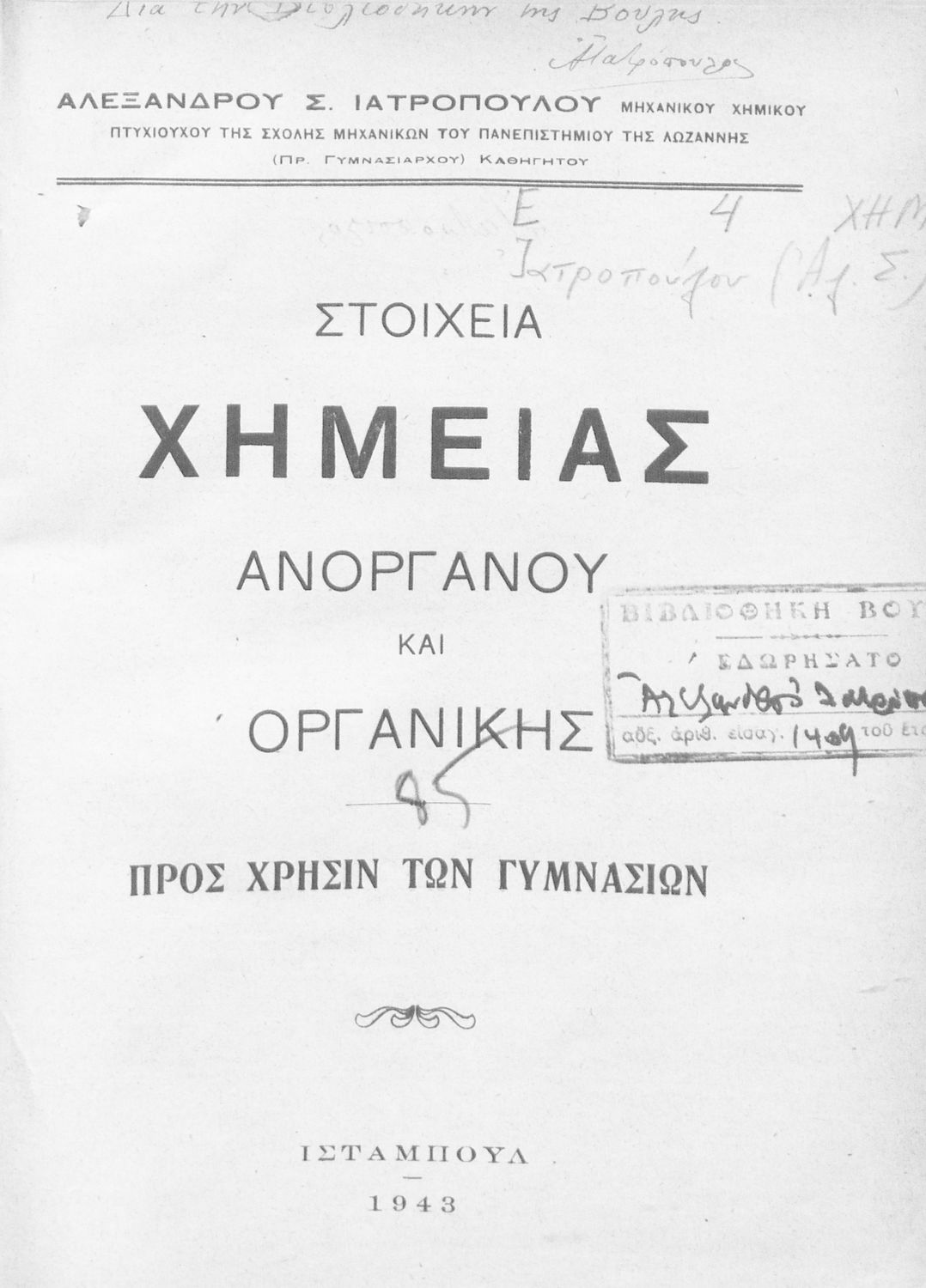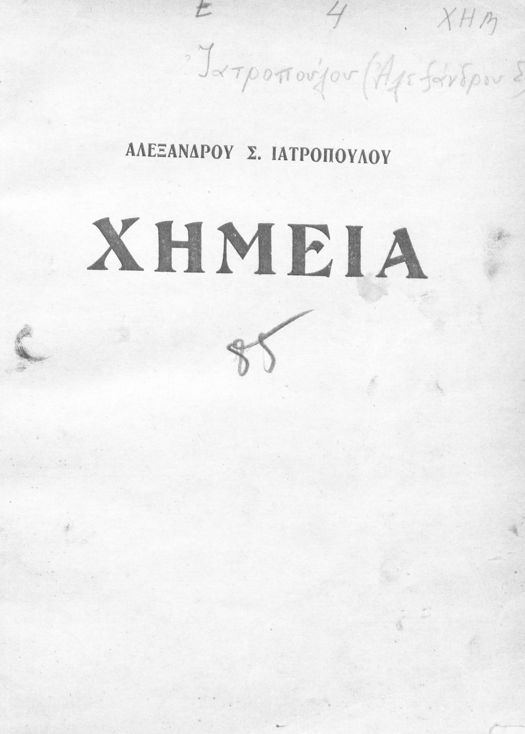 Σχολικό εγχειρίδιο Χημείας που προσδιορίζει τη σύσταση της ύλης (ατομική θεωρία, θεμελιώδεις νόμοι της Χημείας), τις χημικές αντιδράσεις και εξισώσεις καθώς περιγράφονται οι χημικές ενώσεις (οξέα, βάσεις, ...