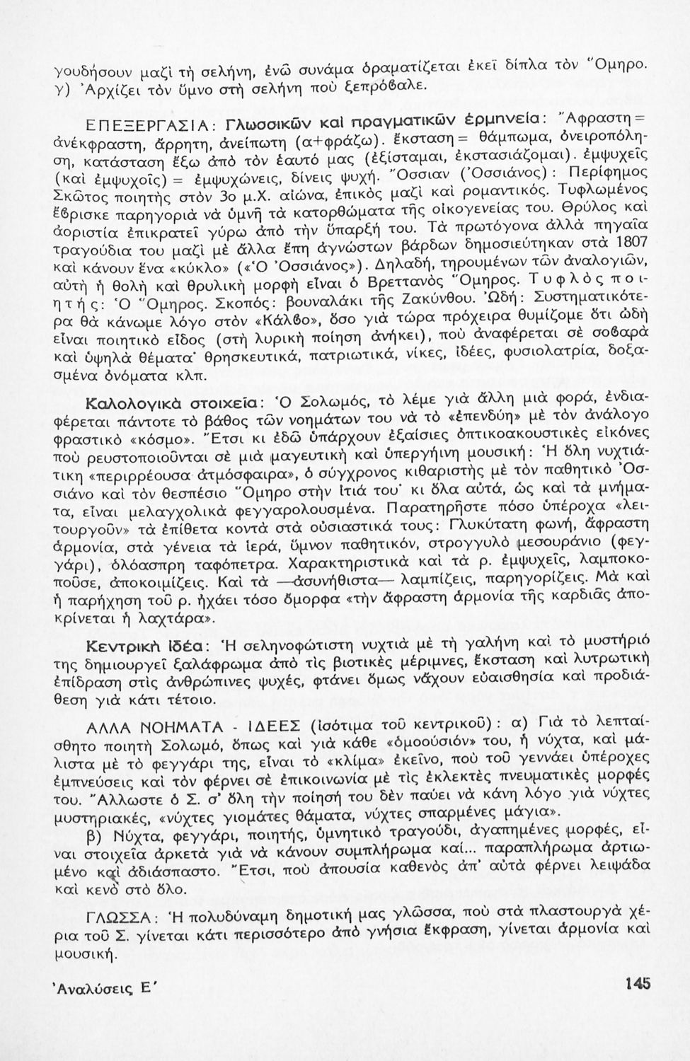 Μαθητικό βοήθημα Νέων Ελληνικών Ε' Γυμνασίου που περιλαμβάνει αναλύσεις των κειμένων του αντίστοιχου σχολικού εγχειριδίου από νοηματική, ερμηνευτική και γλωσσική σκοπιά.