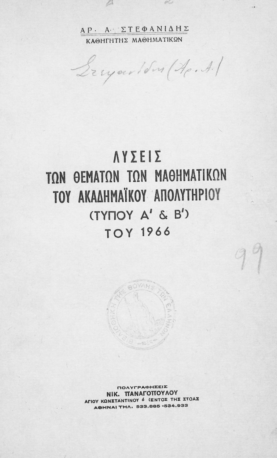 Βαθμίδα εκπαίδευσης: Δευτεροβάθμια Μάθημα: Μαθηματικά Γλώσσα: Καθαρεύουσα Παρουσίαση περιεχομένου: Μαθητικό βοήθημα Μαθηματικών που περιέχει λύσεις των ασκήσεων για τους υποψηφίους του ακαδημαϊκού απολυτηρίου τύπου Α και Β. |