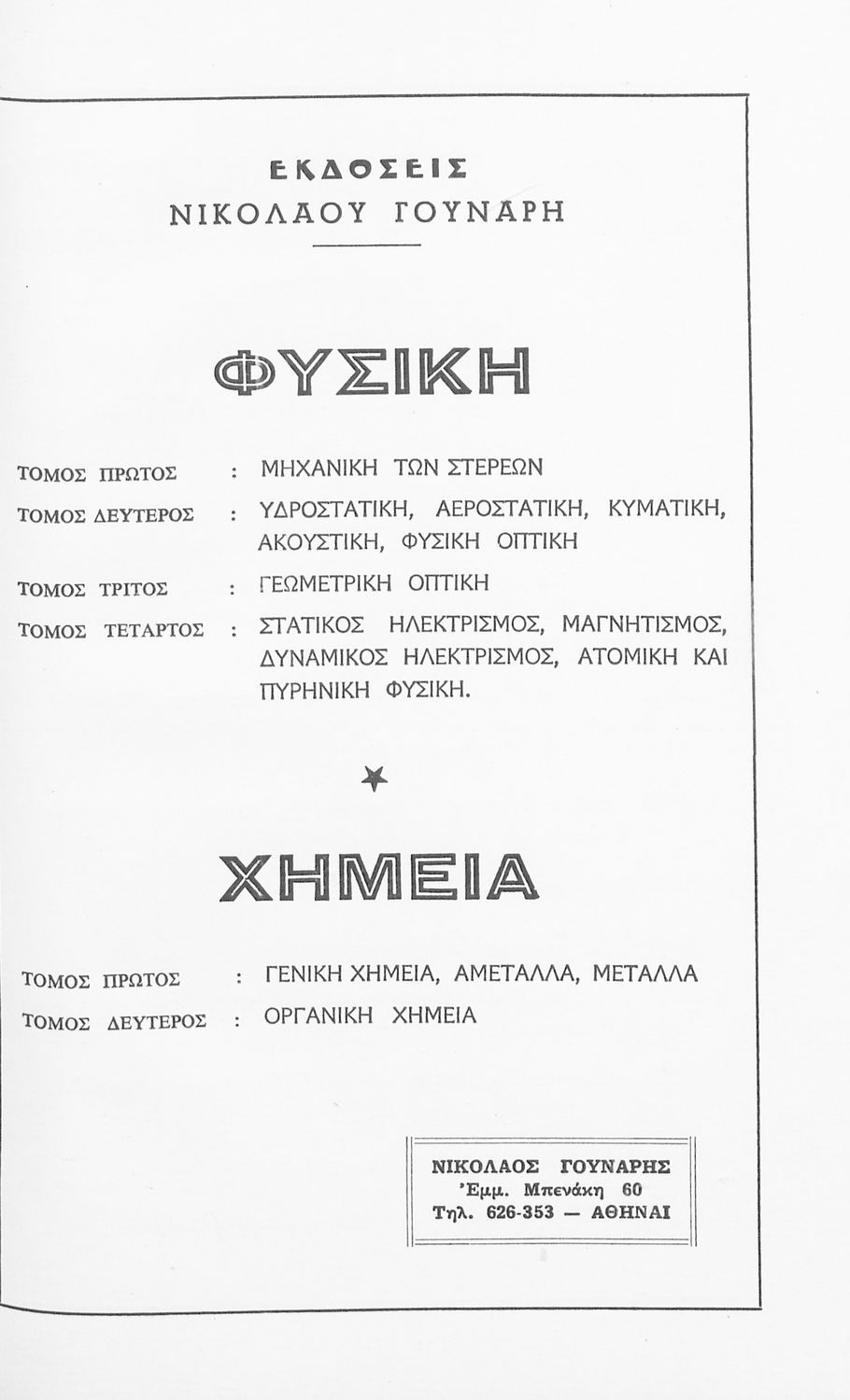 520 ## _aΜαθητικό βοήθημα Φυσικής για τους υποψηφίους Ακαδημαϊκού Απολυτηρίου 1965-66, τύπου Άλφα. Το βιβλίο πραγματεύεται τα ζητήματα της μηχανικής των σωμάτων, του ηλεκτρισμού, της οπτικής καθώς και της φυσικής του ατόμου. Κάθε θεματική ενότητα αποτελείται από ένα θεωρητικό μέρος το οποίο ακολουθείται από ασκήσεις.