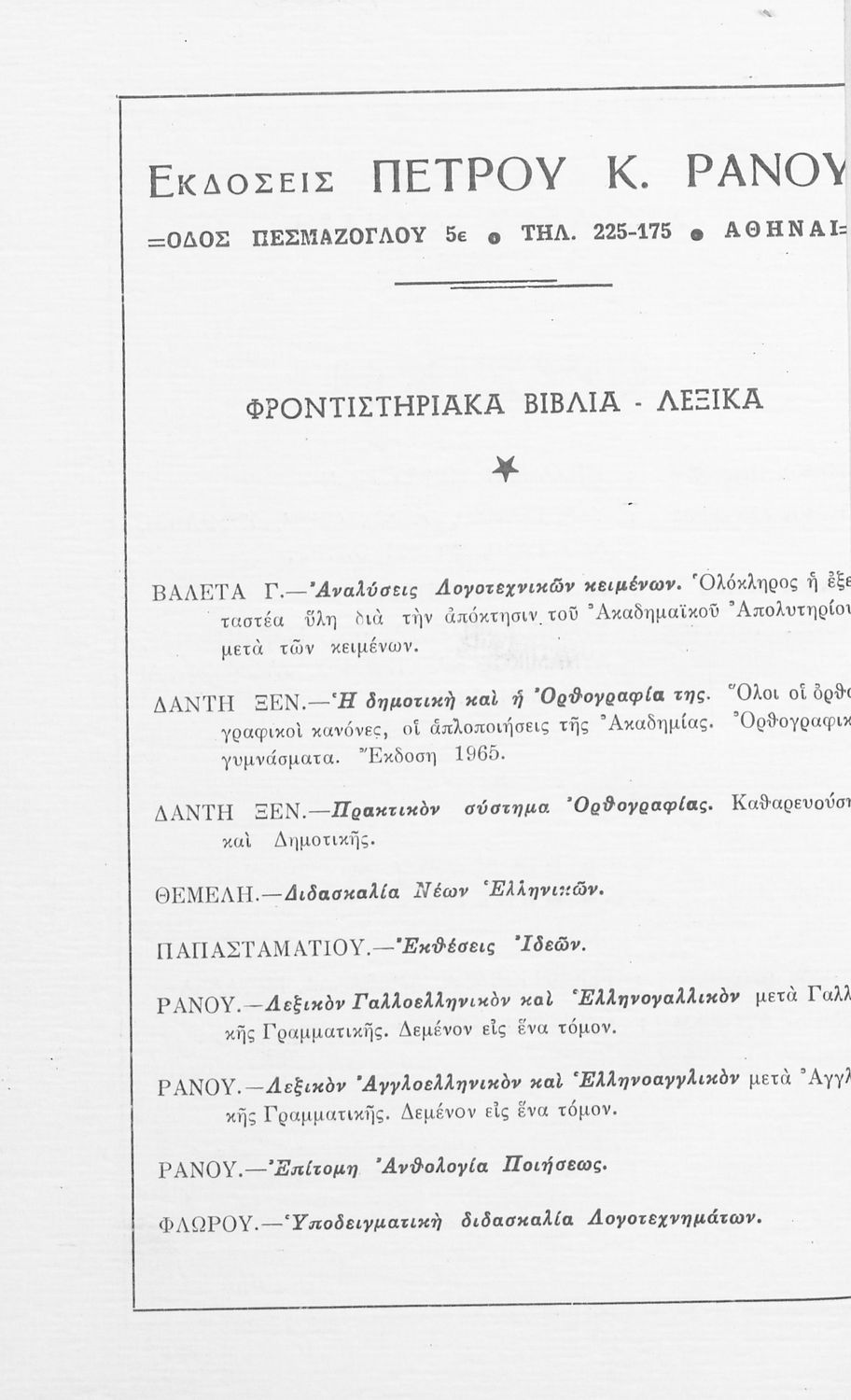 Εκδότης: Πέτρος Κ. Ράνος Έτος έκδοσης: 1965 Τόπος έκδοσης: Αθήνα |