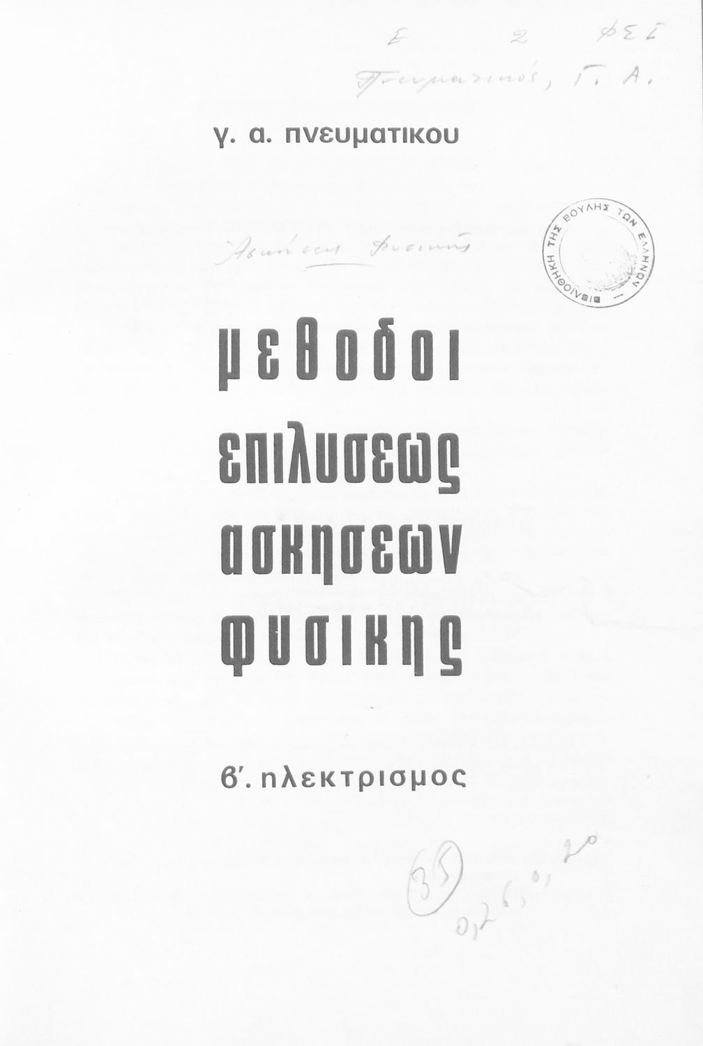 Μαθητικό βοήθημα Φυσικής για τους υποψήφιους των Ανωτάτων Σχολών. Στο βιβλίο περιλαμβάνονται μέθοδοι λύσης των ασκήσεων, εστιάζοντας περισσότερον στη ασκήσεις ηλεκτρισμού.