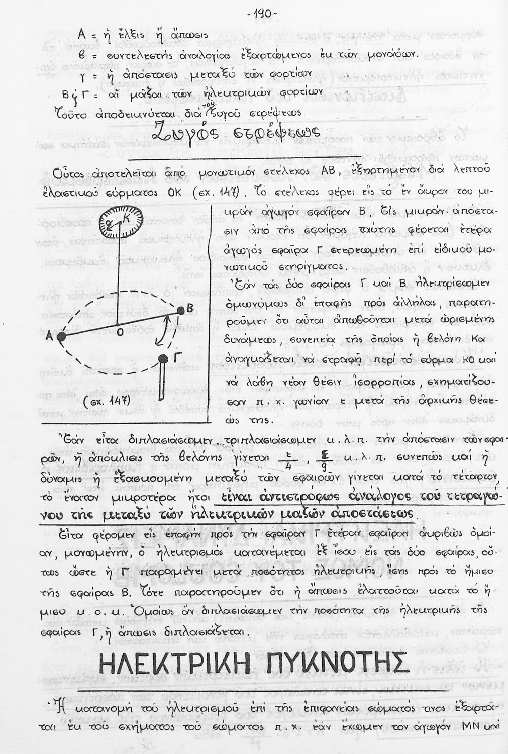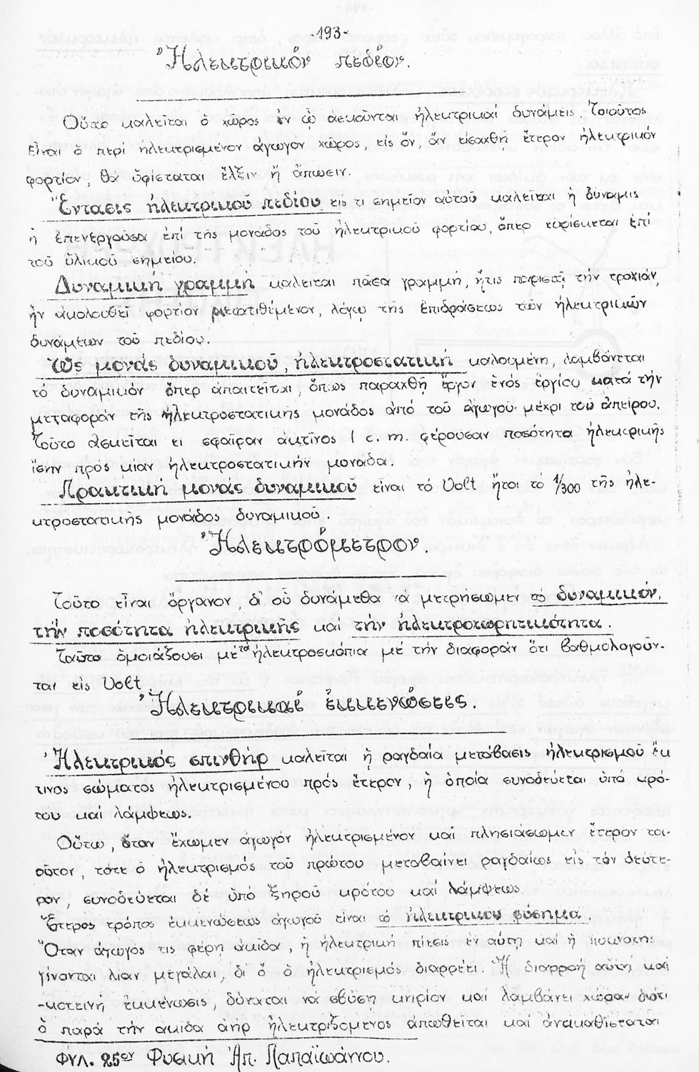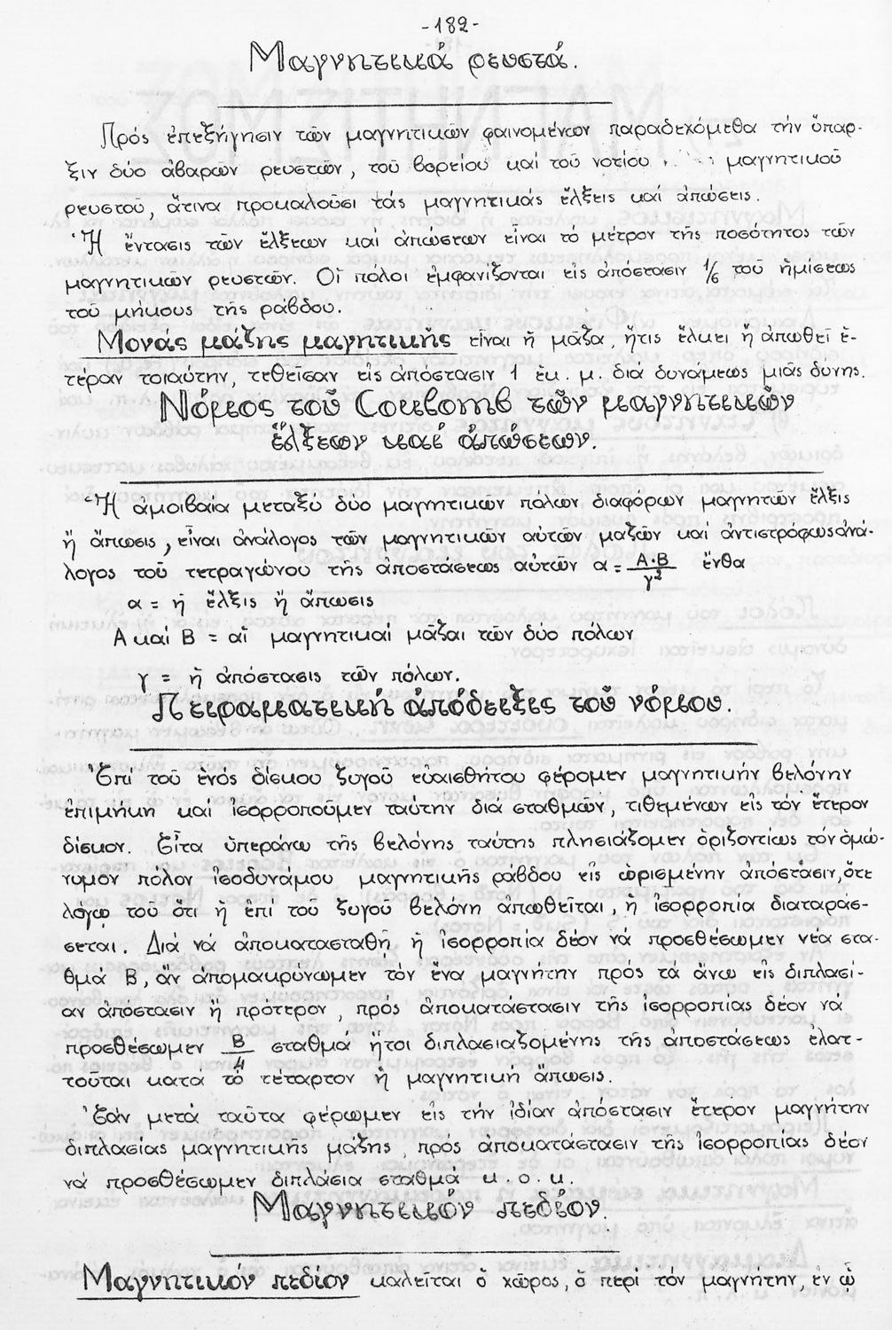Μαθητικό βοήθημα Φυσικής για τους υποψήφιους των Πανεπιστημίου, ως και των λοιπών διαφόρων ανώτερων Σχολών του Κράτους. Το βιβλίο καλύπτει τις θεματικές του ηλεκτρισμού, του μαγνητισμού και του ηλεκτρομαγνητισμού μέσω επεξηγηματικών σημειώσεων και ασκήσεων για εξάσκηση των υποψηφίων.