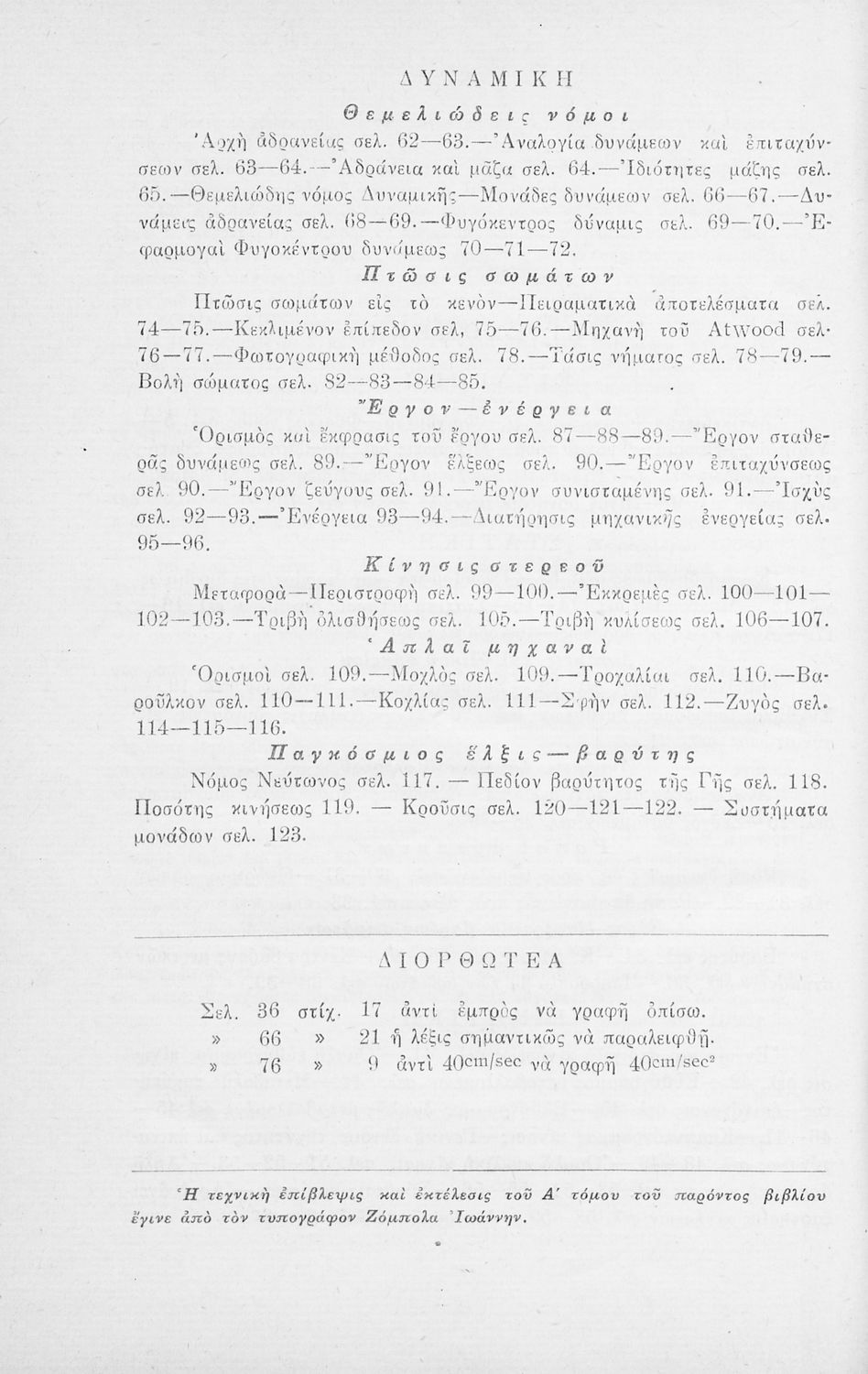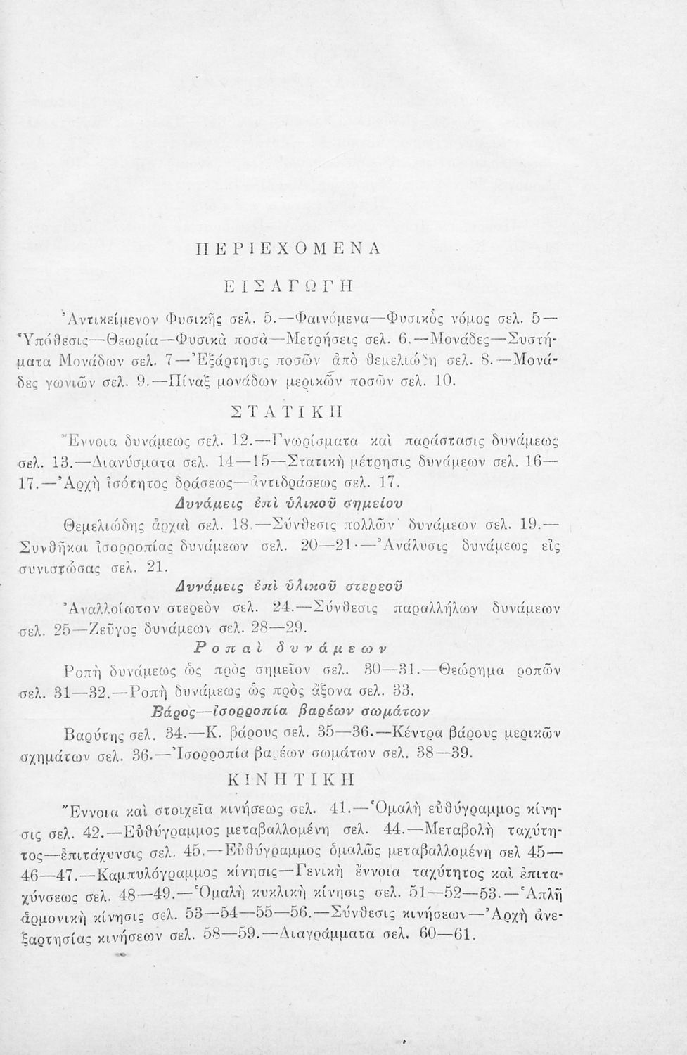 Μαθητικό βοήθημα Φυσικής για τους υποψήφιους Ανωτάτων Σχολών, τους μαθητές Γυμνασίων (κυρίως πρακτικής κατευθύνσεως) και δια τους μαθητάς μηχανοτεχνικών σχολών (εργοδηγούς και ραδιοτεχνίτες). Το βιβλίο περιέχει βασικές έννοιες της Μηχανικής των στερεών σωμάτων, κίνησης και ισορροπίας καθώς και στοιχεία Δυναμικής παρουσιάζοντας τους θεμελιώδεις νόμους μέσα από την κίνηση των στερεών σωμάτων.