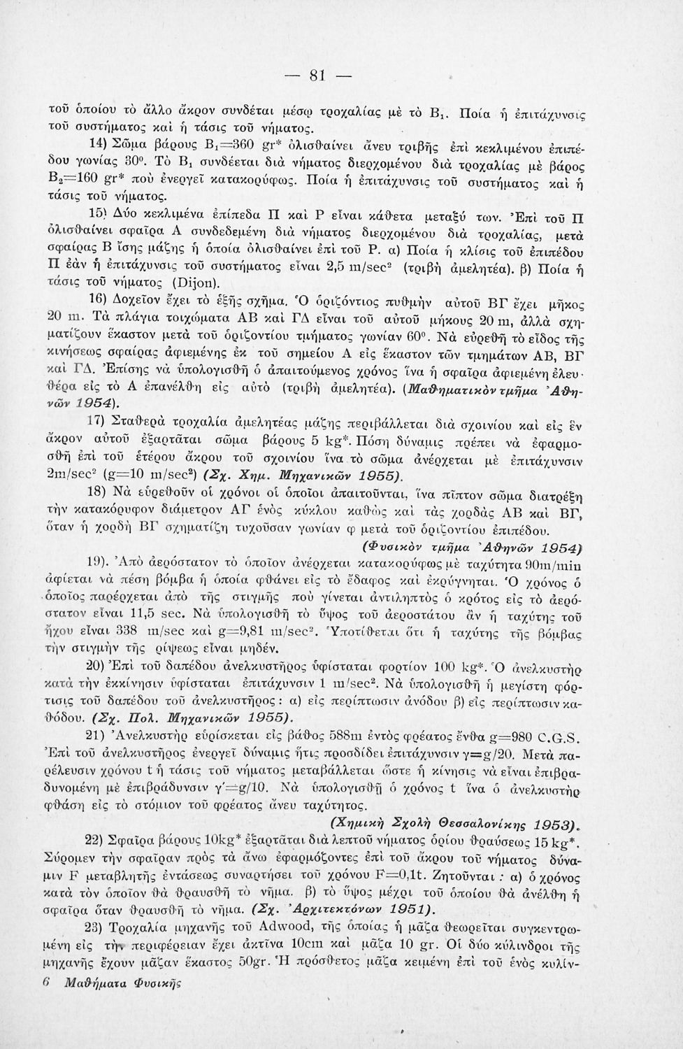 Μαθητικό βοήθημα Φυσικής για τους υποψήφιους Ανωτάτων Σχολών, τους μαθητές Γυμνασίων (κυρίως πρακτικής κατευθύνσεως) και δια τους μαθητάς μηχανοτεχνικών σχολών (εργοδηγούς και ραδιοτεχνίτες). Το βιβλίο περιέχει βασικές έννοιες της Μηχανικής των στερεών σωμάτων, κίνησης και ισορροπίας καθώς και στοιχεία Δυναμικής παρουσιάζοντας τους θεμελιώδεις νόμους μέσα από την κίνηση των στερεών σωμάτων.