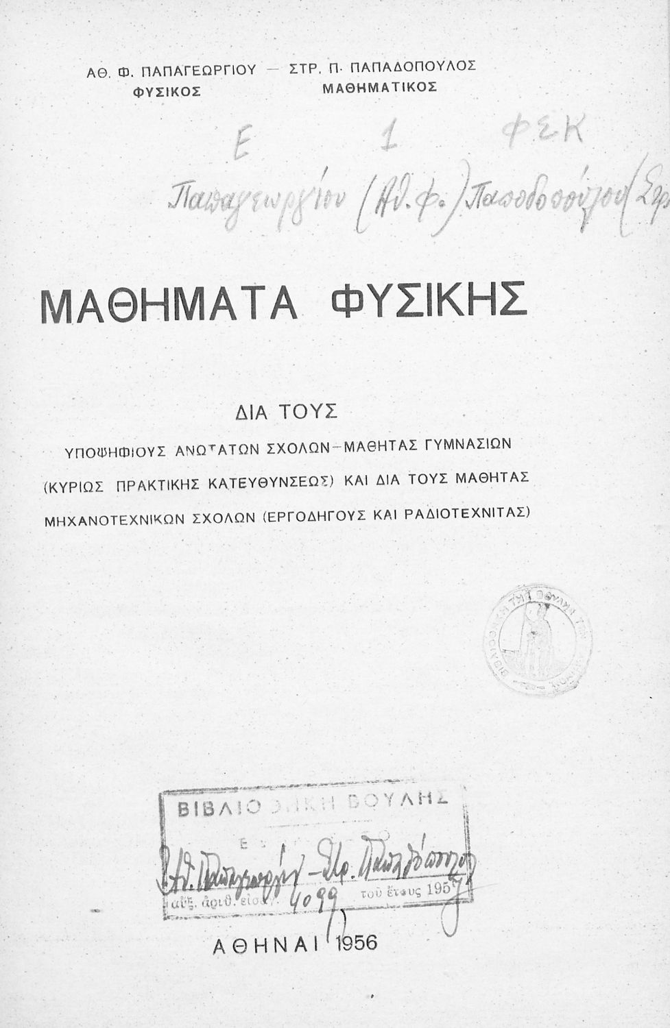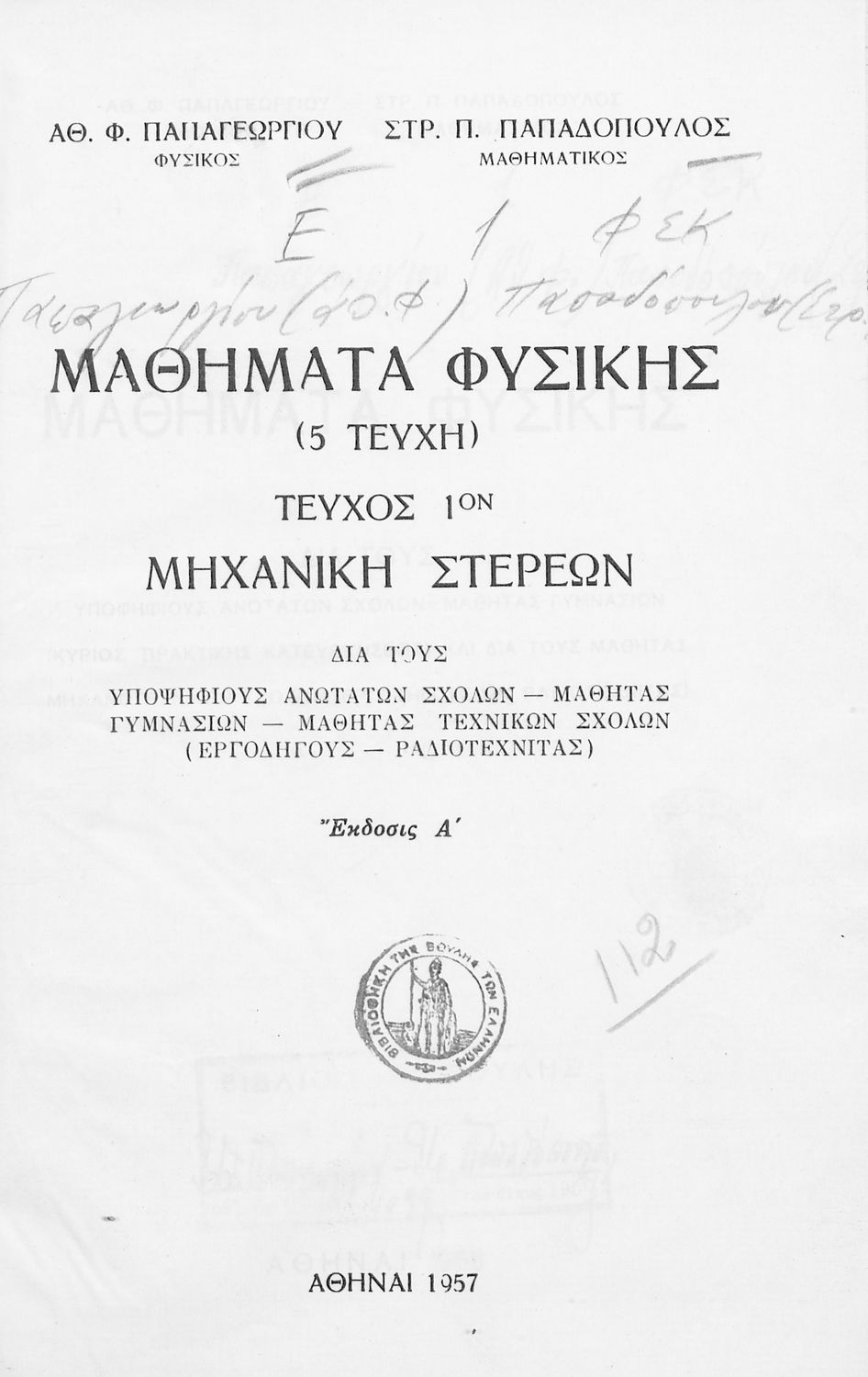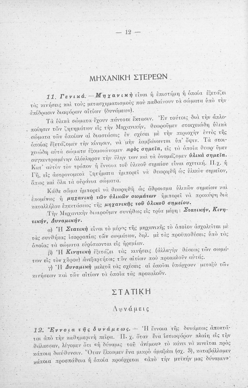 Μαθητικό βοήθημα Φυσικής για τους υποψήφιους Ανωτάτων Σχολών, τους μαθητές Γυμνασίων (κυρίως πρακτικής κατευθύνσεως) και δια τους μαθητάς μηχανοτεχνικών σχολών (εργοδηγούς και ραδιοτεχνίτες). Το βιβλίο περιέχει βασικές έννοιες της Μηχανικής των στερεών σωμάτων, κίνησης και ισορροπίας καθώς και στοιχεία Δυναμικής παρουσιάζοντας τους θεμελιώδεις νόμους μέσα από την κίνηση των στερεών σωμάτων.