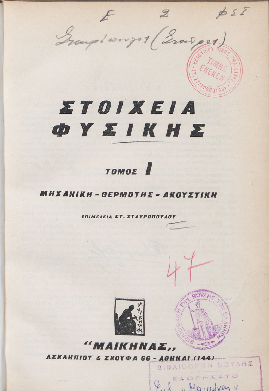 LDR 01366 2200193 4500 035 ## _a03-20638127 040 ## _aΒιβλιοθήκη της Βουλής των Ελλήνων 041 ## _ael 100 ## _aΣτ. Σταυρόπουλος (επιμέλεια) 110 ## _a20638127 245 0# _aΣτοιχεία Φυσικής, προς χρήσιν των μαθητών των Γυμνασίων και των σπουδαστών των Επιστημών των Πολυτεχνείων, της Ιατρικής και των Τεχνών 260 ## _aΑθήνα _bΜαικήνας _c1964 300 ## _a248 _bΕικόνες, σκίτσα ασπρόμαυρα 520 ## _aΜαθητικό βοήθημα Φυσικής για τους υποψήφιους των εξετάσεων Ακαδημαϊκού Απολυτηρίου Τύπου “Α”. Το βιβλίο περιλαμβάνει στοιχεία Φυσικής στις θεματικές της μηχανικής, της θερμότητας της οπτικής και του ηλεκτρισμού. 521 ## _aΓυμνάσιο 522 ## _aΕλλάδα 546 ## _aΑπλή καθαρεύουσα 563 ## _aΣκληρό Εξώφυλλο 650 #4 _aΑεροστατική _aΑκουστική _aΘερμότητα _aΚυματική _aΜαθητικό βοήθημα _aΤαλαντώσεις _aΦυσική