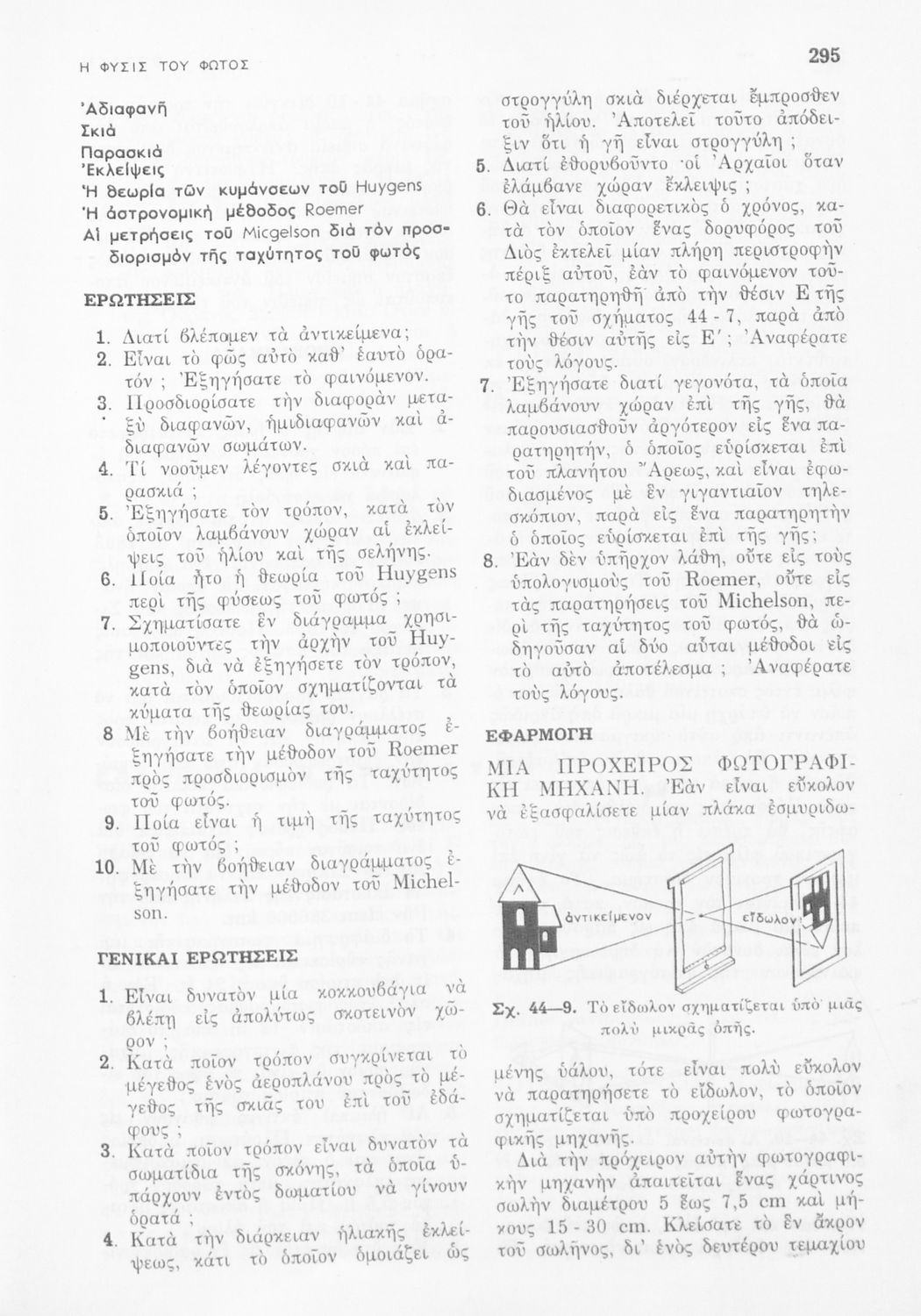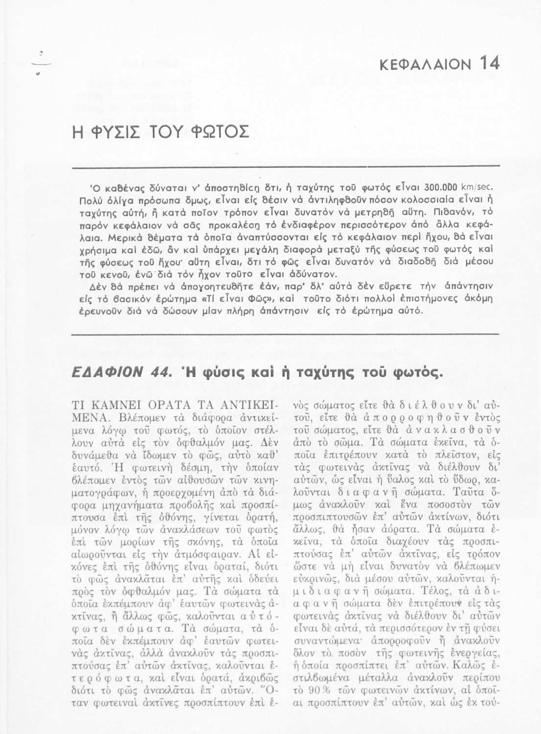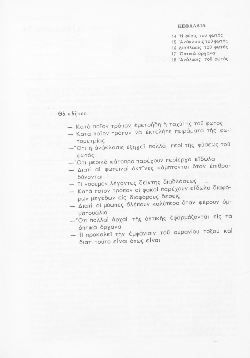 Παιδαγωγικό βοήθημα για την δευτεροβάθμια εκπαίδευση για το μάθημα της Φυσικής. Το εγχειρίδιο αποτελείται από 27 κεφάλαια, όπου αναπτύσσονται εκτενώς τα βασικότερα θέματα της επιστήμης της φυσικής. Ενδεικτικά αναφέρονται η μοριακή φυσική, τα ρευστά, η βαρύτητα, η θερμότητα, η μηχανική, η ακουστική, η οπτική, ο μαγνητισμός και ηλεκτρισμός, τα εναλλασσόμενα ρεύματα, η πυρηνική φυσική και άλλα.