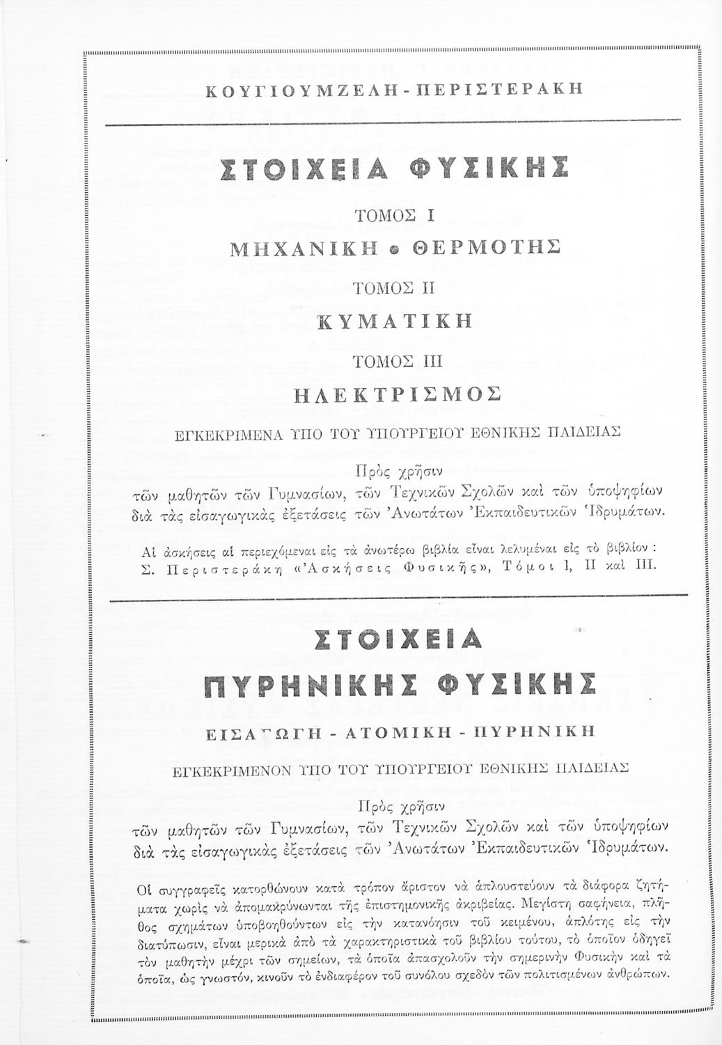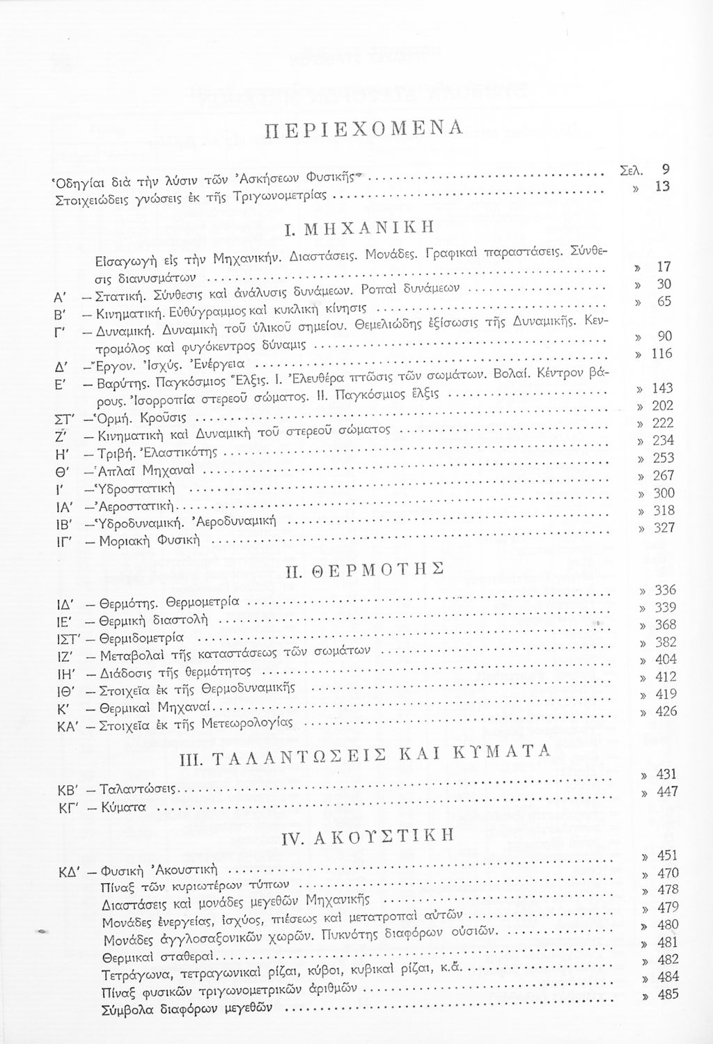 Μαθητικό βοήθημα Φυσικής για τους υποψηφίους των Ανωτάτων Σχολών και τους μαθητές των ανωτέρων τάξεων των Σχολείων Μέσης Εκπαιδεύσεως που εξετάζει ζητήματα μηχανικής, ηλεκτρισμού και ηλεκτρομαγνητισμού, και θερμότητας και τις μεταβολές που επιφέρει στις ιδιότητες των αερίων.