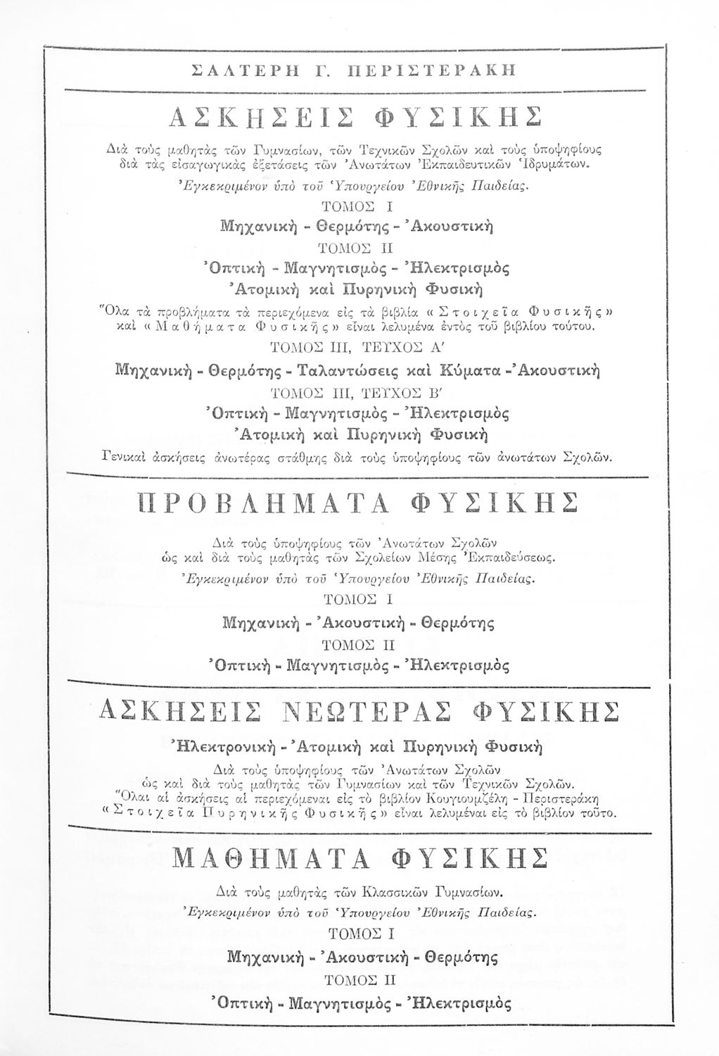 Ασκήσεις φυσικής τόμος πρώτος, μηχανική, θερμότητα, ακουστική, ταλαντώσεις και κύματα προς χρήσιν των μαθητών των Γυμνασίων, των τεχνικών σχολών και των υποψηφίων δια τας εισαγωγικάς εξετάσεις των ανωτάτων εκπαιδευτικών ιδρυμάτων