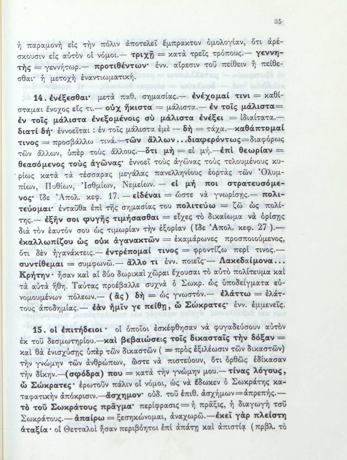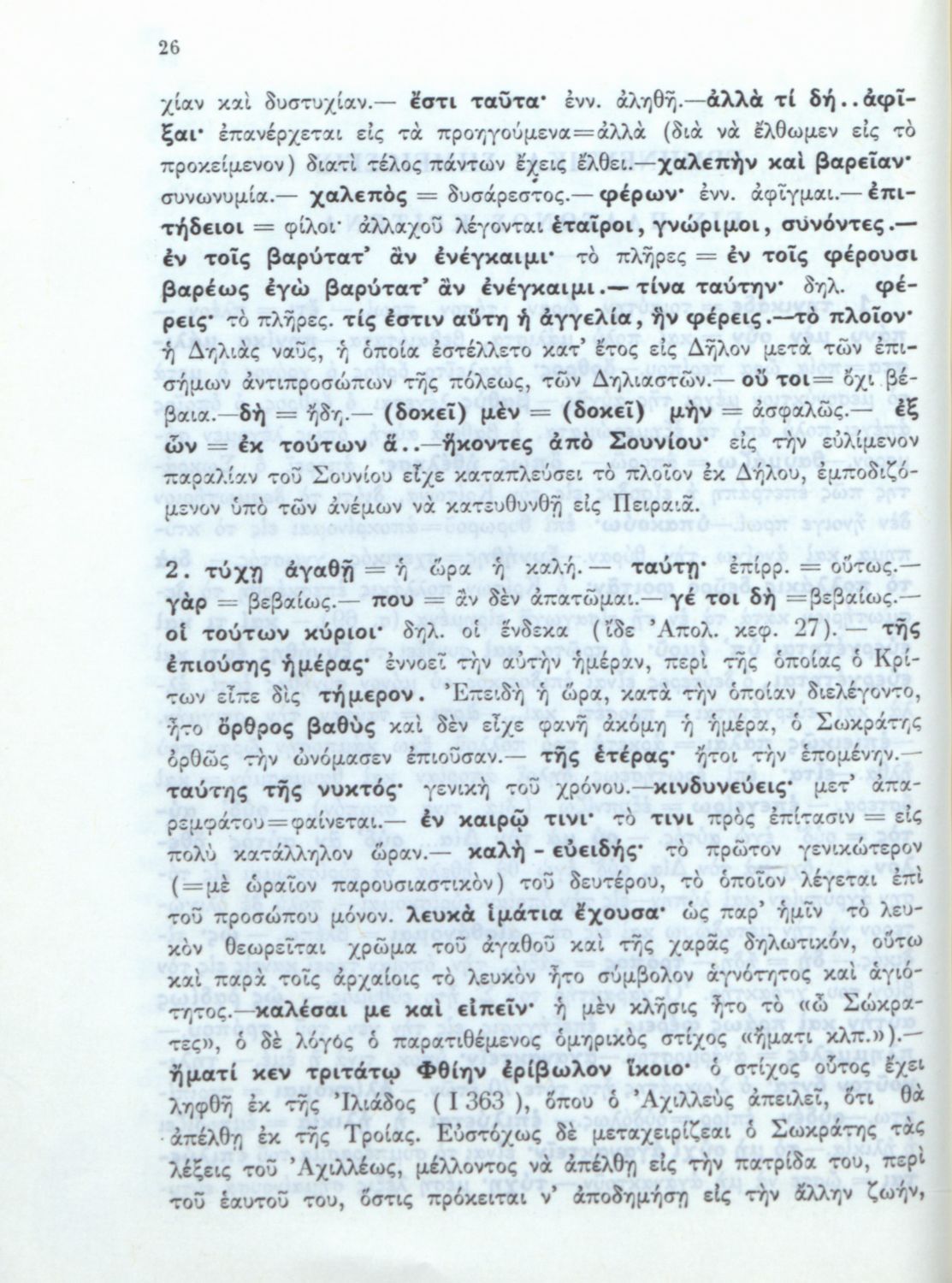 Σχολικό εγχειρίδιο Αρχαίων Ελληνικών Γυμνασίου που περιέχει τα έργα του Πλάτωνα Απολογία Σωκράτους και Κρίτων, ερμηνευτικά και πραγματολογικά σχόλια και λεξιλογικές παρατηρήσεις.