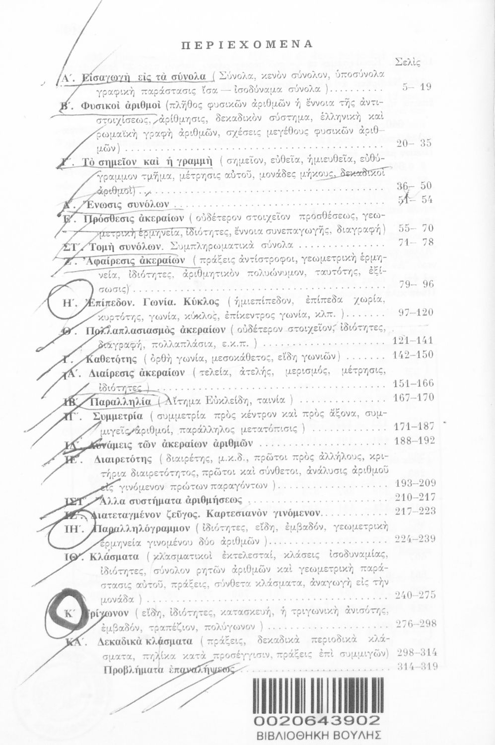 Σχολικό εγχειρίδιο Γεωμετρίας για τις Α΄, Β΄, Γ΄ Γυμνασίου που είναι χωρισμένο σε Επιπεδομετρία και Στερεομετρία και περιλαμβάνει θεωρία και ασκήσεις.