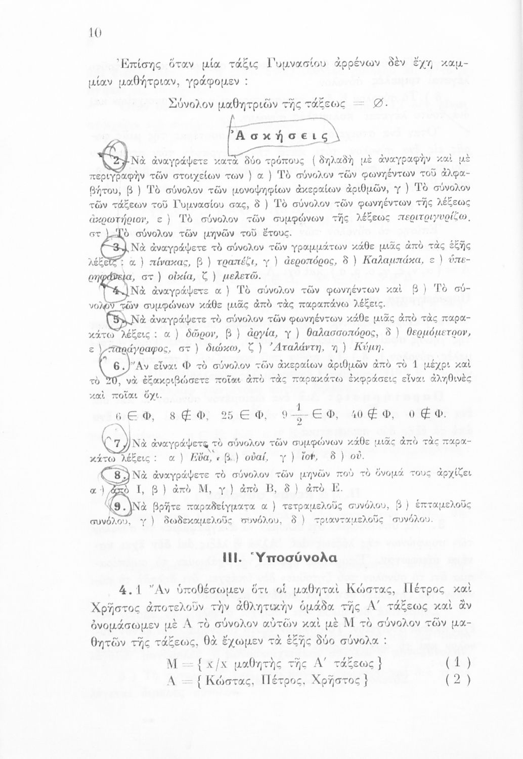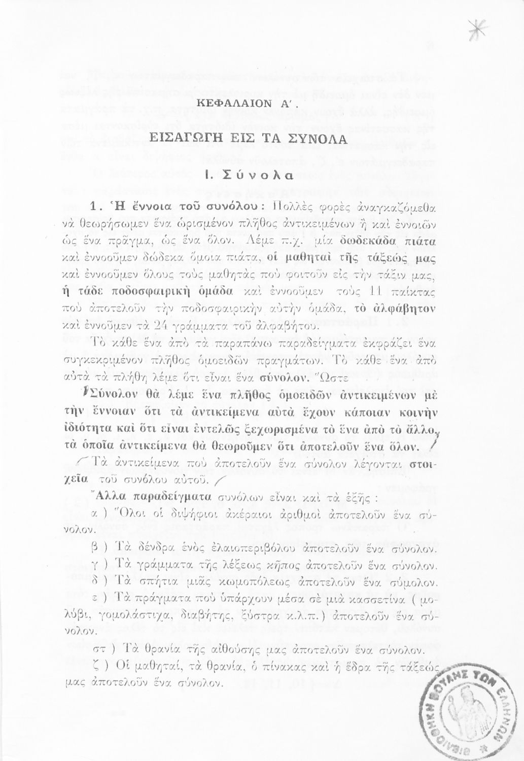 Μαθητικό βοήθημα Μαθηματικών Α' Γυμνασίου που περιέχει άλγεβρα με έμφαση στις αριθμητικές πράξεις με ακέραιους, δεκαδικούς και κλάσματα, και εισαγωγή στη θεωρία των συνόλων.