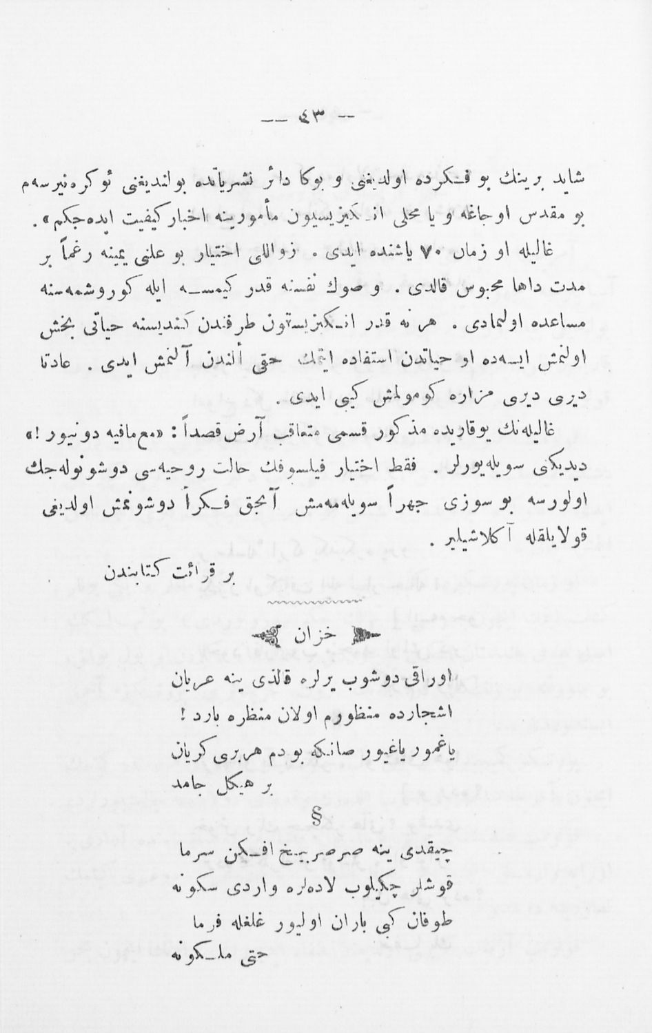 Αναγνωστικό για τους μαθητές της Δ' τάξης των Μουσουλμανικών Σχολείων που περιέχει κείμενα στα τουρκικά από την κοινωνική και την οικογενειακή ζωή και το φυσικό περιβάλλον.