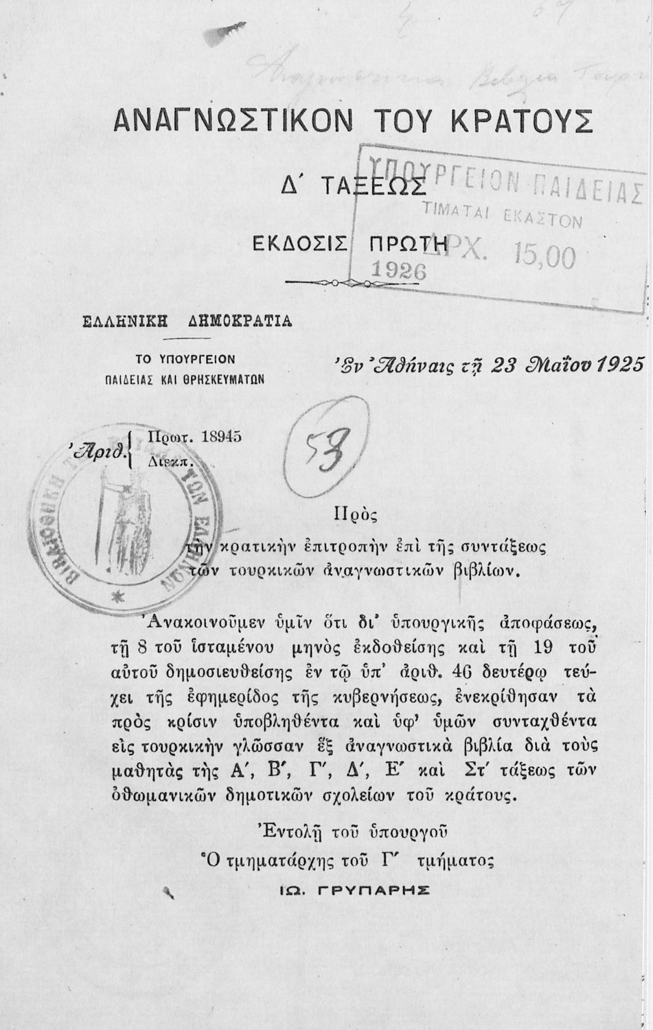 Έτος έκδοσης: 1926 Τόπος έκδοσης: Αθήνα Έκδοση: 1η Υπουργική απόφαση / Σύμβαση: 18945/23-5-1925 Έτος έγκρισης: 1925 |
