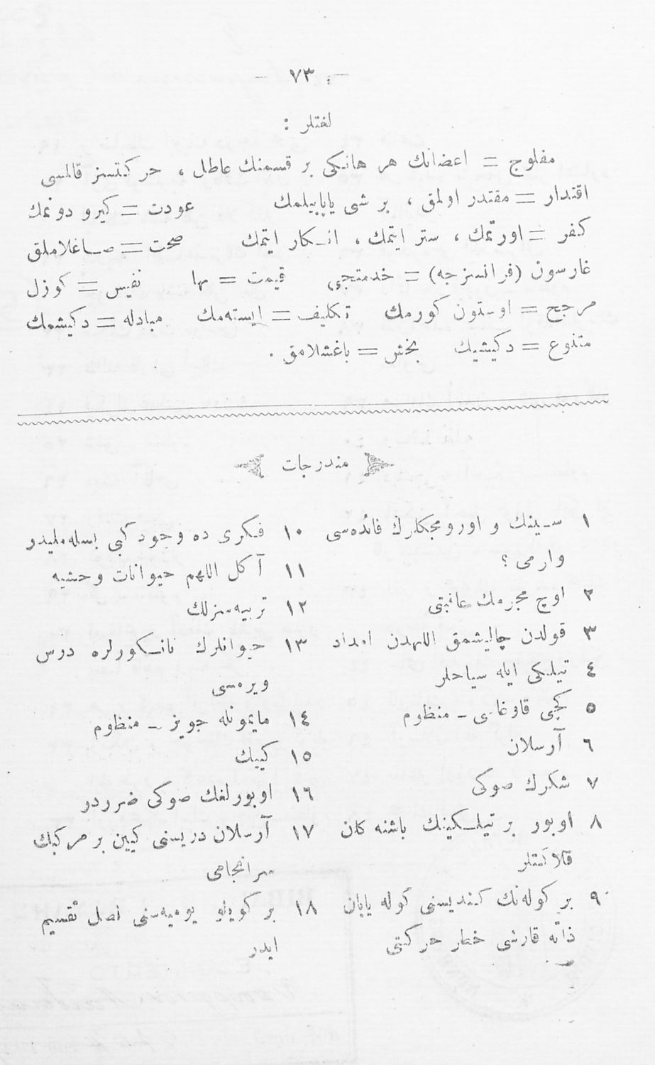 Κωδικός αναγνώρισης: 03-20644181 Τίτλος: Αναγνωστικόν του Κράτους Ε΄ Τάξεως (...εις τουρκικήν γλώσσαν...δια τους μαθητάς..των Οθωμανικών Δημοτικών Σχολείων του Κράτους) Μέγεθος και υπόστρωμα: Σχολικό εγχειρίδιο, σκληρό εξώφυλλο, 84 σελίδες. |