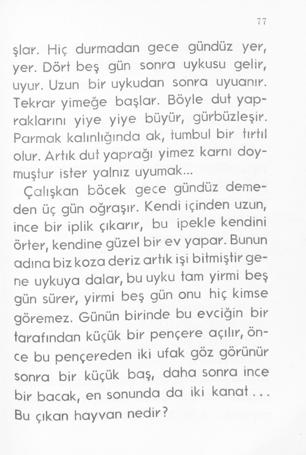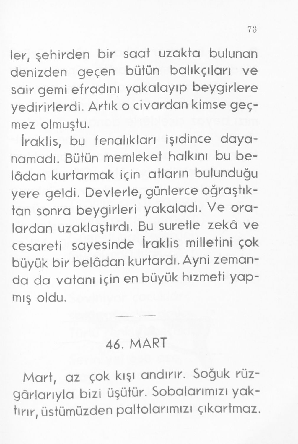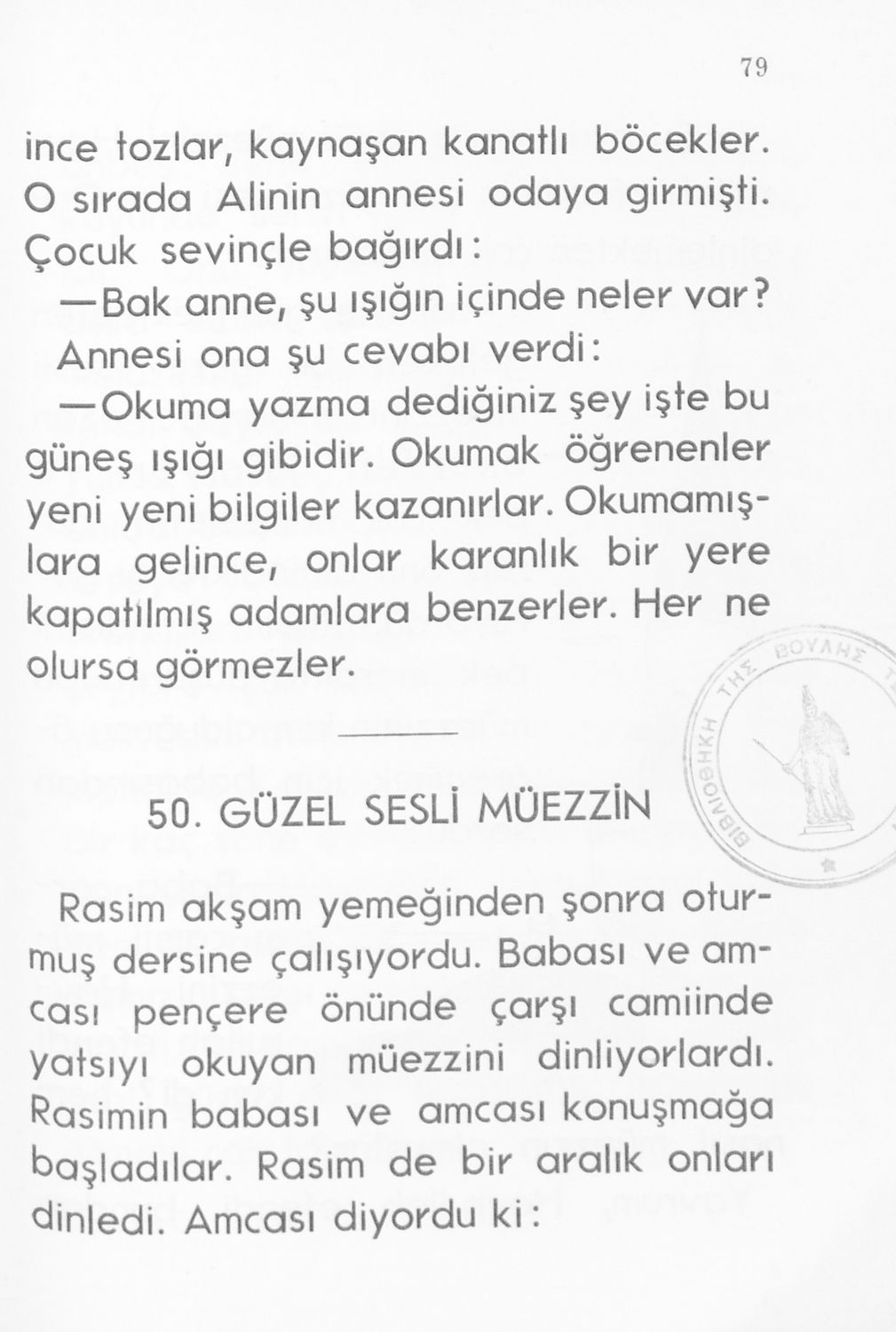 Αναγνωστικό για τους μαθητές της Ε' τάξης των Μουσουλμανικών Σχολείων που περιέχει κείμενα στα τουρκικά από την κοινωνική και την οικογενειακή ζωή και το φυσικό περιβάλλον.