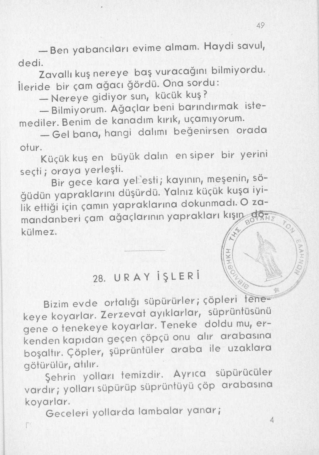 Αναγνωστικό για τους μαθητές της Δ' τάξης των Μουσουλμανικών Σχολείων που περιέχει κείμενα στα τουρκικά από την κοινωνική και την οικογενειακή ζωή και το φυσικό περιβάλλον.