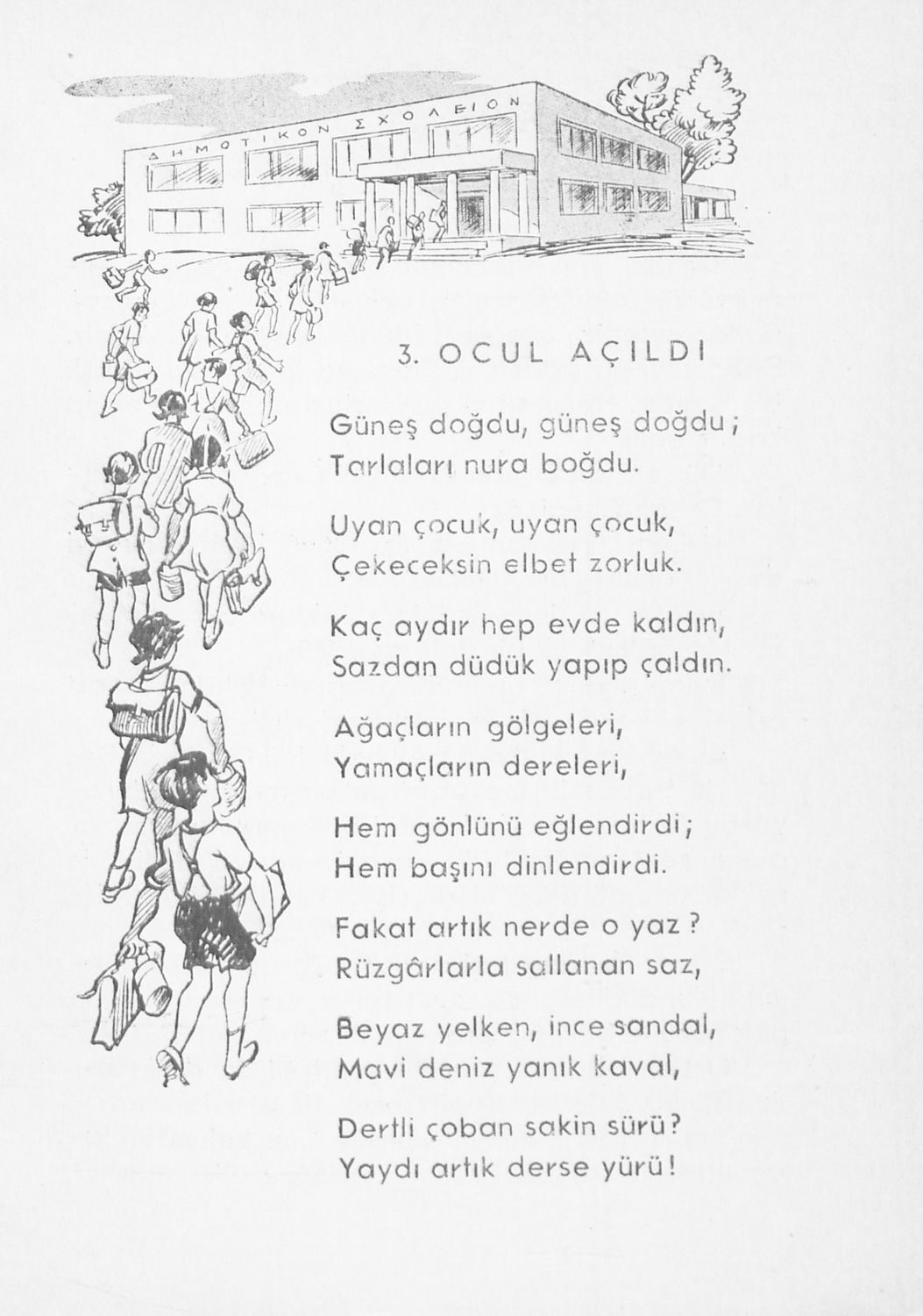 Αναγνωστικό για τους μαθητές της Γ΄ τάξης των Μουσουλμανικών Σχολείων που περιέχει κείμενα στα τουρκικά από την κοινωνική και την οικογενειακή ζωή και το φυσικό περιβάλλον.