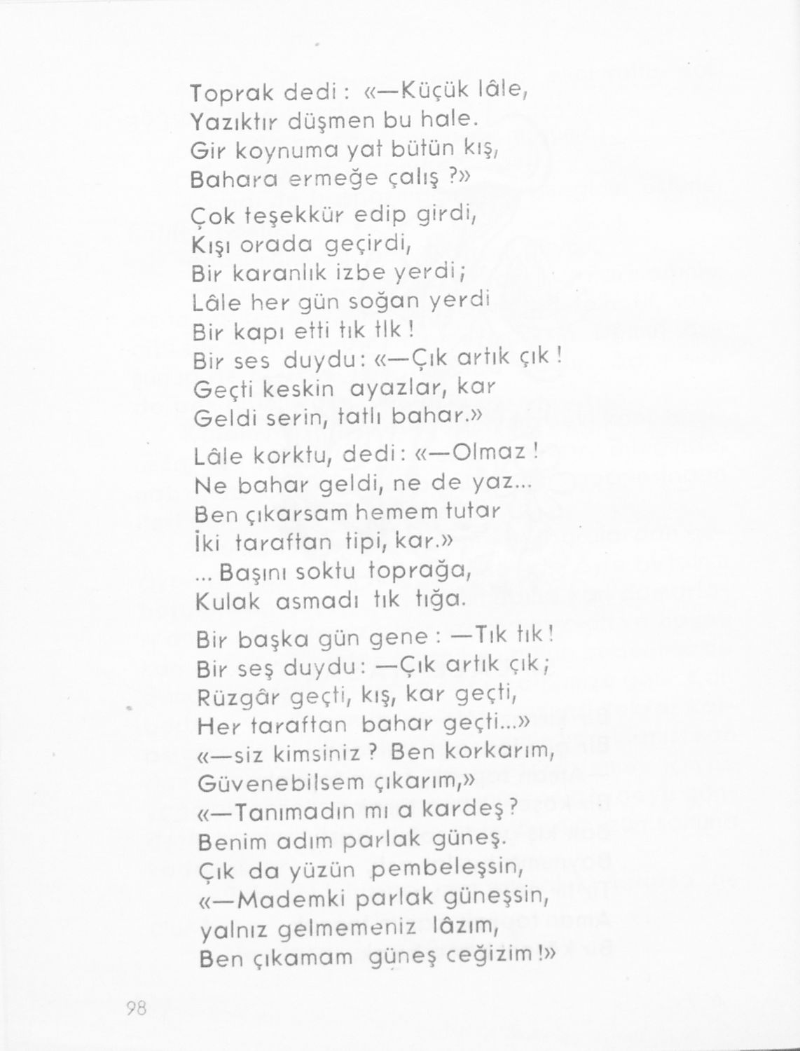 Αναγνωστικό για τους μαθητές της Δ΄ τάξης των Μουσουλμανικών Σχολείων που περιέχει κείμενα στα τουρκικά εμπνευσμένα από την κοινωνική και την οικογενειακή ζωή και το φυσικό περιβάλλον.
