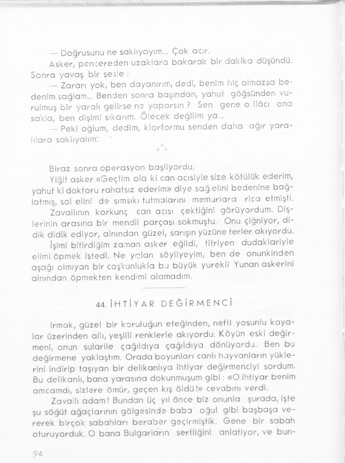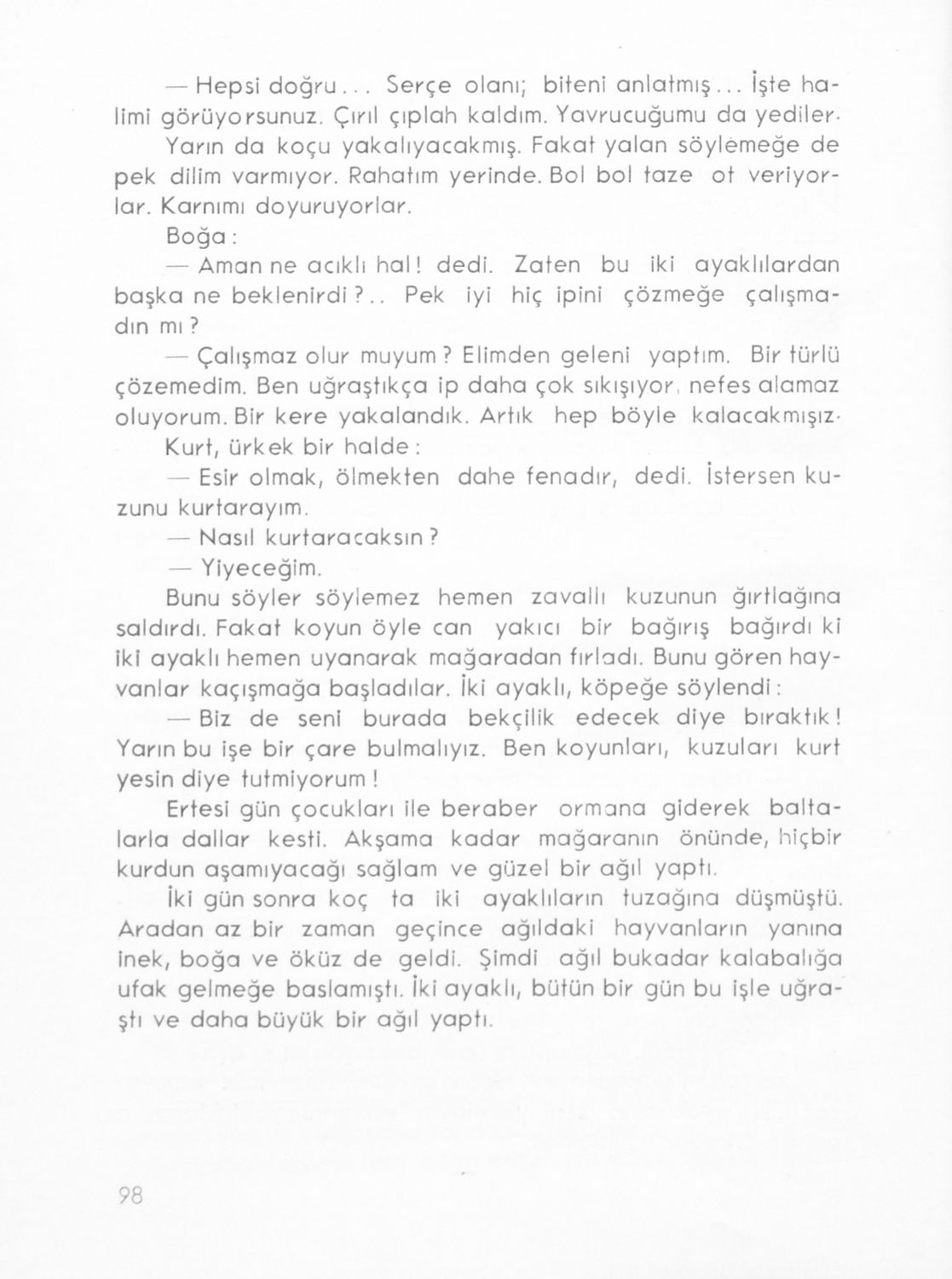 Αναγνωστικό για τους μαθητές της Δ' τάξης των Μουσουλμανικών Σχολείων που περιέχει κείμενα στα τουρκικά από την κοινωνική και την οικογενειακή ζωή και το φυσικό περιβάλλον.