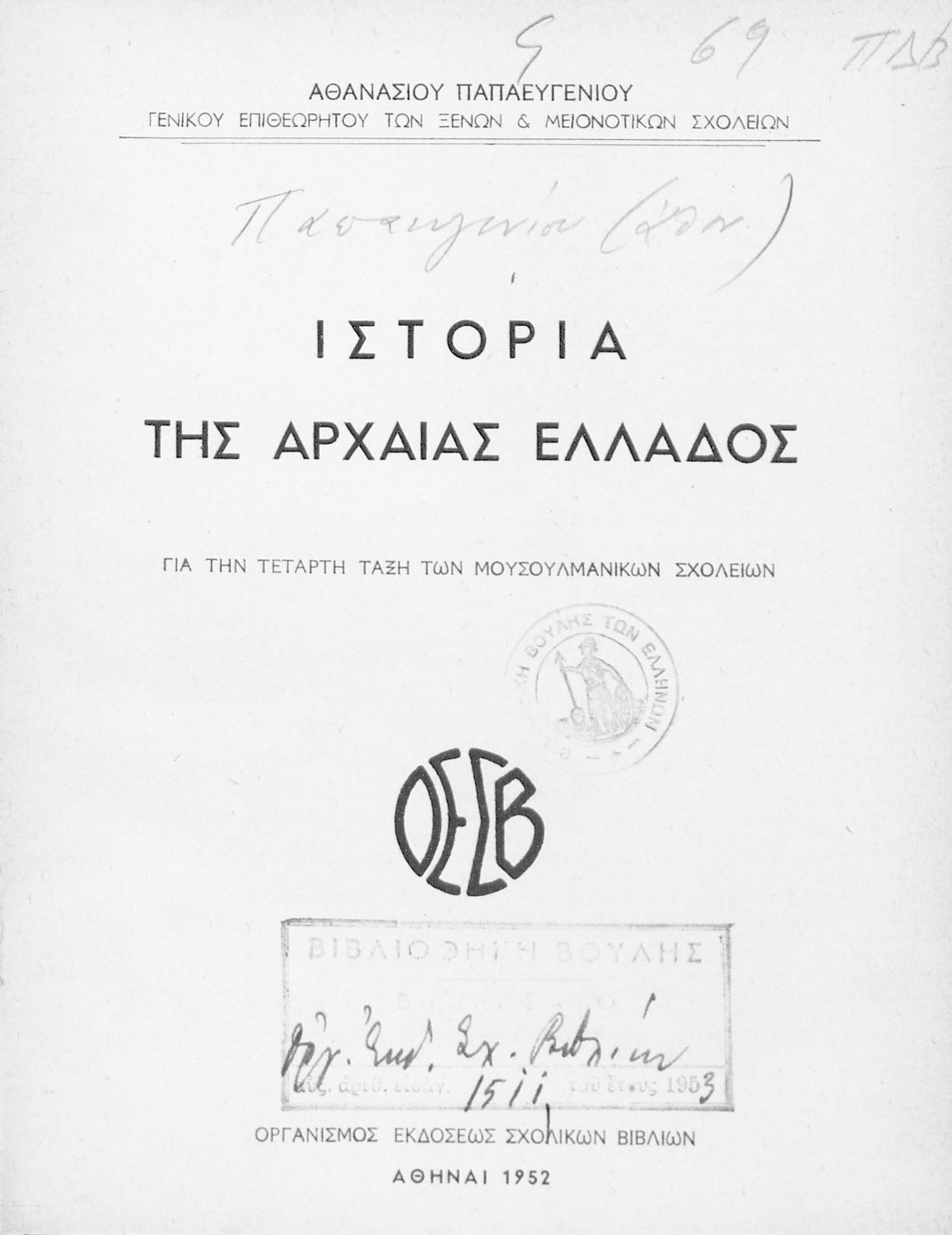 Σχολικό εγχειρίδιο Ιστορίας Δ΄ τάξη των μουσουλμανικών σχολείων που εστιάζει στην κοινωνική και πολιτική ζωή στην περίοδο της κλασσικής αρχαιότητας. / Σχολικό εγχειρίδιο Γεωγραφίας για τους μαθητές της Δ΄ τάξης Δημοτικού των μουσουλμανικών σχολείων που παρουσιάζει τα διαμερίσματα της Ελλάδας από πληθυσμιακή και γεωμορφολογική άποψη.