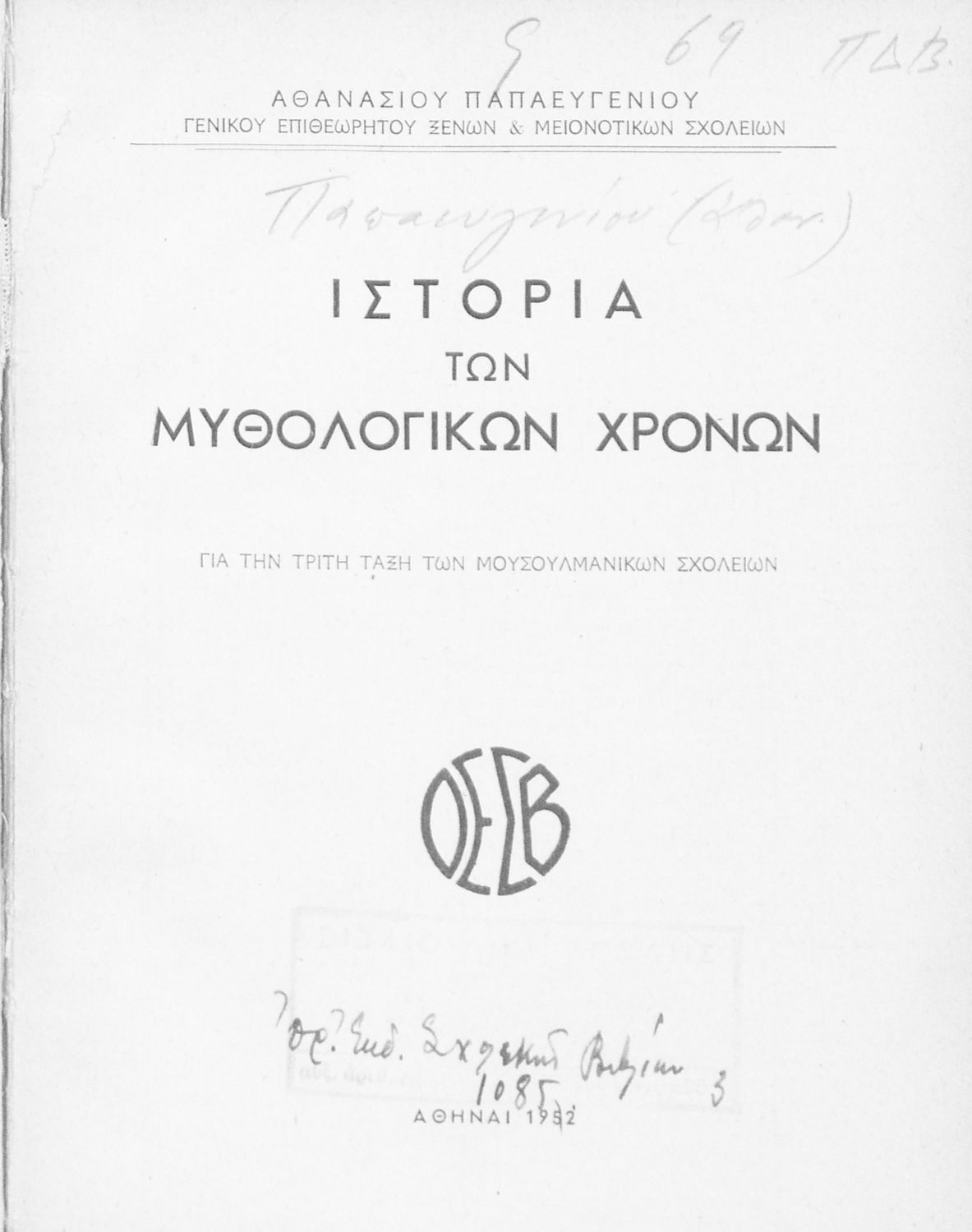 Τίτλος: Ιστορία των μυθολογικών χρόνων για την τρίτη τάξη των μουσουλμανικών σχολείων / Η Ελλάδα μας Μέρος Α΄ Γεωγραφία για την τρίτη τάξη των μουσουλμ. Σχολείων