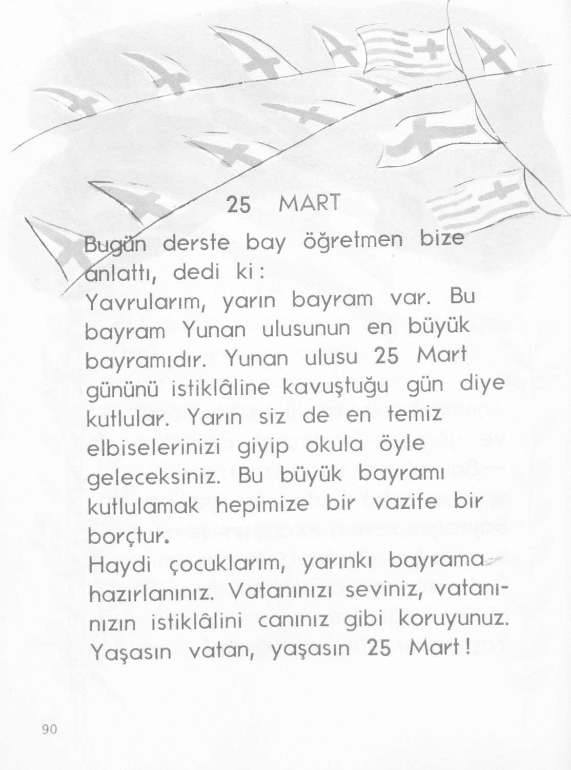 Αναγνωστικό για τους μαθητές της Δ' τάξης των Μουσουλμανικών Σχολείων που περιέχει κείμενα στα τουρκικά από την κοινωνική και την οικογενειακή ζωή και το φυσικό περιβάλλον.