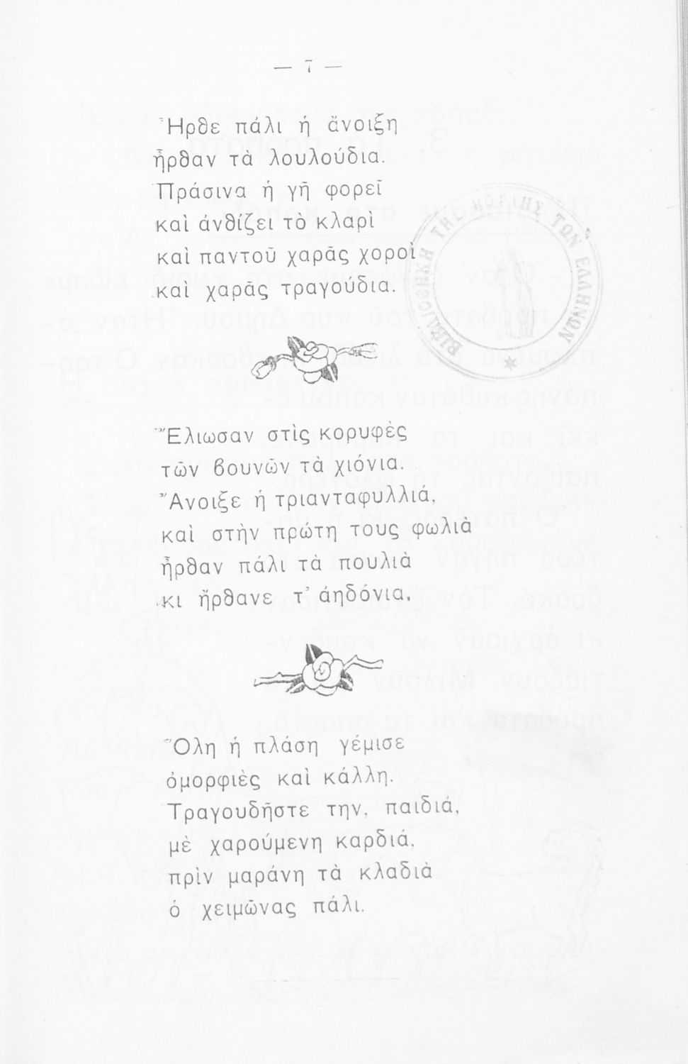 Αναγνωστικό που περιλαμβάνει πεζά και ποιήματα της νέας ελληνικής λογοτεχνίας για τους μαθητές του Δημοτικού. Το βιβλίο είναι αφιερωμένο στη μνήμη του Ζαχαρία Παπαντωνίου και αναδημοσιεύει αρκετά κείμενα από ...