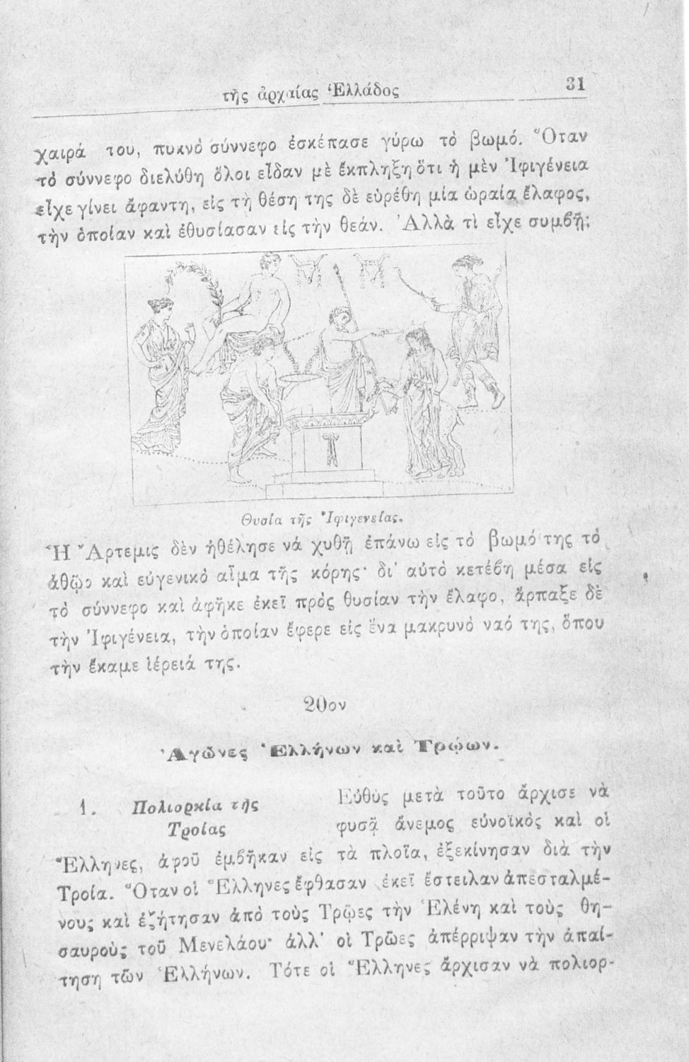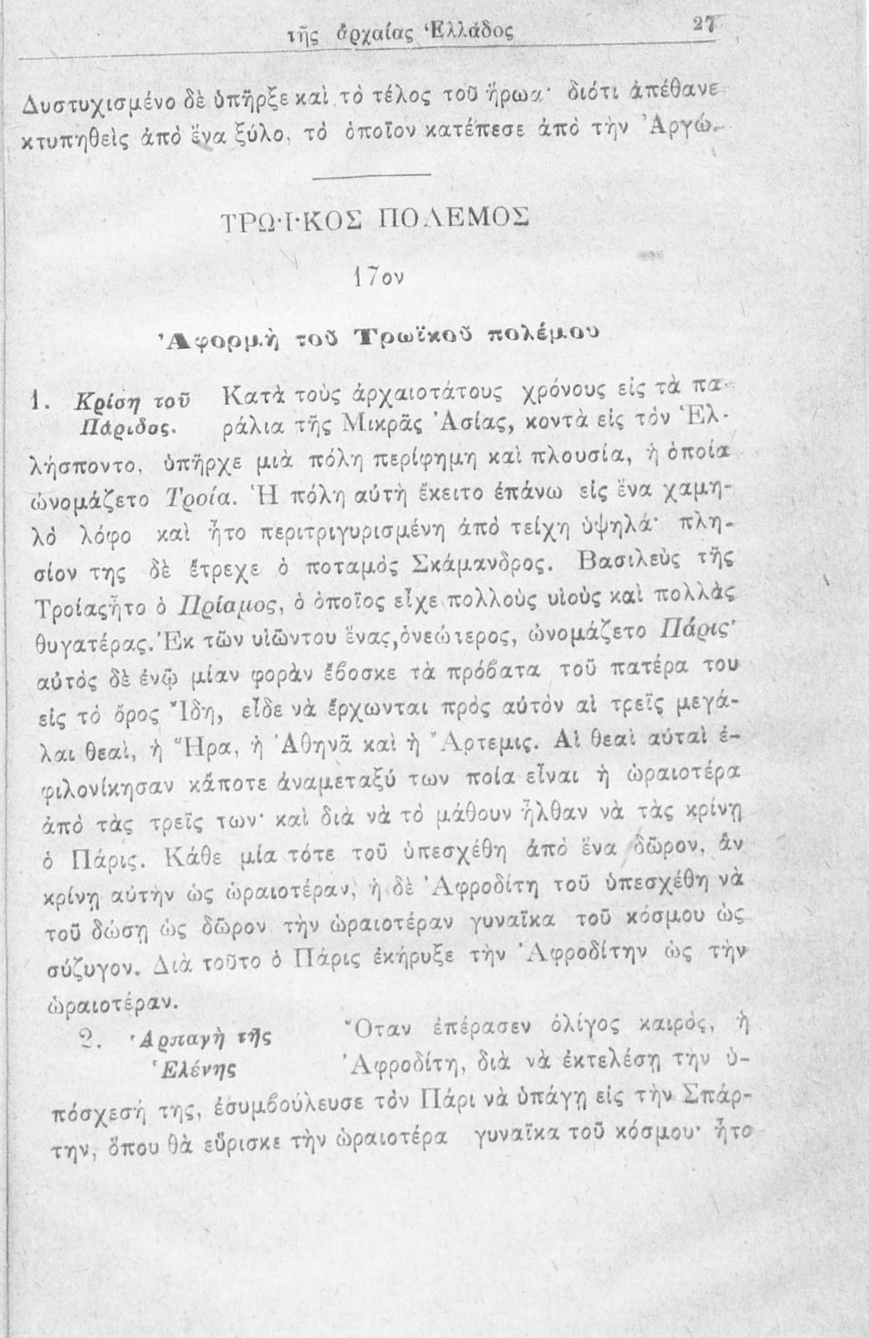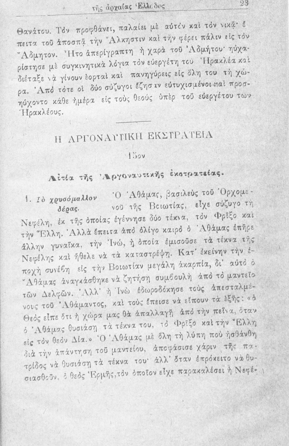 Σχολικό εγχειρίδιο Αρχαίων Ελληνικών για τις Α' Ελληνικού Σχολείου και Παρθεναγωγείου και την Ε΄ Δημοτικού που περιέχει κείμενα στην αρχαία ελληνική εμπνευσμένα από την ελληνική μυθολογία, και γραμματικές, ...