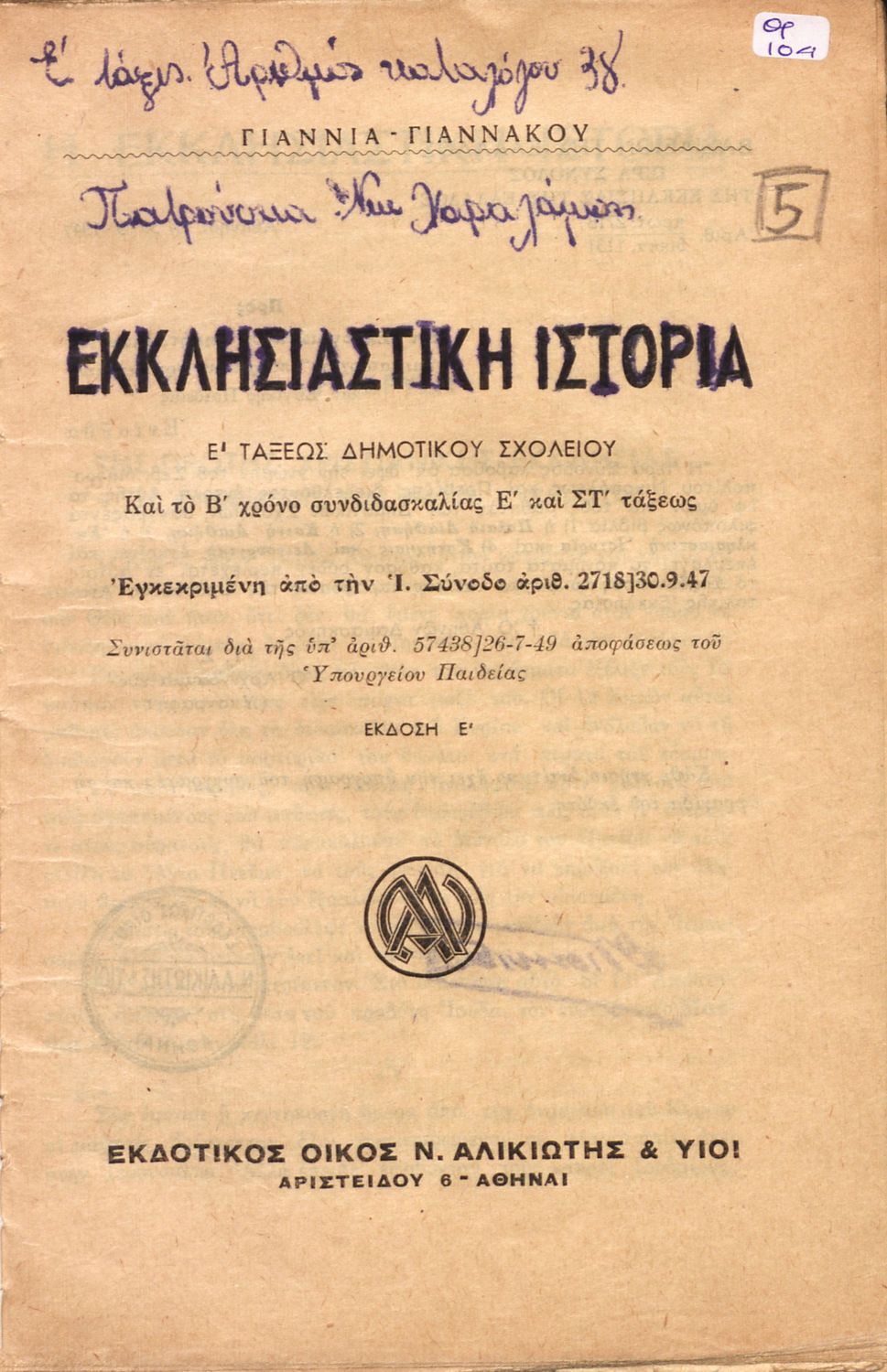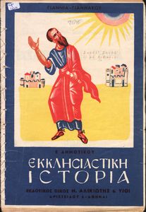 Κωδικός αναγνώρισης: 04-00005 Τίτλος: Εκκλησιαστική Ιστορία Ε΄ τάξεως Δημοτικού Σχολείου και το β΄ χρόνο συνδιδασκαλίας Ε΄ και ΣΤ΄ τάξεως Συγγραφέας: Δημ. Γιαννιάς, Δημ. Γιαννάκος Μέγεθος και υπόστρωμα: Μαθητικό βοήθημα, 22εκ., μαλακό εξώφυλλο, 80 σελίδες. Εξώφυλλο (έγχρωμο), εικόνες (ασπρόμαυρες). |