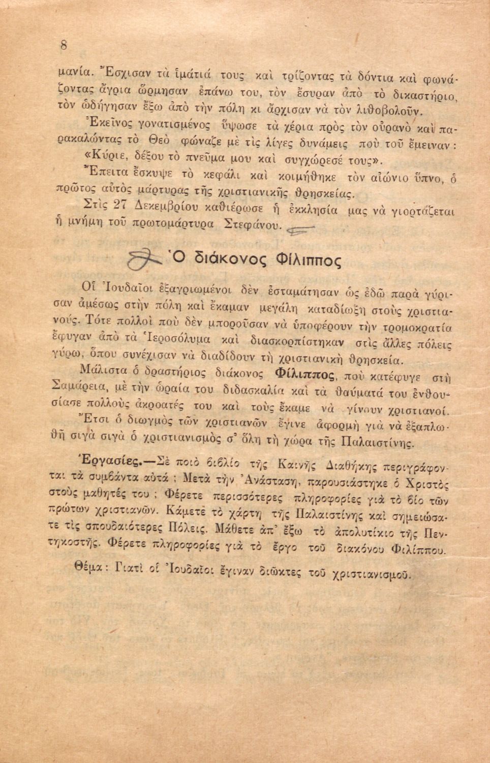 Βαθμίδα εκπαίδευσης: Πρωτοβάθμια Τάξη: Ε' Δημοτικού Μάθημα: Θρησκευτικά Γλώσσα: Δημοτική με στοιχεία καθαρεύουσας Παρουσίαση περιεχομένου: Μαθητικό βοήθημα Θρησκευτικών Ε΄ Δημοτικού που αποτελεί μια ιστορική επισκόπηση της Ορθόδοξης Εκκλησίας από την ίδρυσή της μέχρι την ίδρυση της Εκκλησίας της Ελλάδας. |