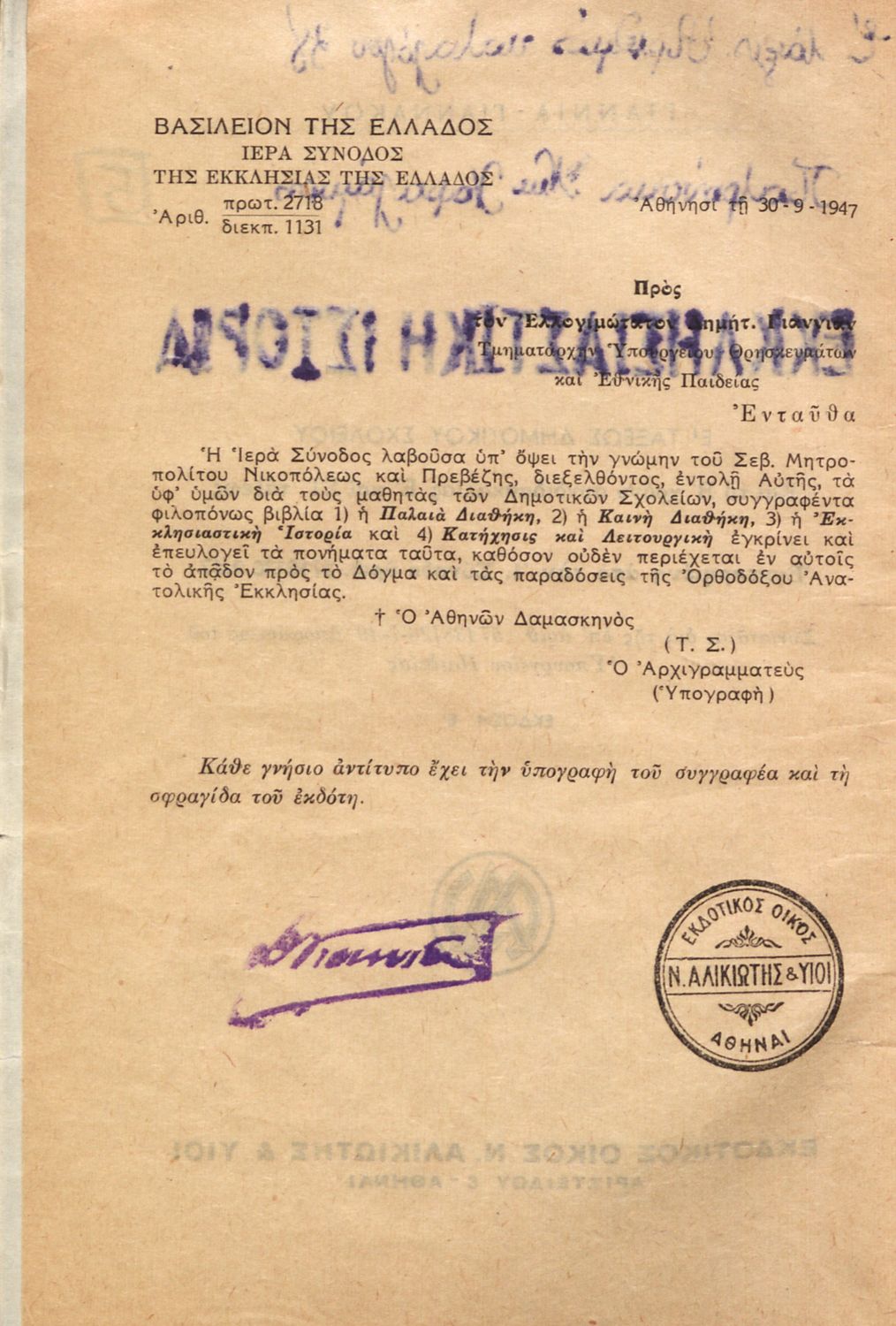 Εκδότης: Ν. Αλικιώτης Τόπος έκδοσης: Αθήνα Έκδοση: 5η Υπουργική απόφαση / Σύμβαση: 57438/26-7-1949 Έτος έγκρισης: 1949 |