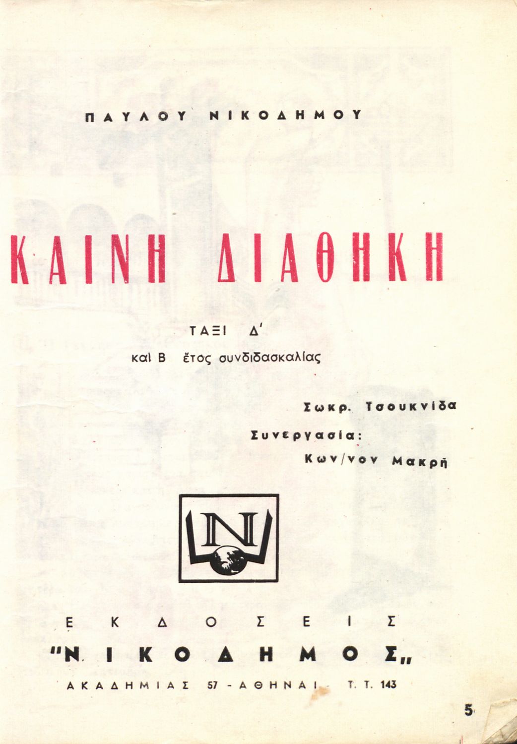 Κωδικός αναγνώρισης: 04-00009 Τίτλος: Καινή Διαθήκη τάξι Δ΄ και Β΄ έτος συνδιδασκαλίας Συγγραφέας: Παύλος Νικόδημος Μέγεθος και υπόστρωμα: Μαθητικό βοήθημα, 20εκ., μαλακό εξώφυλλο, 100 σελίδες. Σκίτσα (ασπρόμαυρα), εικόνες (ασπρόμαυρες), εξώφυλλο (έγχρωμο). |