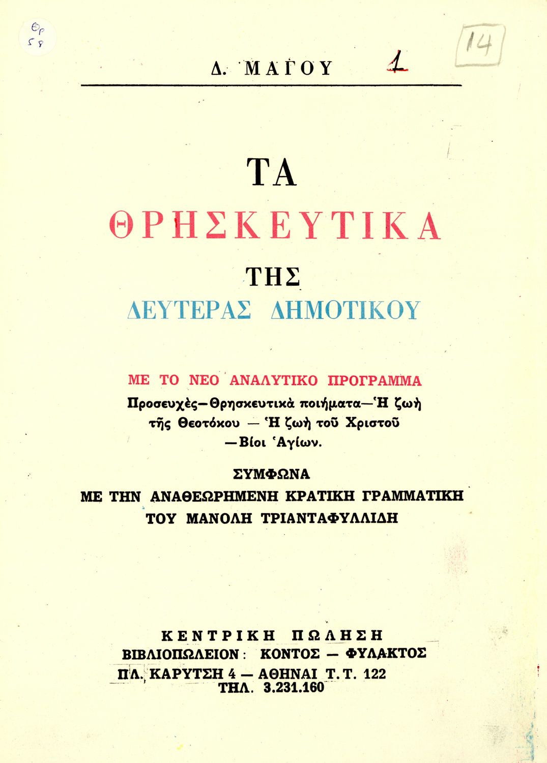Εντοπισμός πρωτοτύπου: Εθνικό Κέντρο Έρευνας και Διάσωσης Σχολικού Υλικού Κωδικός βιβλιοθήκης: 14 |