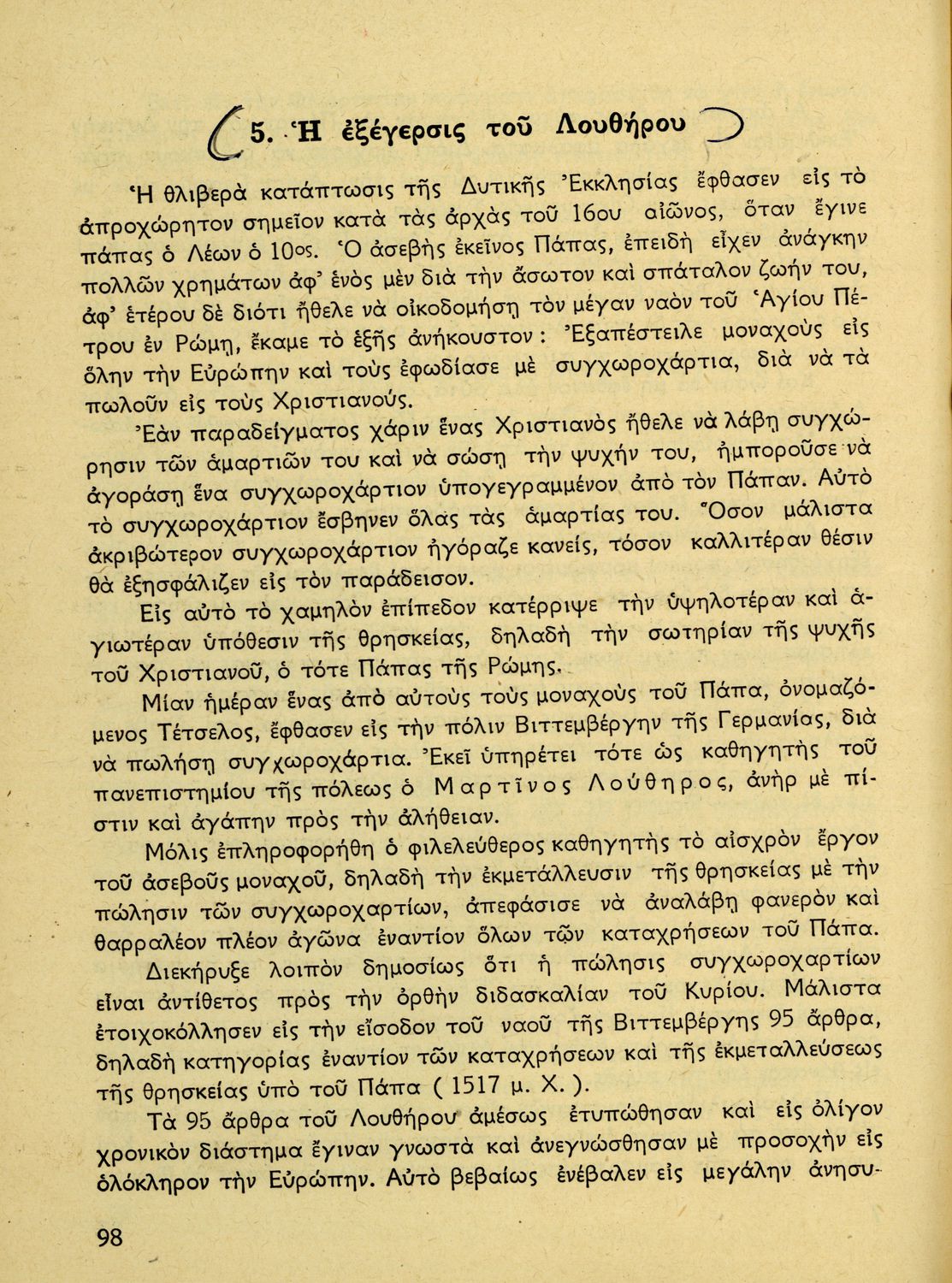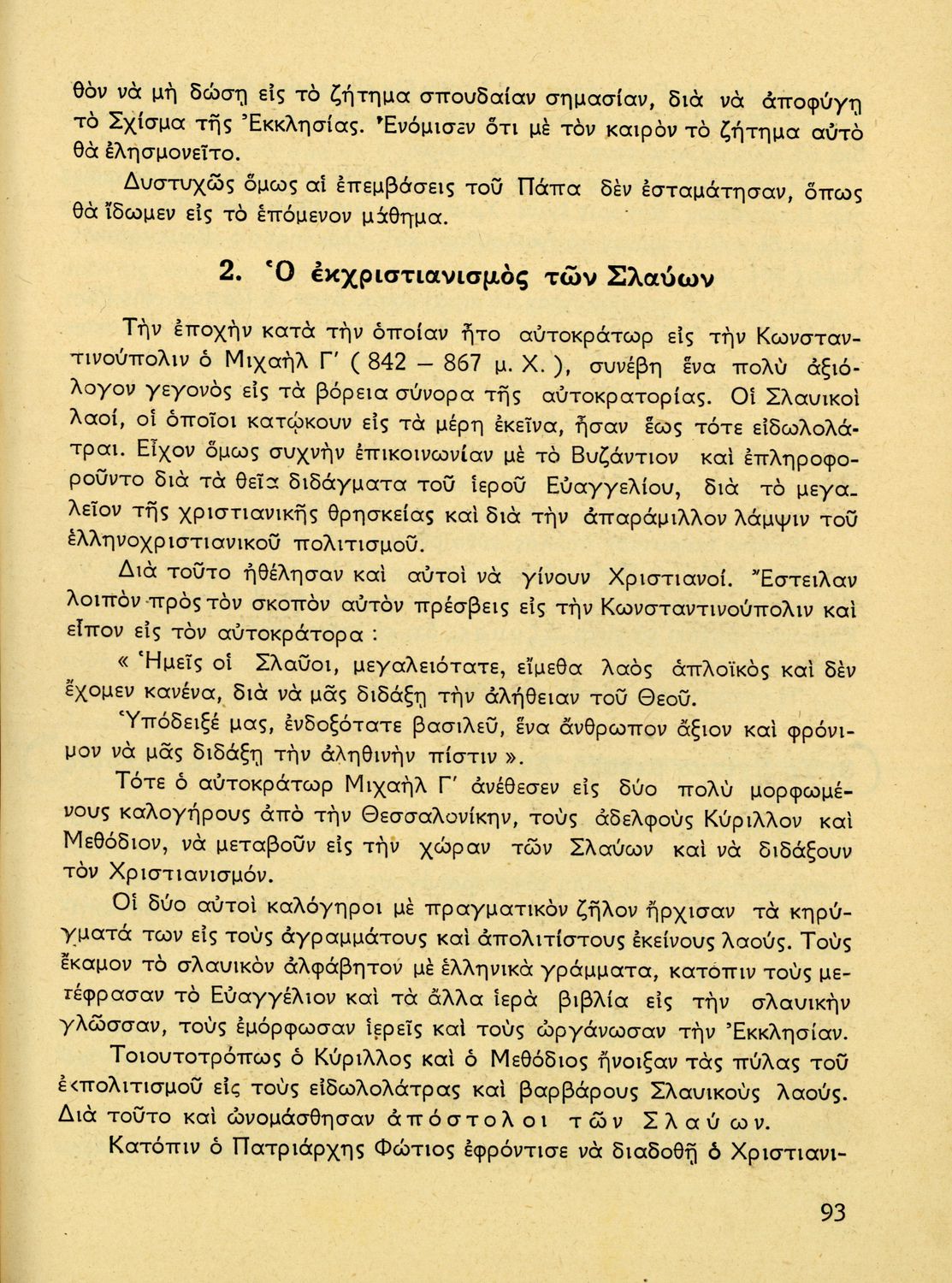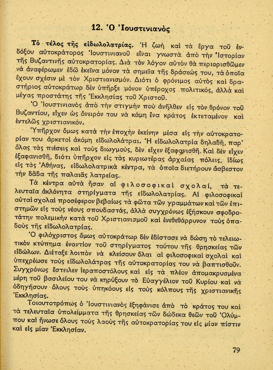 Βαθμίδα εκπαίδευσης: Πρωτοβάθμια Τάξη: Ε' Δημοτικού Μάθημα: Θρησκευτικά Γλώσσα: Απλή καθαρεύουσα Παρουσίαση περιεχομένου: Μαθητικό βοήθημα Θρησκευτικών Ε΄ Δημοτικού που αποτελεί μια ιστορική επισκόπηση της Ορθόδοξης Εκκλησίας από την ιδρυσή της μέχρι την ίδρυση της Εκκλησίας της Ελλάδας. |