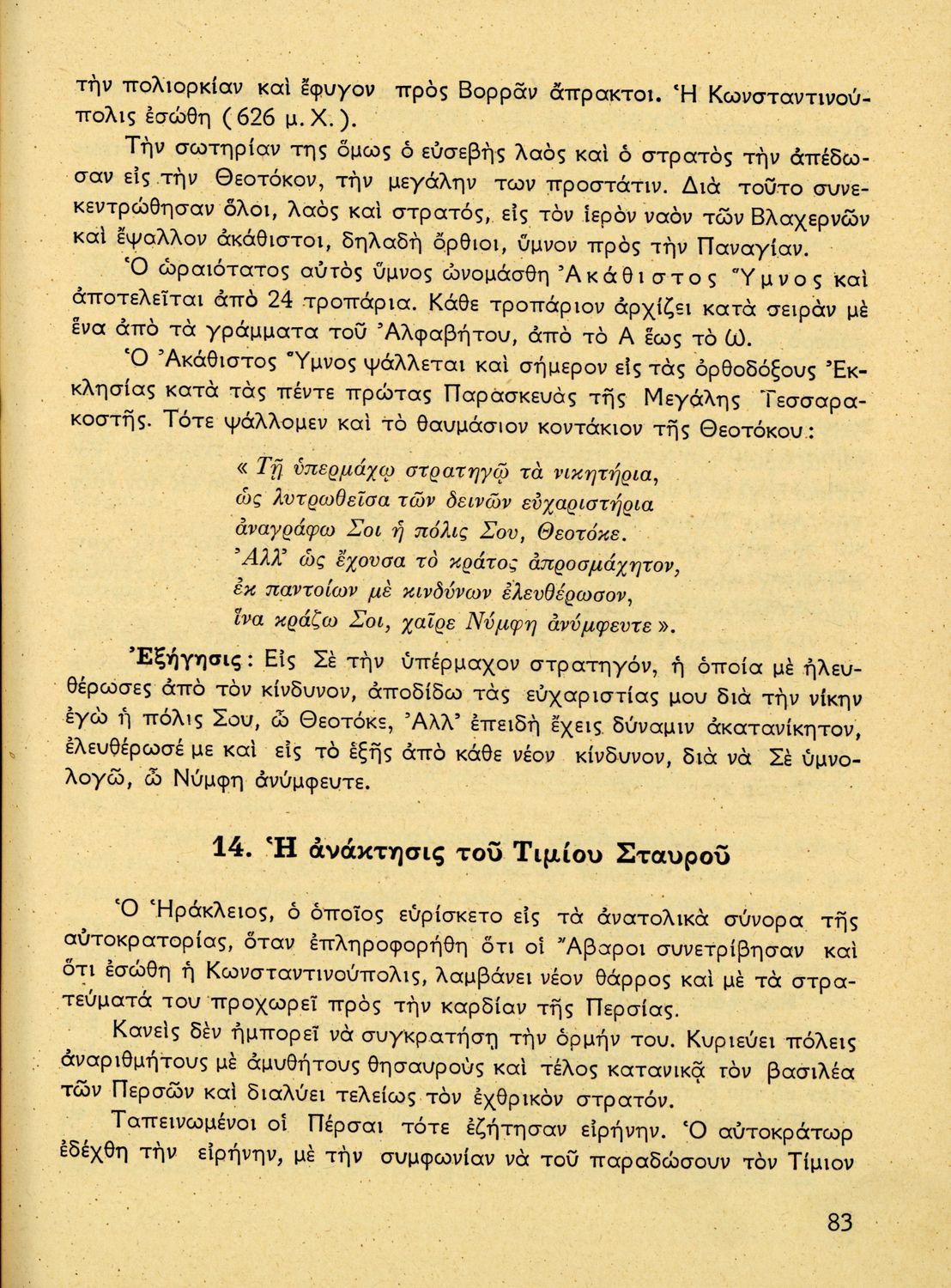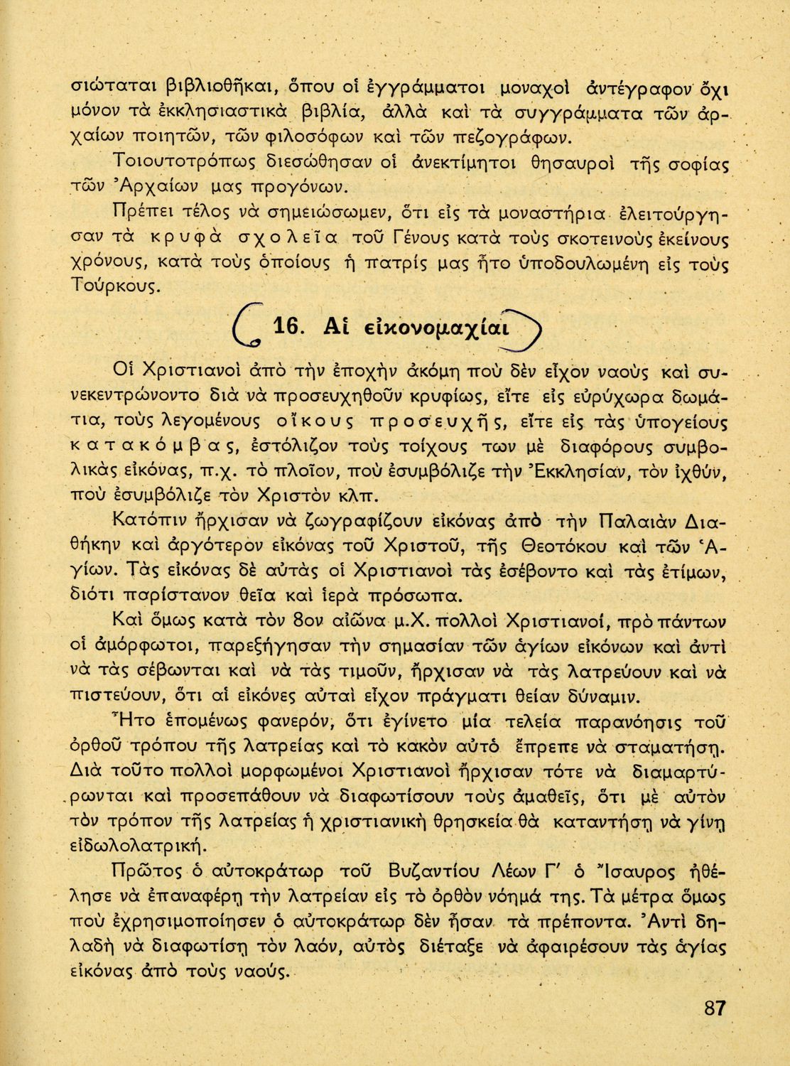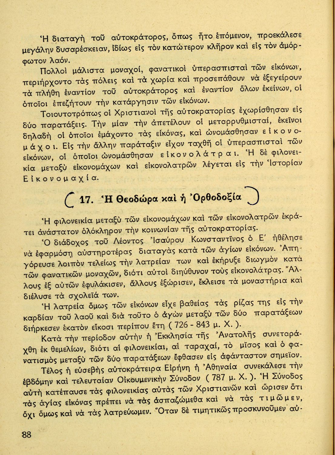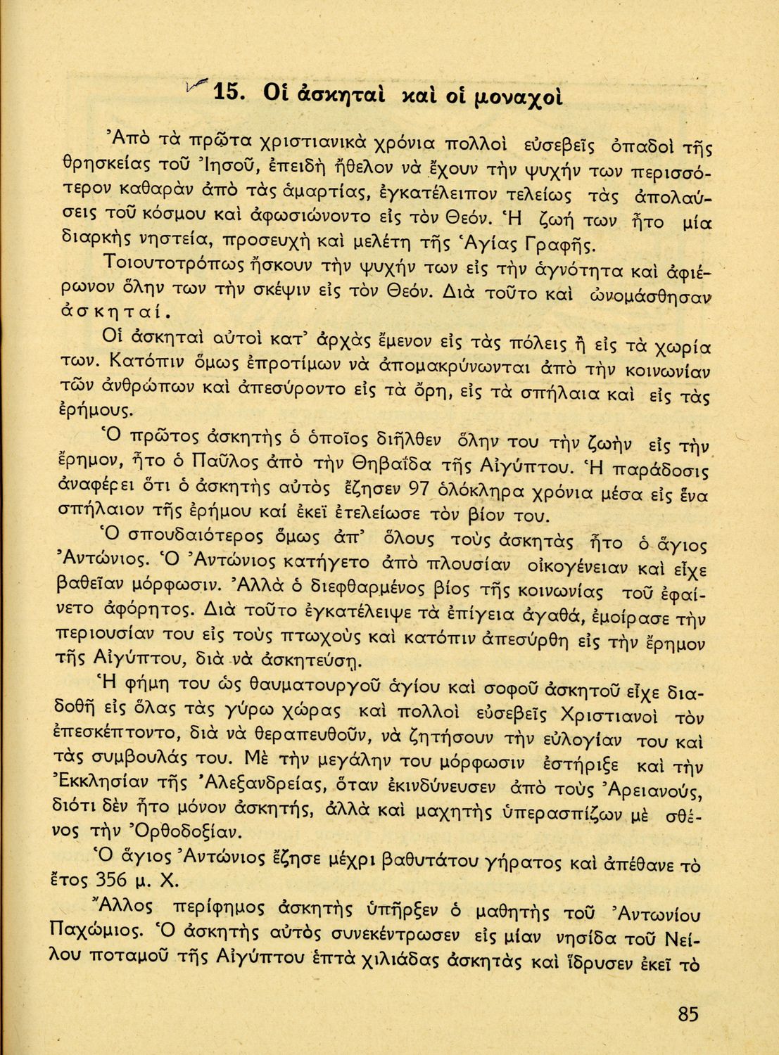 Βαθμίδα εκπαίδευσης: Πρωτοβάθμια Τάξη: Ε' Δημοτικού Μάθημα: Θρησκευτικά Γλώσσα: Απλή καθαρεύουσα Παρουσίαση περιεχομένου: Μαθητικό βοήθημα Θρησκευτικών Ε΄ Δημοτικού που αποτελεί μια ιστορική επισκόπηση της Ορθόδοξης Εκκλησίας από την ιδρυσή της μέχρι την ίδρυση της Εκκλησίας της Ελλάδας. |