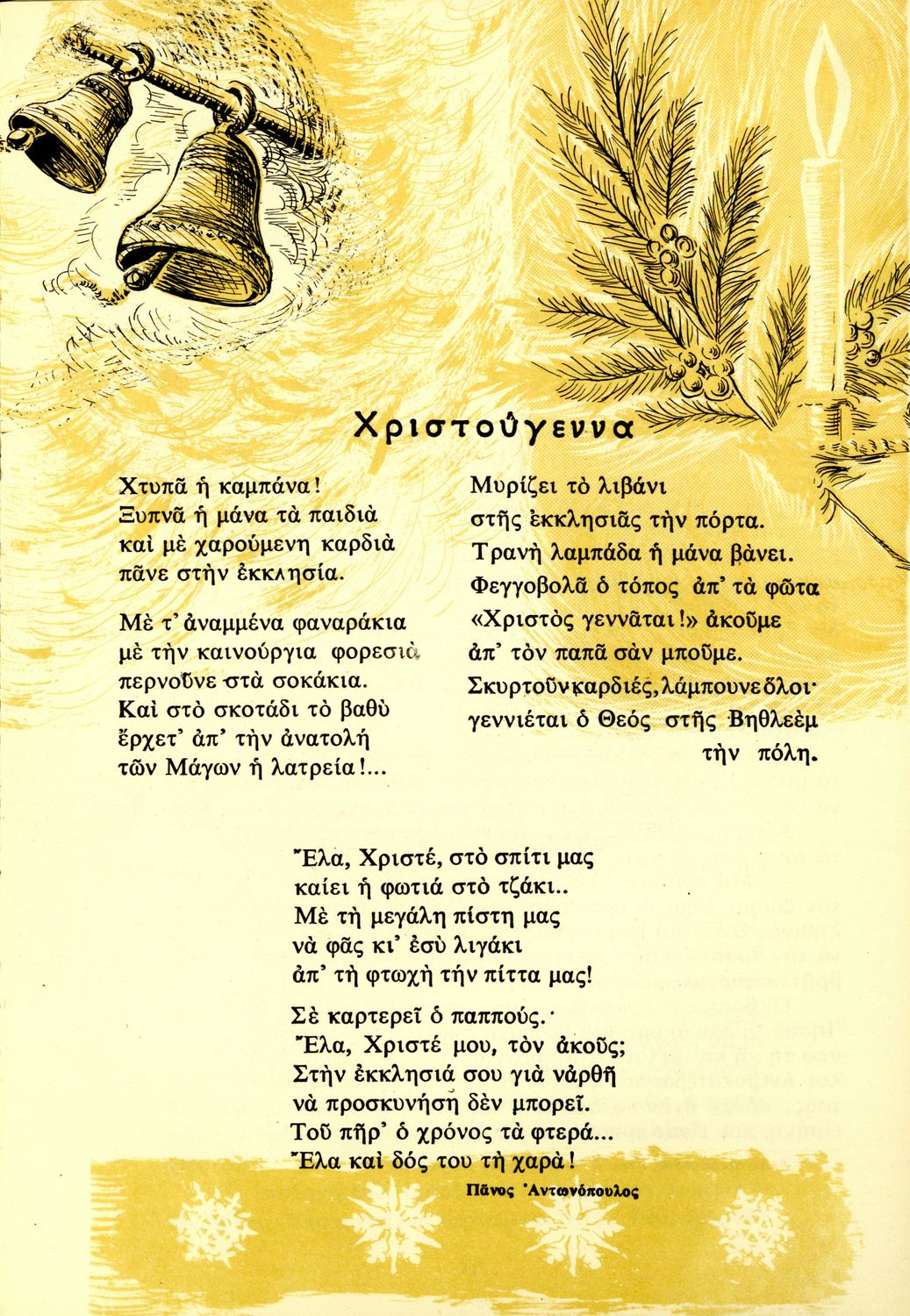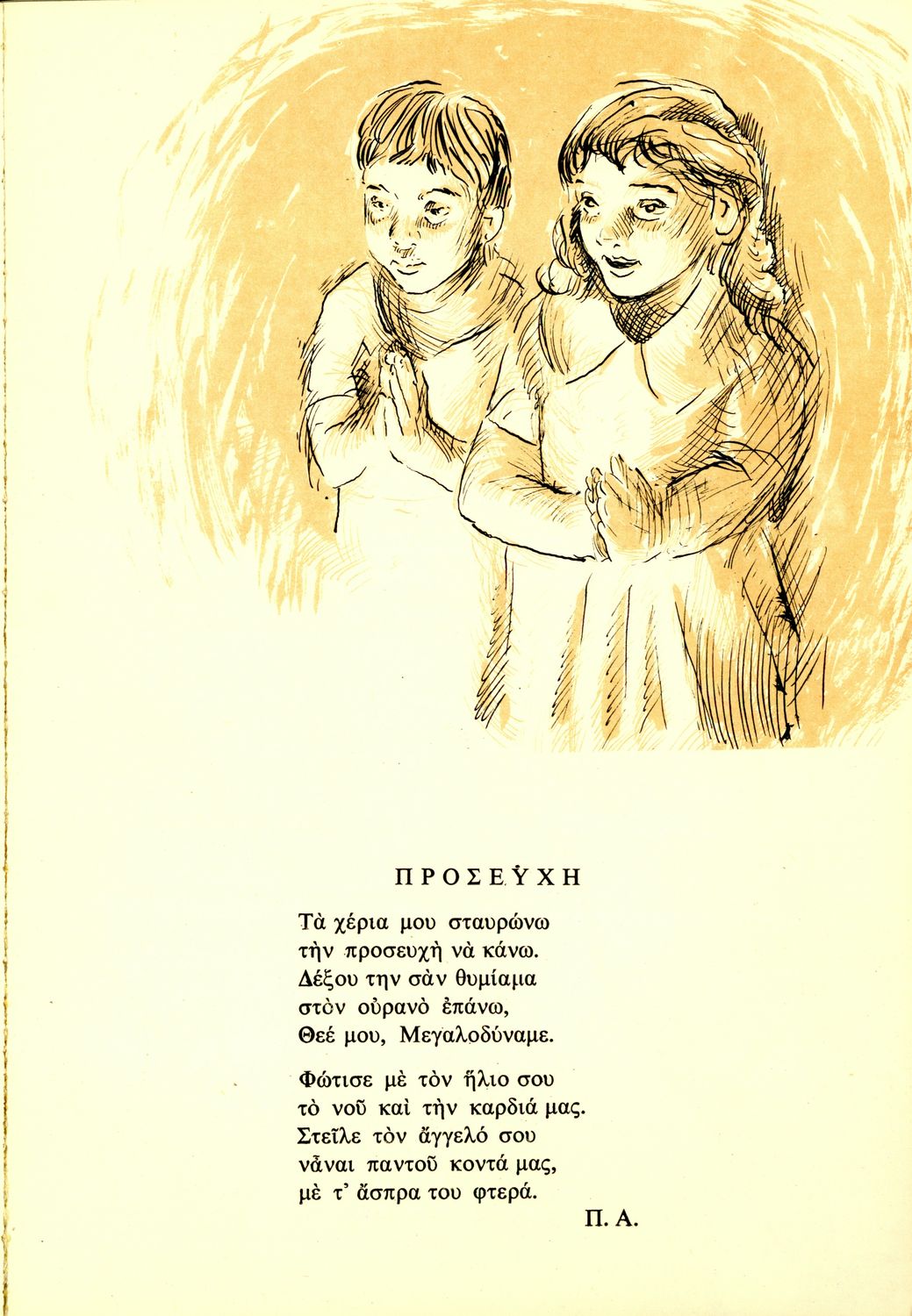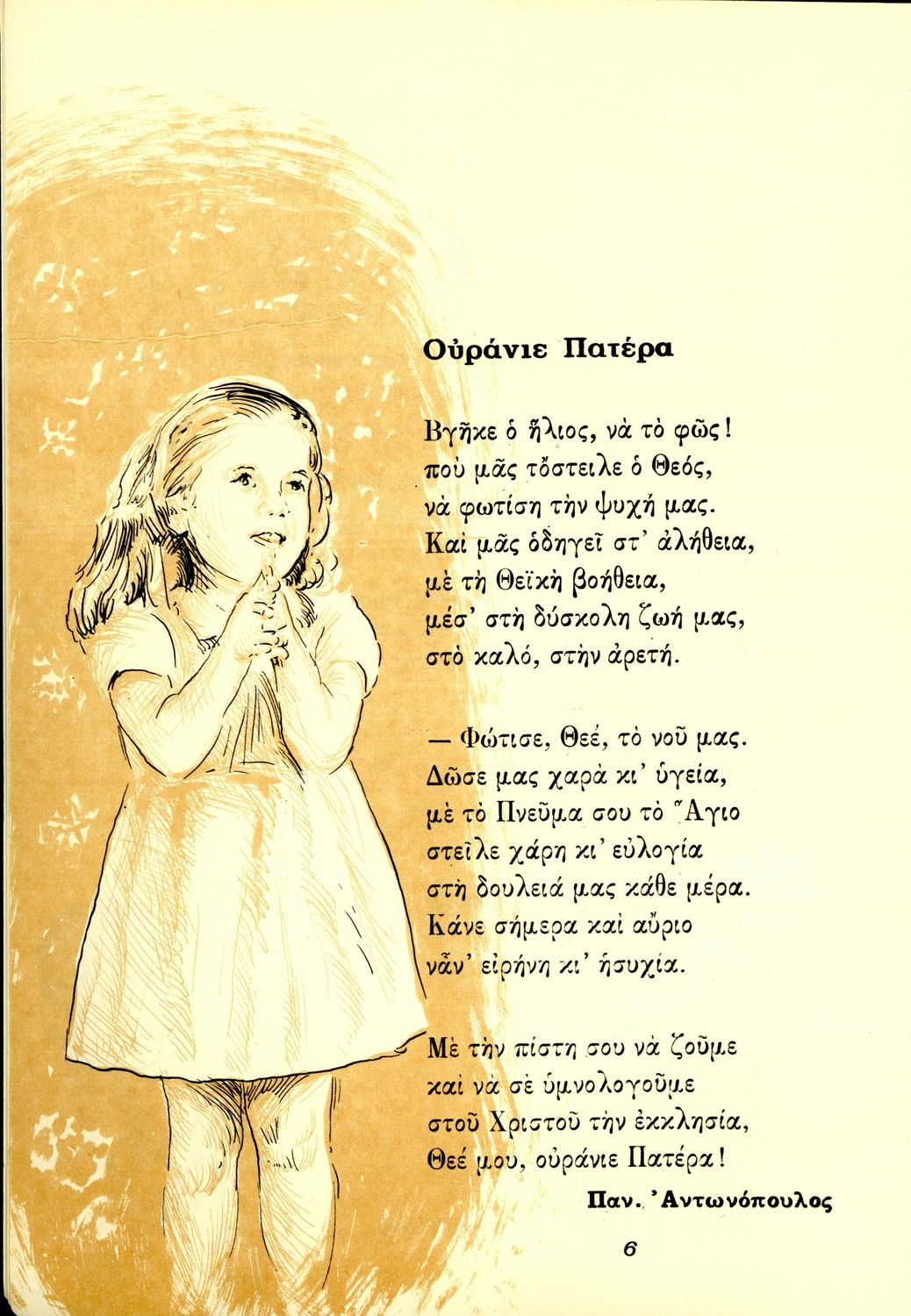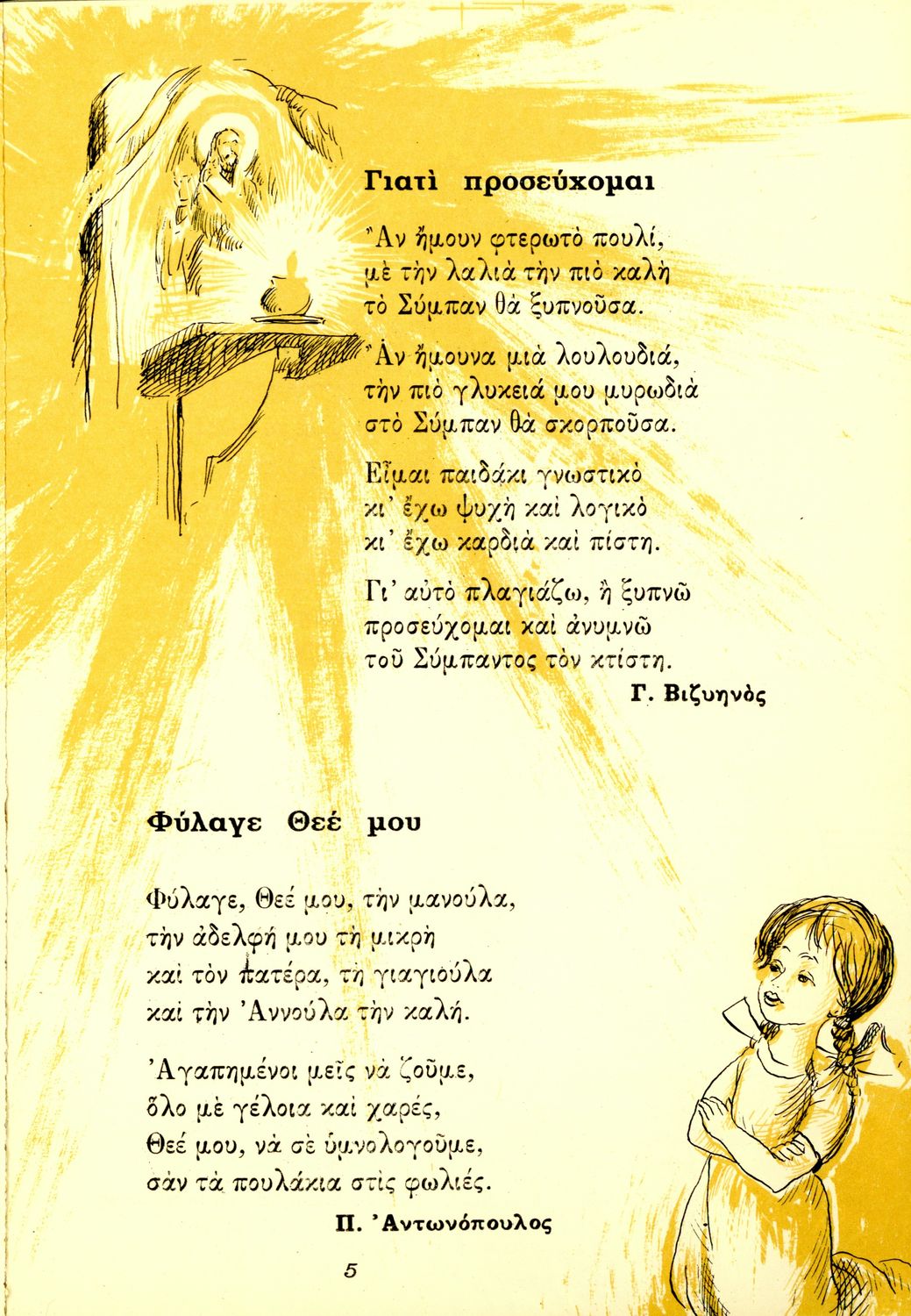 Μαθητικό βοήθημα Θρησκευτικών Α΄ και Β΄ Δημοτικού που περιλαμβάνει ποιήματα και πεζά χριστιανικού περιεχομένου. Φέρει την έγκριση της Ιεράς Συνόδου.