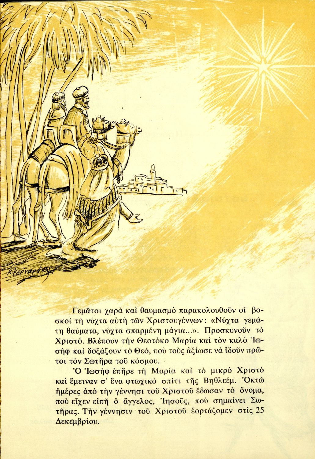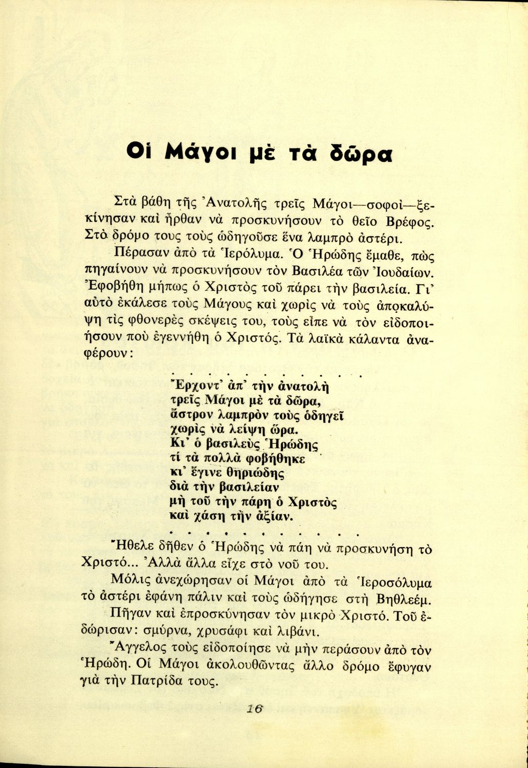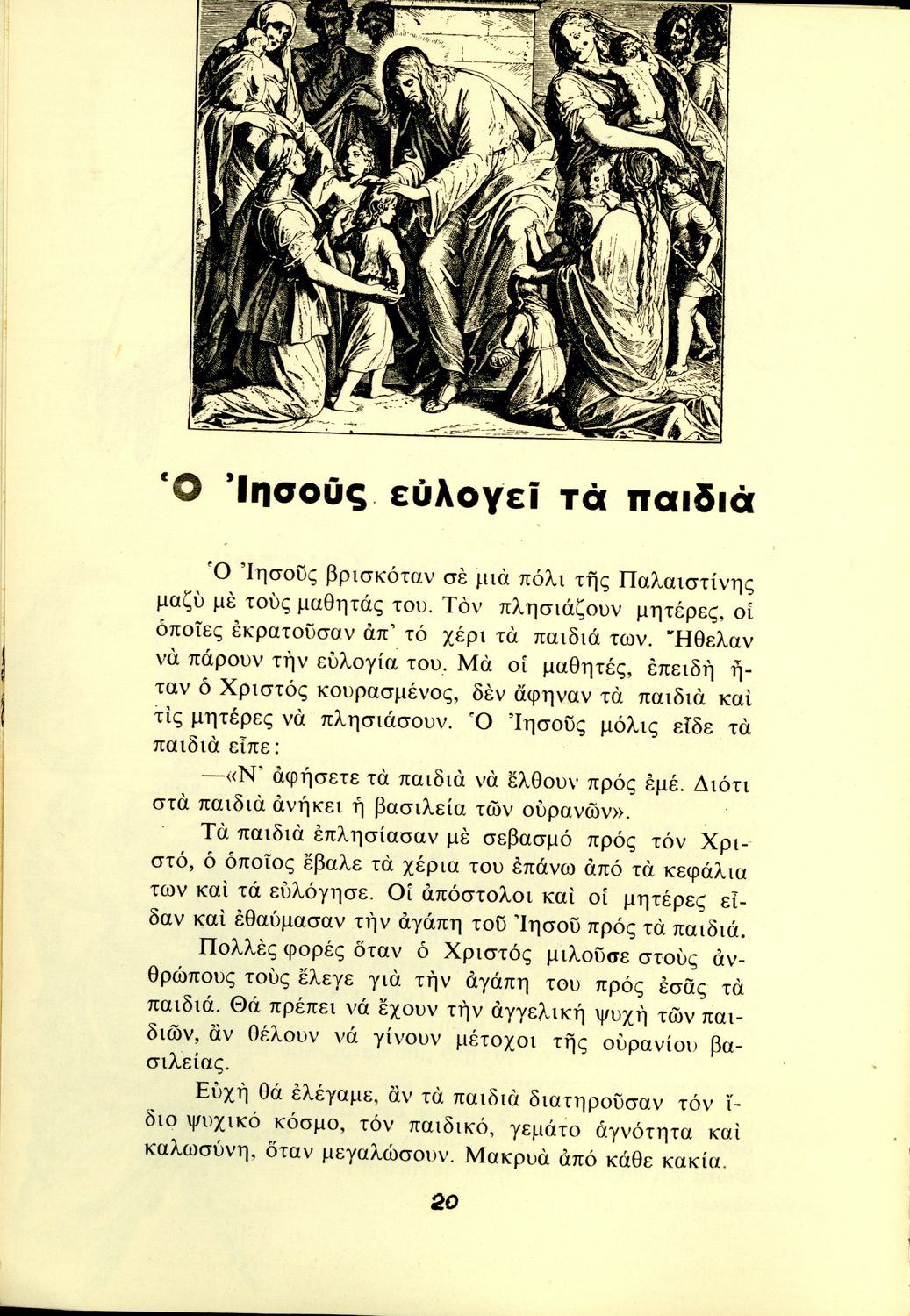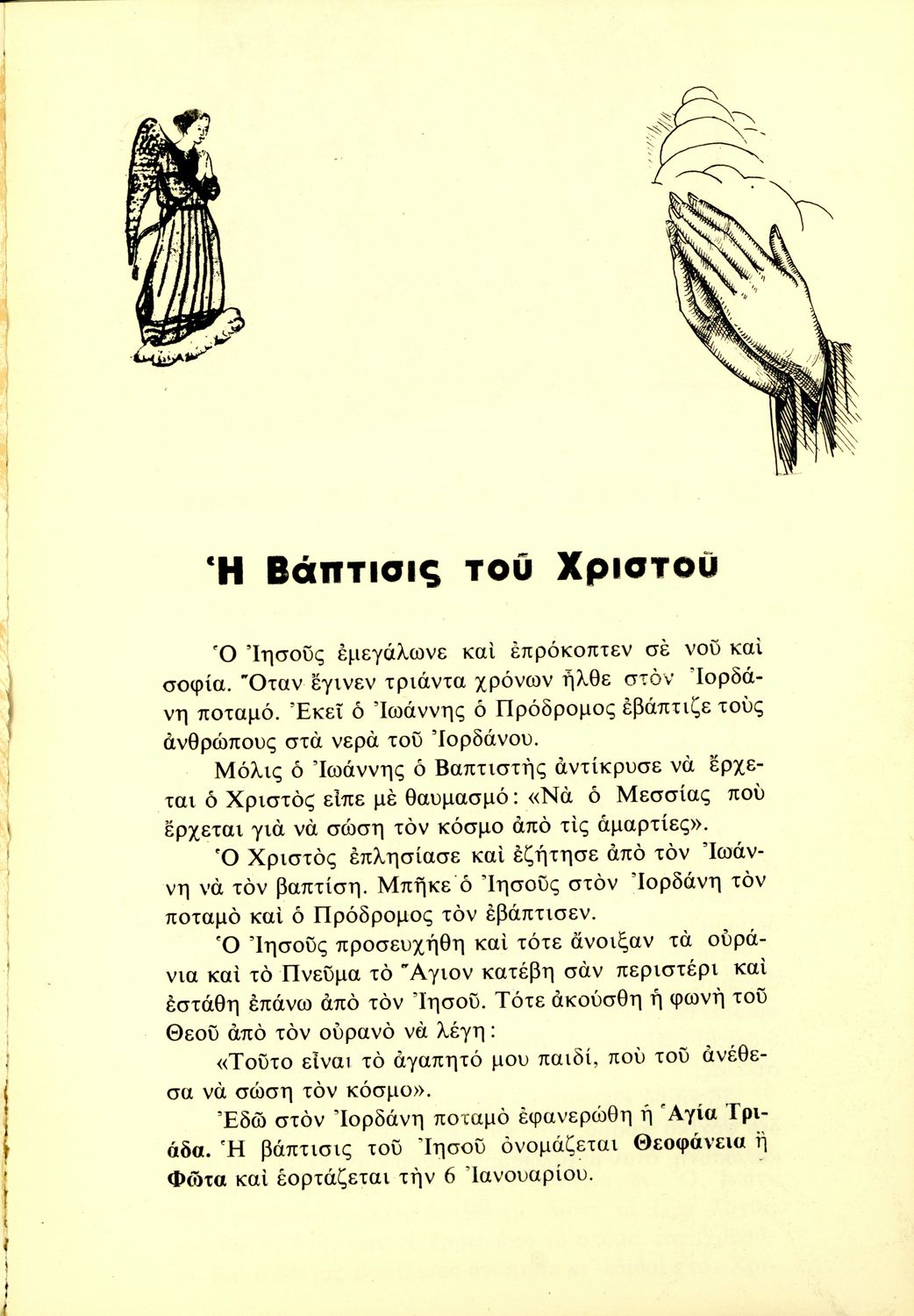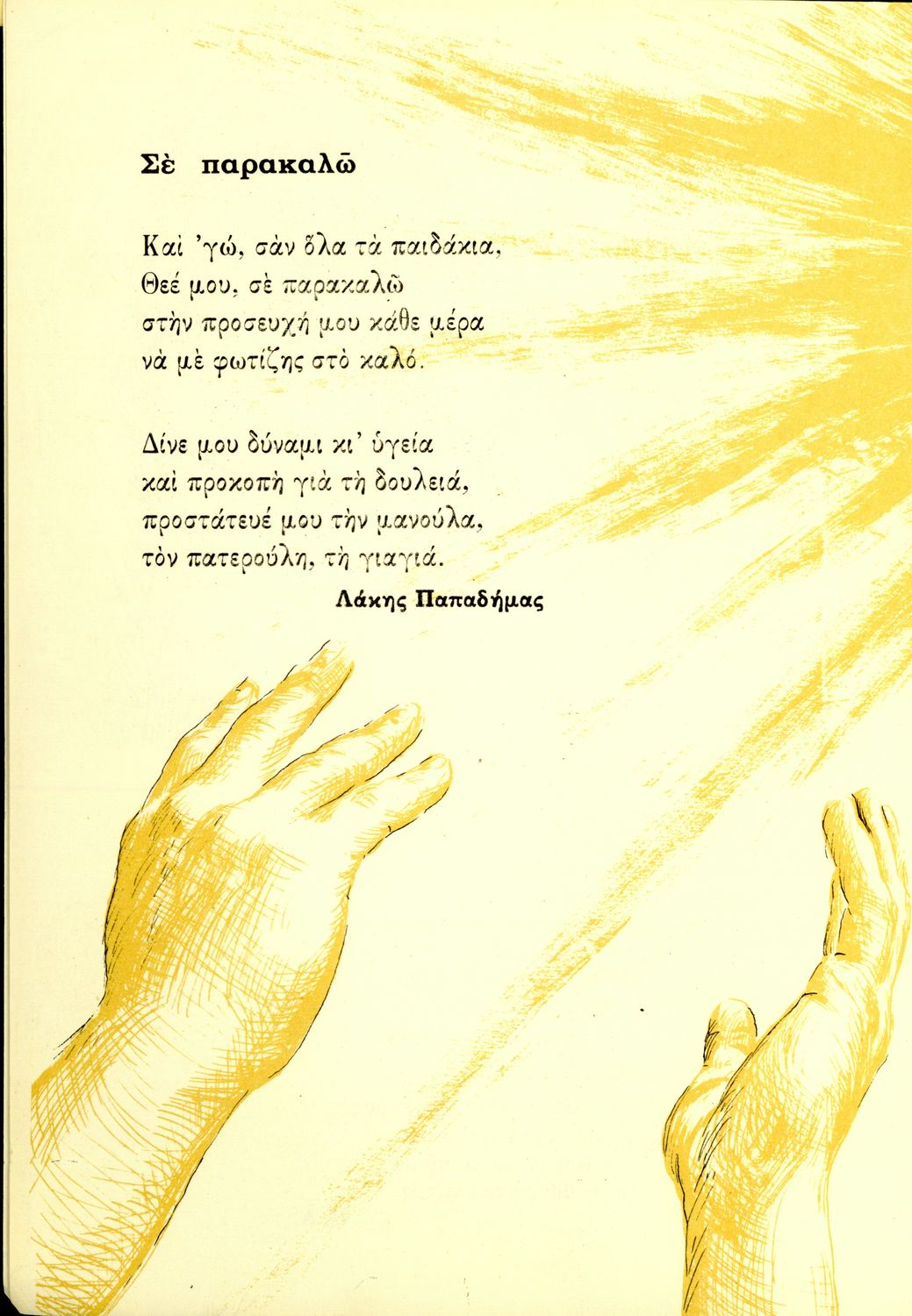 Μαθητικό βοήθημα Θρησκευτικών Α΄ και Β΄ Δημοτικού που περιλαμβάνει ποιήματα και πεζά χριστιανικού περιεχομένου. Φέρει την έγκριση της Ιεράς Συνόδου.