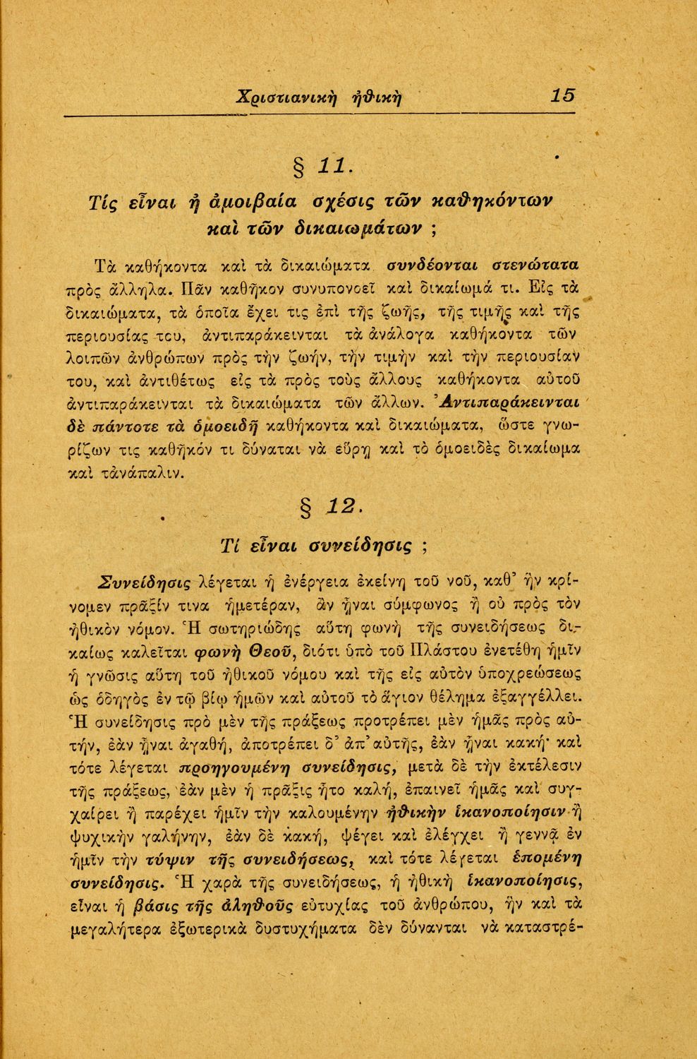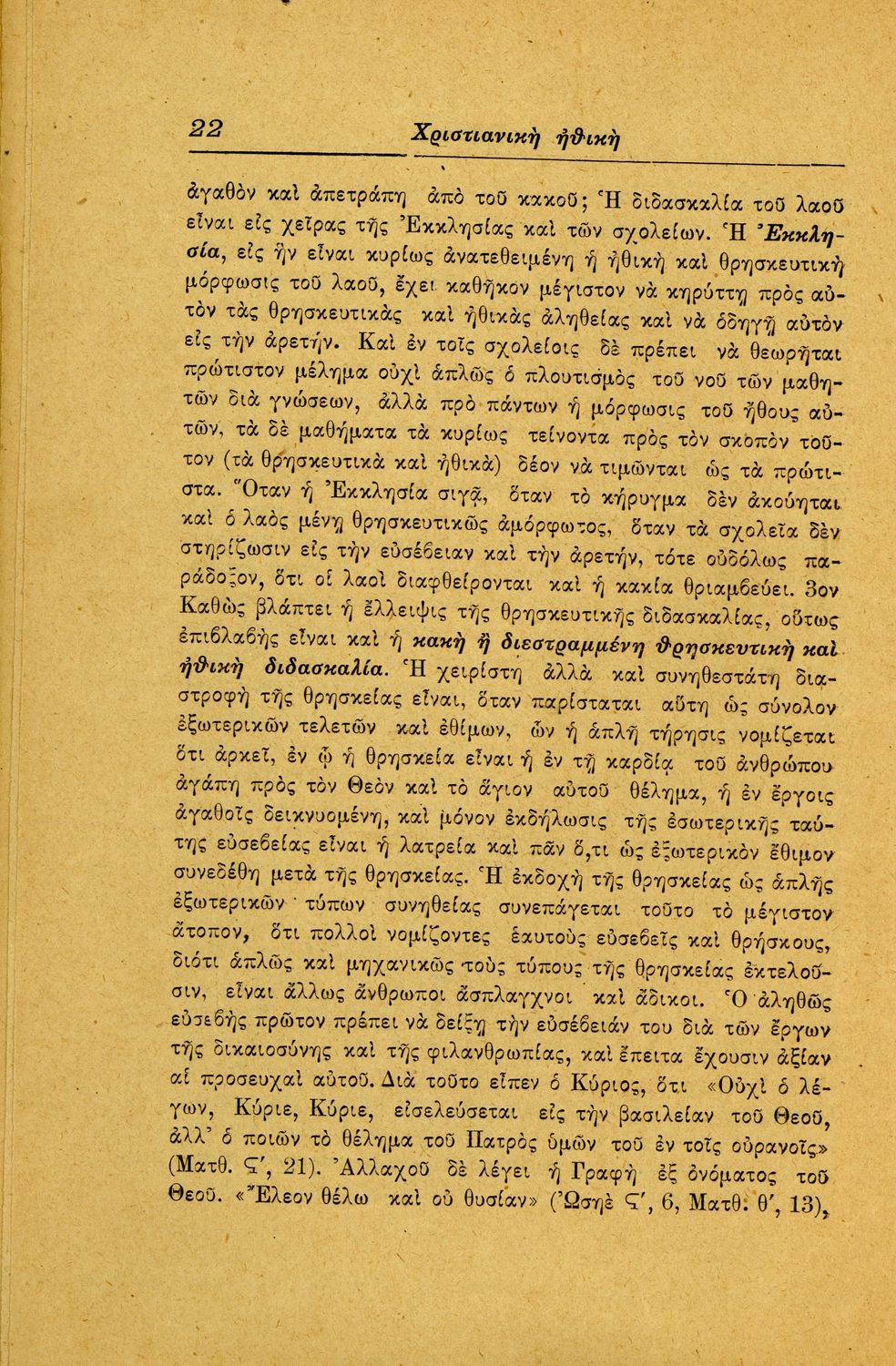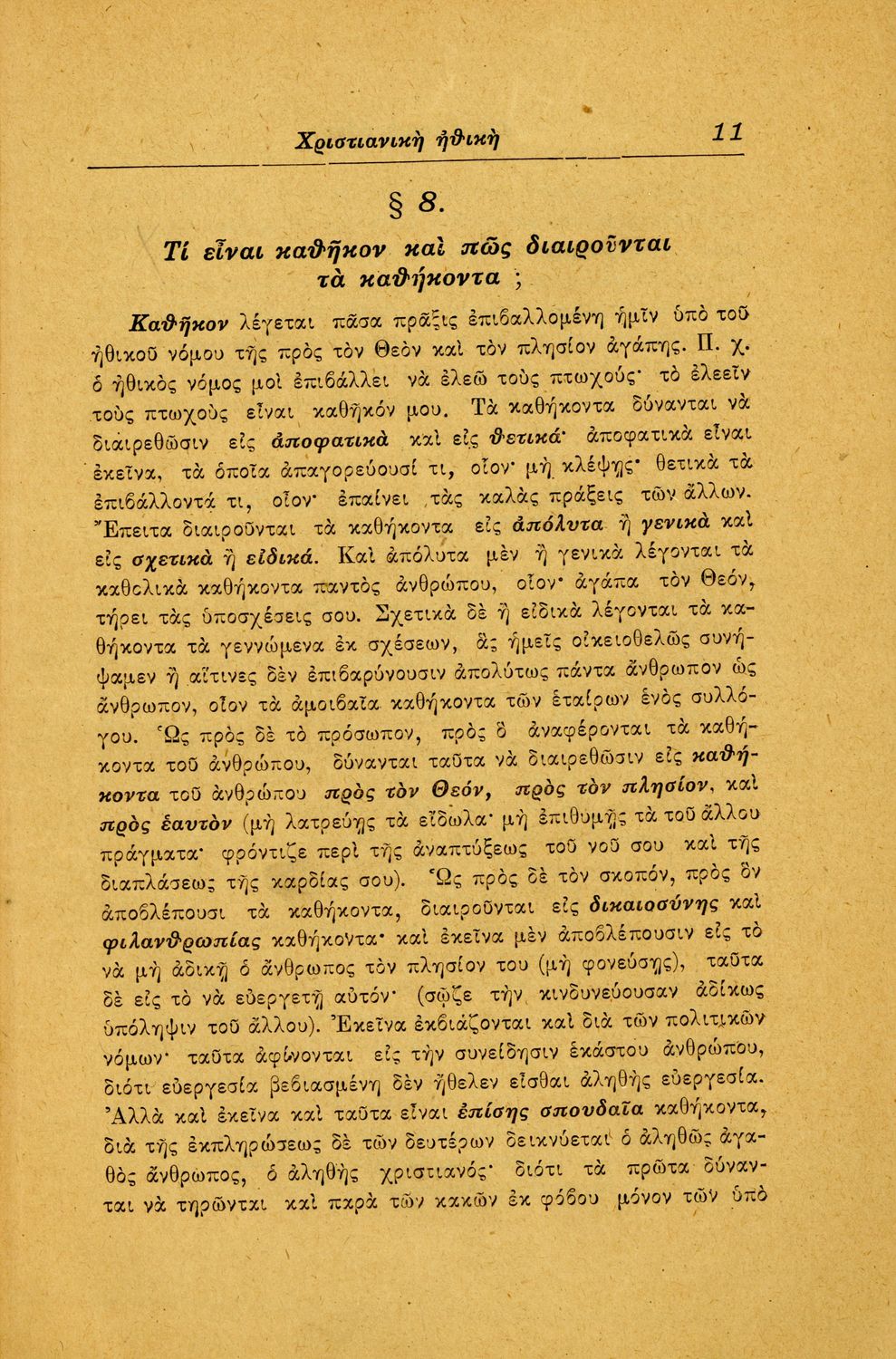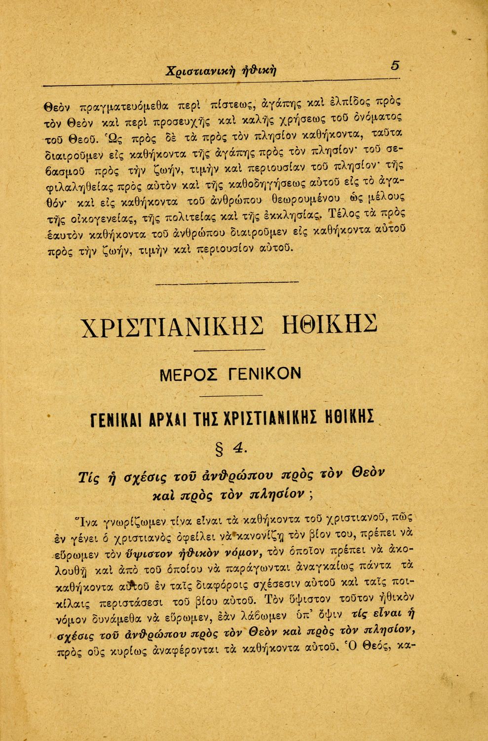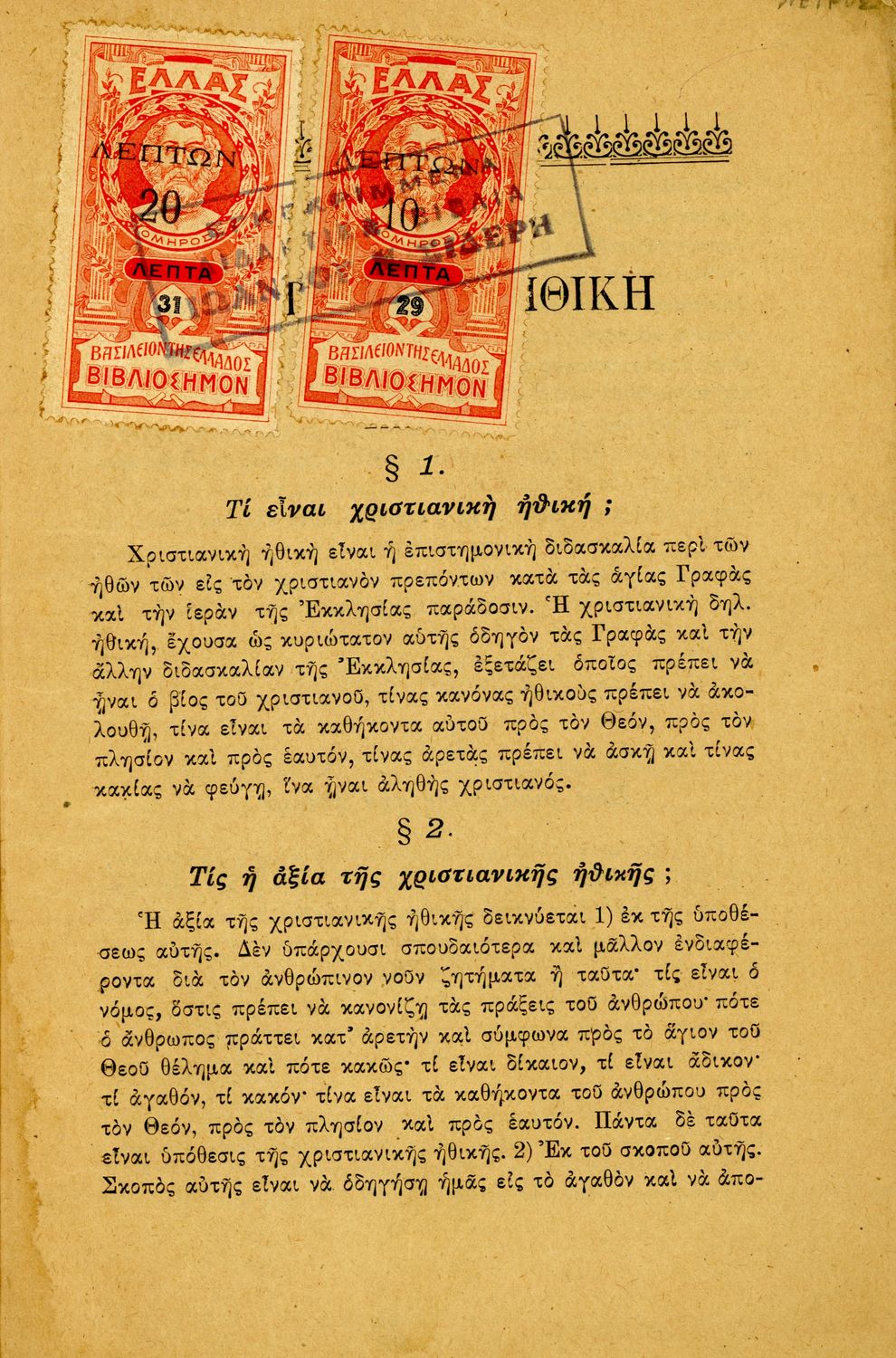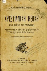 Βαθμίδα εκπαίδευσης: Δευτεροβάθμια Τάξη: Γυμνάσιο Μάθημα: Θρησκευτικά Γλώσσα: Καθαρεύουσα Παρουσίαση περιεχομένου: Σχολικό εγχειρίδιο Θρησκευτικών για τα Γυμνάσια που εστιάζει στη χριστιανική ηθική και αναλύει τα καθήκοντα του ανθρώπου προς τον Θεό, τους άλλους ανθρώπους και τον εαυτό του. |