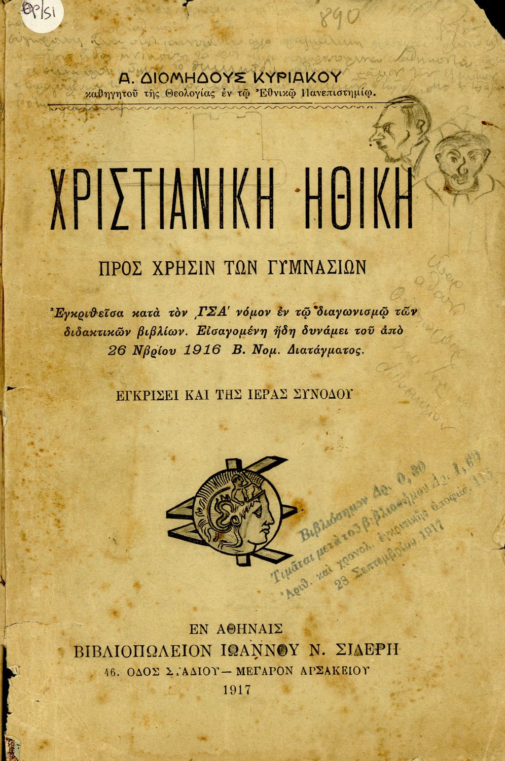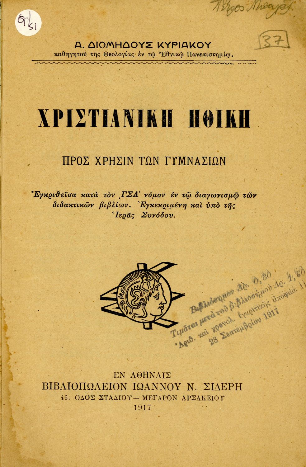 Κωδικός αναγνώρισης: 04-00037 Τίτλος: Χριστιανική ηθική προς χρήσιν των Γυμνασίων Συγγραφέας: Α. Διομήδης Κυριακός Μέγεθος και υπόστρωμα: Σχολικό εγχειρίδιο, 20εκ., μαλακό εξώφυλλο, 82 σελίδες. Χάρτης (έγχρωμος). |