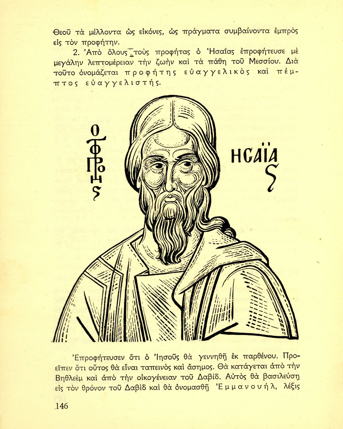 Σχολικό εγχειρίδιο Θρησκευτικών που συνιστά μία εξιστόρηση της Παλαιάς Διαθήκης από τη δημιουργία του κόσμου ως τους Προφήτες. Φέρει το σύμβολο της δικτατορίας.