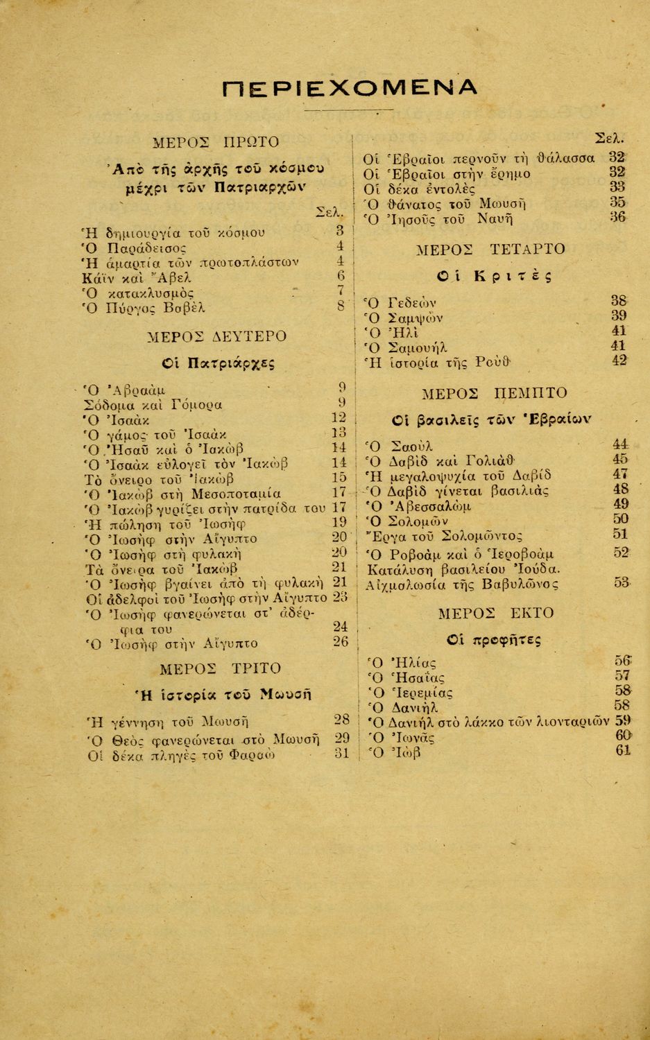 Σχολικό εγχειρίδιο Θρησκευτικών [Γ΄ Δημοτικού] που συνιστά μία εξιστόρηση της Παλαιάς Διαθήκης από τη δημιουργία του κόσμου ως τους Προφήτες.