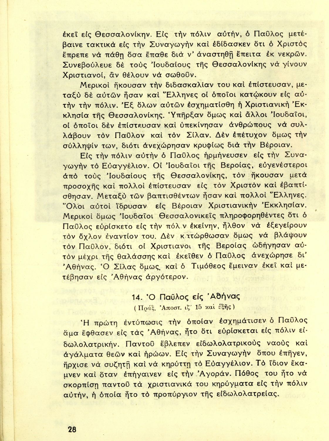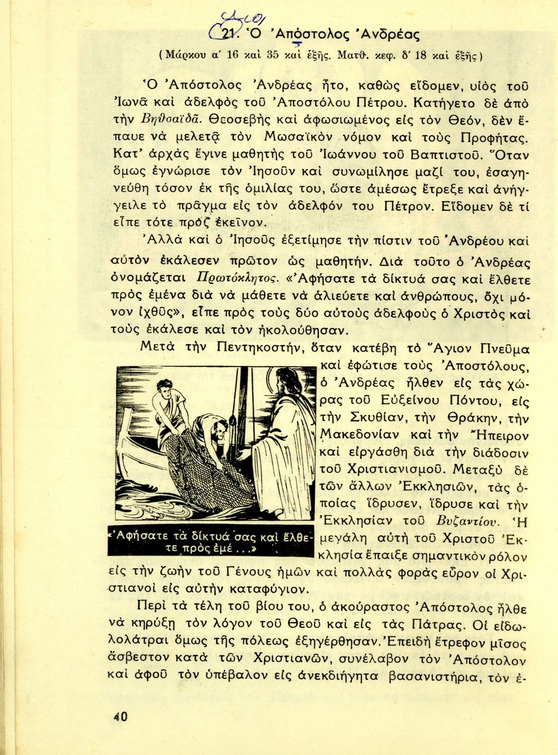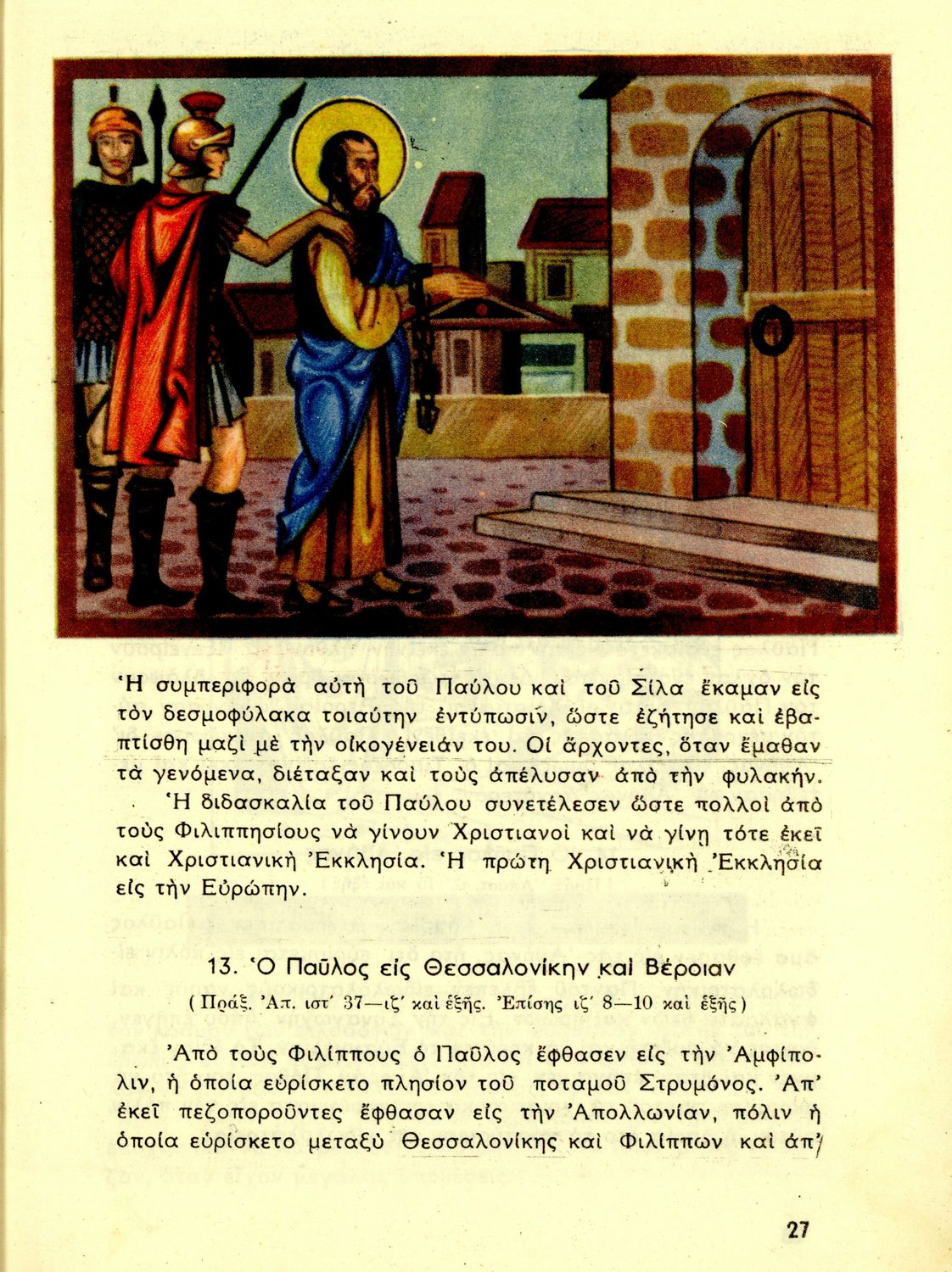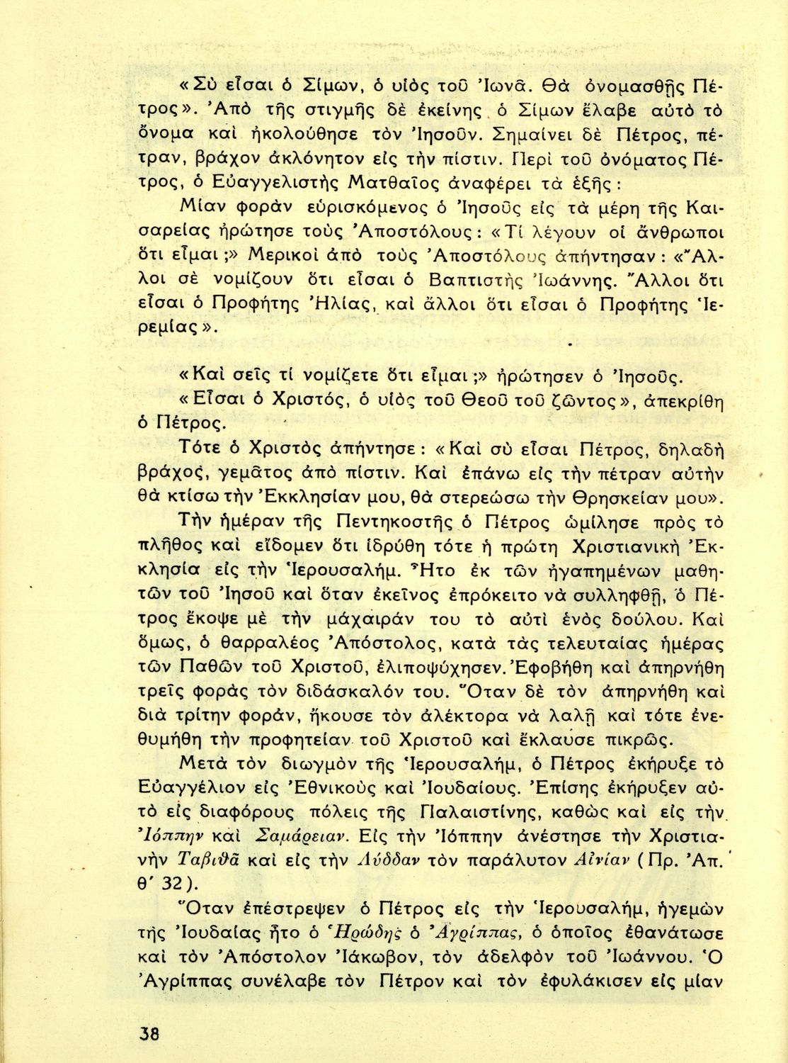 Βαθμίδα εκπαίδευσης: Πρωτοβάθμια Τάξη: Ε' Δημοτικού Μάθημα: Θρησκευτικά Γλώσσα: Απλή καθαρεύουσα Παρουσίαση περιεχομένου: Μαθητικό βοήθημα Θρησκευτικών Ε΄ Δημοτικού που αποτελεί μια ιστορική επισκόπηση της Ορθόδοξης Εκκλησίας από την ομιλία του Πέτρου και την ίδρυση της πρώτης χριστιανικής Εκκλησίας μέχρι την ίδρυση της Εκκλησίας της Ελλάδας. |